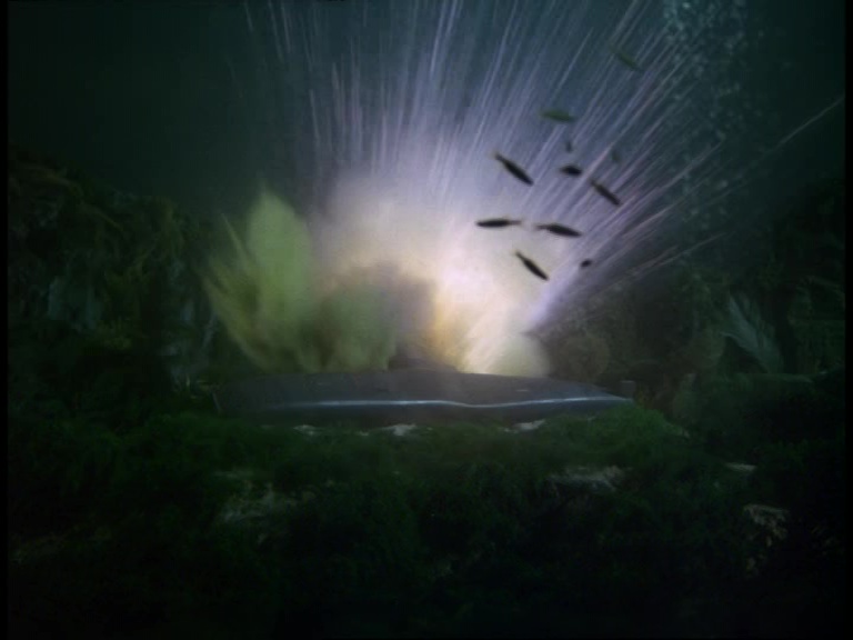 Spectacular as these effects shots are, they don’t necessarily match the “holocaust of flame, black smoke and gushing, spouting water” described in the script. I’d also argue that they’re not necessarily up to the standard of cinematic devastation seen in the likes of Thunderbirds. The camerawork here compared to, say, Atlantic Inferno is very distant and pedestrian. Almost every shot of these tanks looks exactly the same. Their sense of scale isn’t really expressed because every angle is taken from the edge of the water tank far away from the action. In close-up they look much more impressive, but those moments don’t happen often. None of that is helped of course, by the fact we’ve already seen a very similar sequence just a few minutes ago. I’m loathed to suggest that the effects team might have been a bit bored of blowing up these silver balls over and over again, but I do start to get that feeling when watching this unfold.