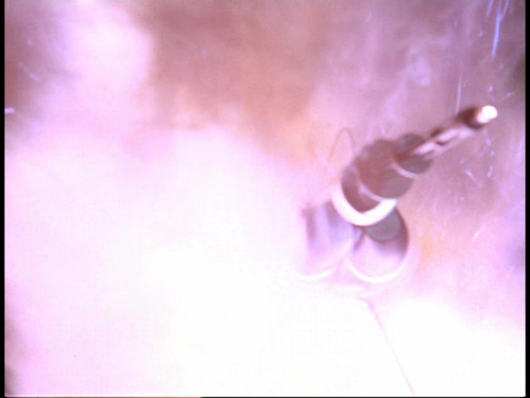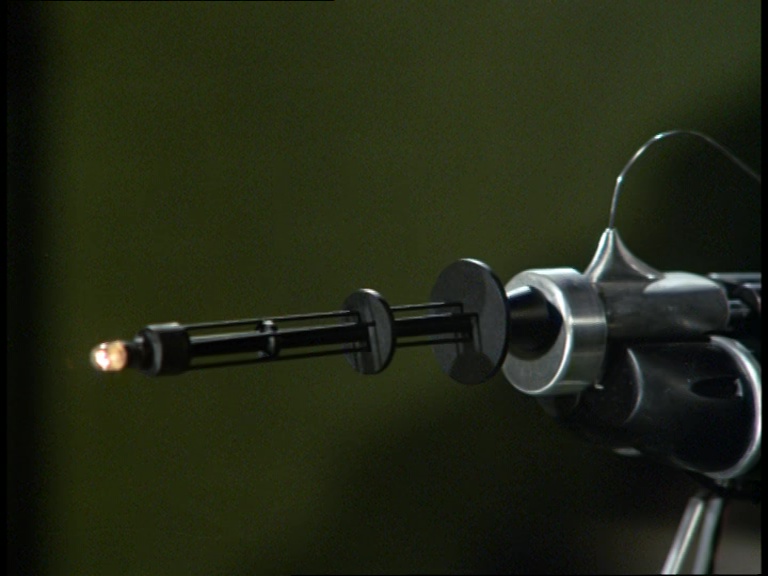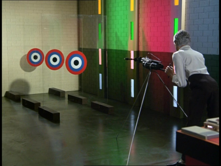 In his laboratory, Professor Soames has got some of his toys out to play with. The device which, I can’t state more clearly, is just a Mysteron gun painted black, is mounted in front of three sheets of glass. As the gun lights up and whistles at us, a hole gets punctured cleanly through two of the three panes. It happens so quickly and cleanly that I can only assume charges were positioned on the back of the glass by the effects team in pre-cut areas.