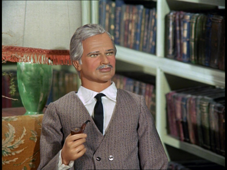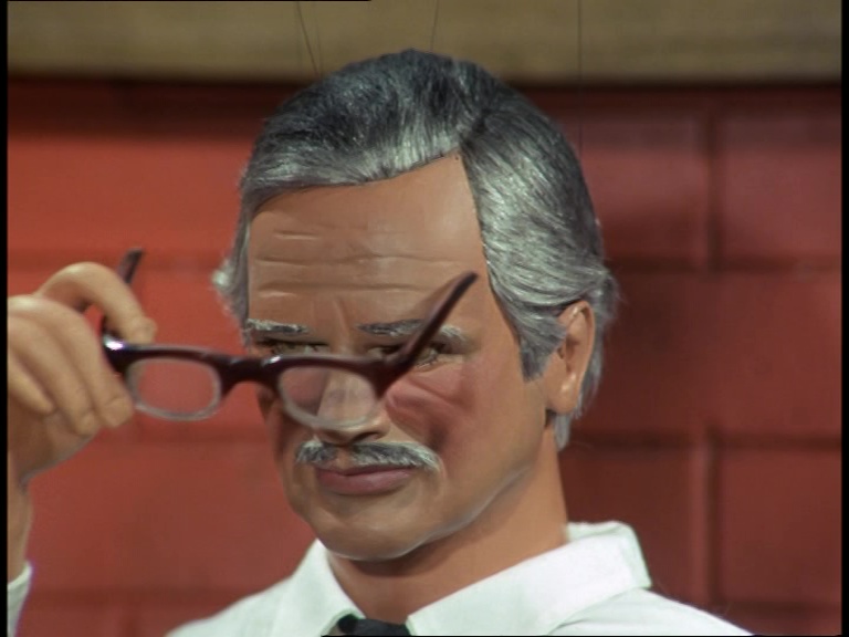 This is her father. He’s more of a grumpy old posh bloke… the type of character we see quite a lot in The Secret Service. He’s got a Mysteron gun painted black sitting on his desk. Interestingly, the team decided that instead of drawing upon their existing cast of revamp puppets that look like older gentlemen, they adapted the often-seen Captain Brown revamp by rewigging him and adding a tash and a few frown lines to make him look older. They obviously liked using that puppet a heck of a lot. He seemed to get all the best roles.