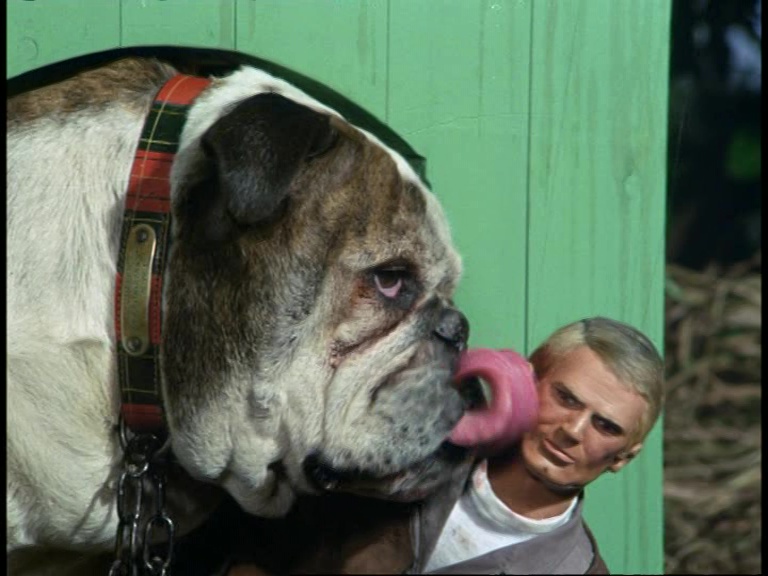 While Slater briefs the Professor and reminds us all over again that they plan to use the sonic rifle to blow up the experimental aircraft without a trace of sabotage, Matthew and Rex reach a happy compromise. Honestly, I don’t particularly mind this shot of Matthew – a puppet – interacting with a real dog. It’s cute and quirky. Real animals have been used in Supermarionation productions previously, from mice posing as rats, crocodiles posing as alligators, and snakes posing as, well, snakes. Having a real dog stand alongside a puppet is considerably less weird than the alternative… creating a puppet of a giant dog. Neither approach is convincing, but the real dog is much less likely to give me nightmares.