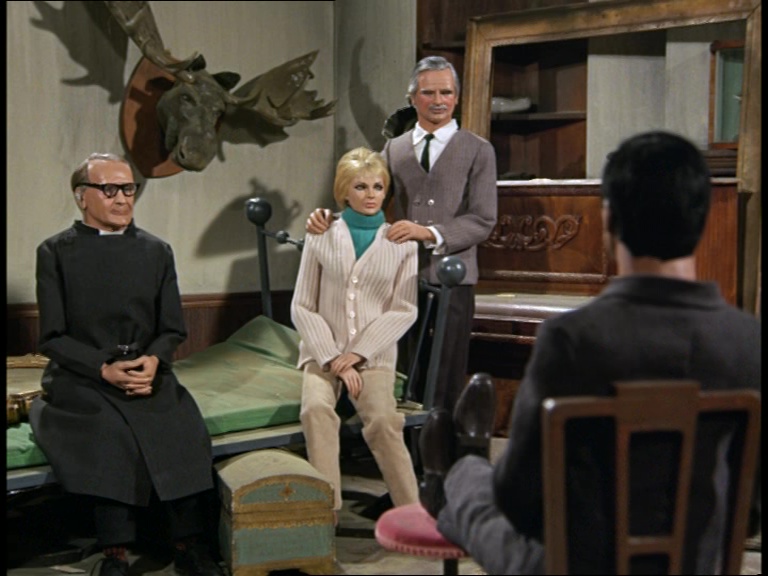There’s a reasonable level of concern in the upstairs room which I actually find very competent and sensible. Sometimes in other episodes the baddies immediately dismiss Unwin as a threat just because he’s a priest and it always feels unnecessarily reckless. Also, there’s a flippin moose’s head on the wall of this old bedroom. But there’s also a piano which I believe is the same prop which dates all the way back to Four Feather Falls, made frequent appearances in X20’s front room during Stingray, and is still around to this day.