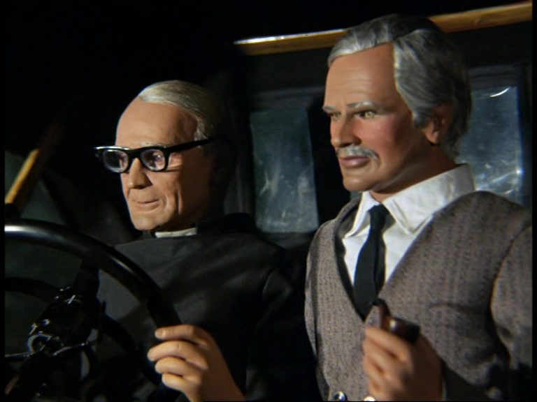 So with Matthew safely stashed inside the house, the puppet villains watch as the flesh and blood Stanley Unwin leaves the house doing his “silly old priest” acting before climbing into Gabriel. It has to be mentioned that quite a lot of this script is following the beats of the earlier episodes, The Feathered Spies and To Catch A Spy. I guess Unwin just has a tried and tested way of planting Matthew in sensitive locations so he’s going to stick to it.