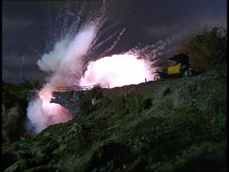 You can tell the puppet team were trying ever so hard to match the location footage because even Slater’s left leg is twisted in the same position as the live-action counterpart. Unfortunately, the lighting doesn’t match and for some reason the sprinkling of early-autumn leaves on the road have been replaced with tons of sawdust.