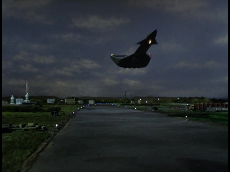These nighttime shots of the experimental aircraft (only ever refered to on screen as “010”) look absolutely gorgeous. The navigation lights are a great detail and really go a long way to sell it. Also, we’re finally filming the models at exciting close-up angles so they actually look like big, imposing aircraft instead of toys. You might recognise the airfield control tower from last week’s episode, Errand of Mercy.