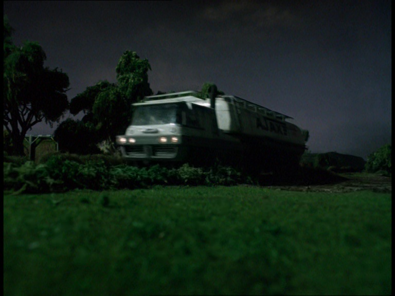 Over on the special effects stage, a caravan is being stalked by a wild Gabriel. At this stage in the series if we cut to a model shot, it’s pretty obvious that something will be getting blown up at some point, otherwise we’d be filming it out on location.