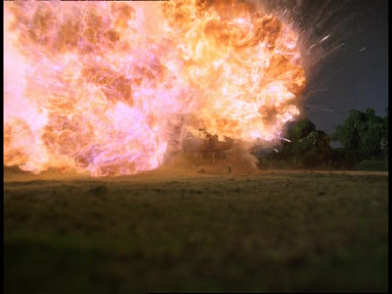 Time for a brief interlude from the special effects department now as we watch Blake blow up the Ajax Petroleum tanker. Of course, they go all out and the fireball looks spectacular. Again, there’s a slight difference between the finished episode and the script in that the explosion was originally supposed to be triggered by the truck crossing a wire stretching over the road. Instead, we see Blake hiding in some bushes and pressing a plunger which somehow detonates the cargo on the truck itself. Whilst this is probably more effective on-screen than the scripted plan, I can’t help but wonder how Blake actually managed to plant an explosive on the truck. Did he somehow intercept it earlier? Or am I just thinking about this too hard? Should I just enjoy the big shooty bang-bang? Yeah, just enjoy the warm orange glow of nonsense explosions…