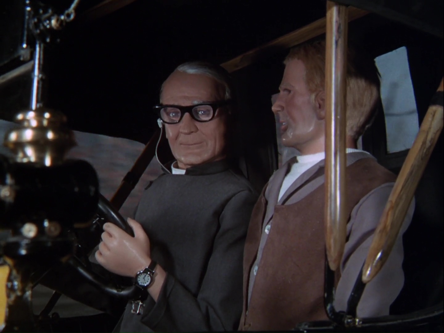 These subject matters presented the production team with some unusual challenges to get their teeth into. A Model T driving across a minefield. A gang of evil vicars trying to blow up a submarine. An exploding teddy bear. The unconventional became an inherent part of the series and gave this odd collection of characters room to be a bit silly at times without compromising the drama. And because all of this started to gel and flow more easily, I could sense the team at Century 21 were starting to rather love this charming little show. Suddenly, the ingenuity and hard work of the early pioneering days of Supermarionation started to appear on-screen again. Spectacular stunts and special effects transformed from minor plot incidents to big set pieces. Models and puppet characters became more richly detailed and filmed with pride and confidence rather than at a cold, remote distance. The love for the work is there in pretty much every frame of More Haste Less Speed.