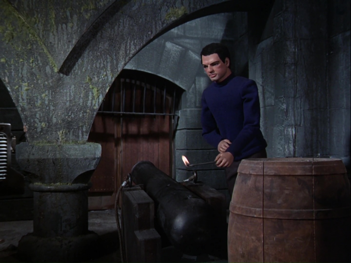 This dungeon set is likely the same one seen as the church crypt in the Joe 90 episode, The Unorthodox Shepherd. The printing press is also the same prop that was seen in that episode but heavily modified to appear more old-fashioned.