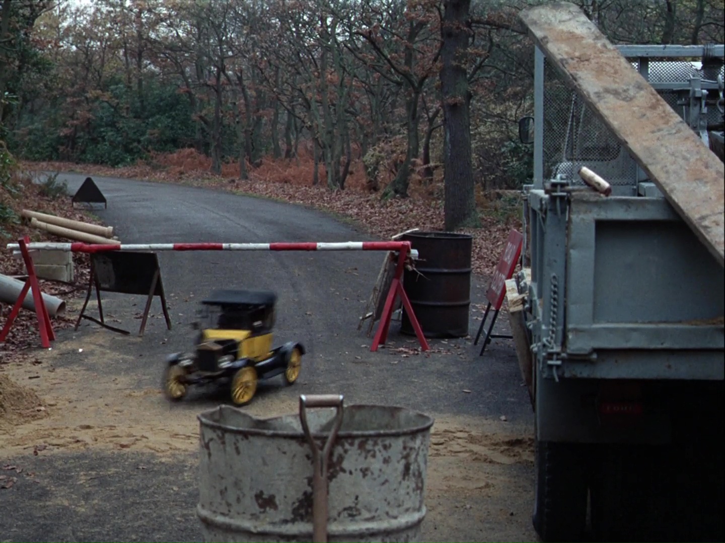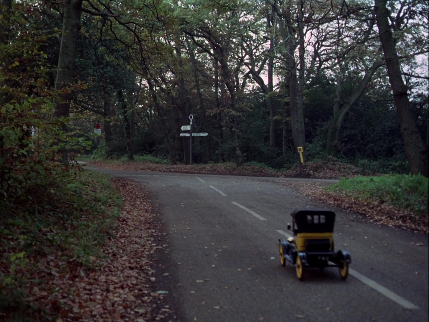 Unwin and Matthew approach a road sign informing them they are 20 miles from Eastford. Of course, that’s a fake road sign erected by the production team because there’s no such place in England and because the real road sign shown in the long shot doesn’t match the one shown in the close-up at all.