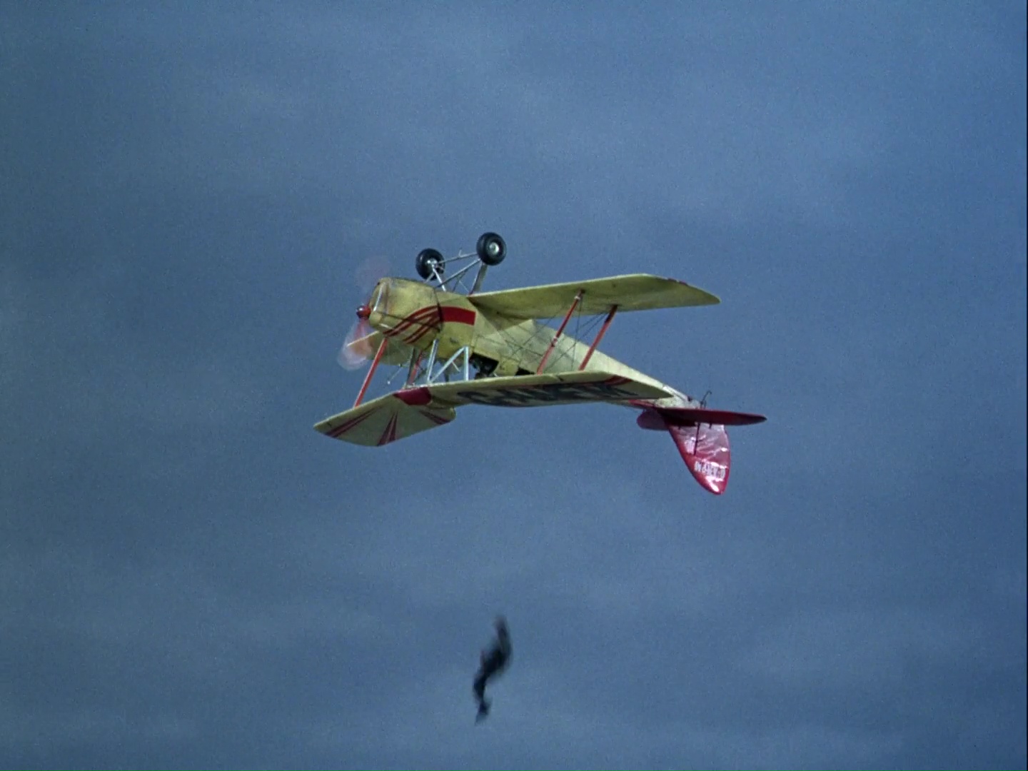 As the plane flips over, take a close look at the top left corner of the frame. A face of one of the crew has popped up in the shot, clear as day. I hope he gets royalties. This shatters the illusion that the plane is spinning since I doubt any member of the Century 21 team could defy the laws of gravity. The camera is presumably the thing doing all the tilting.