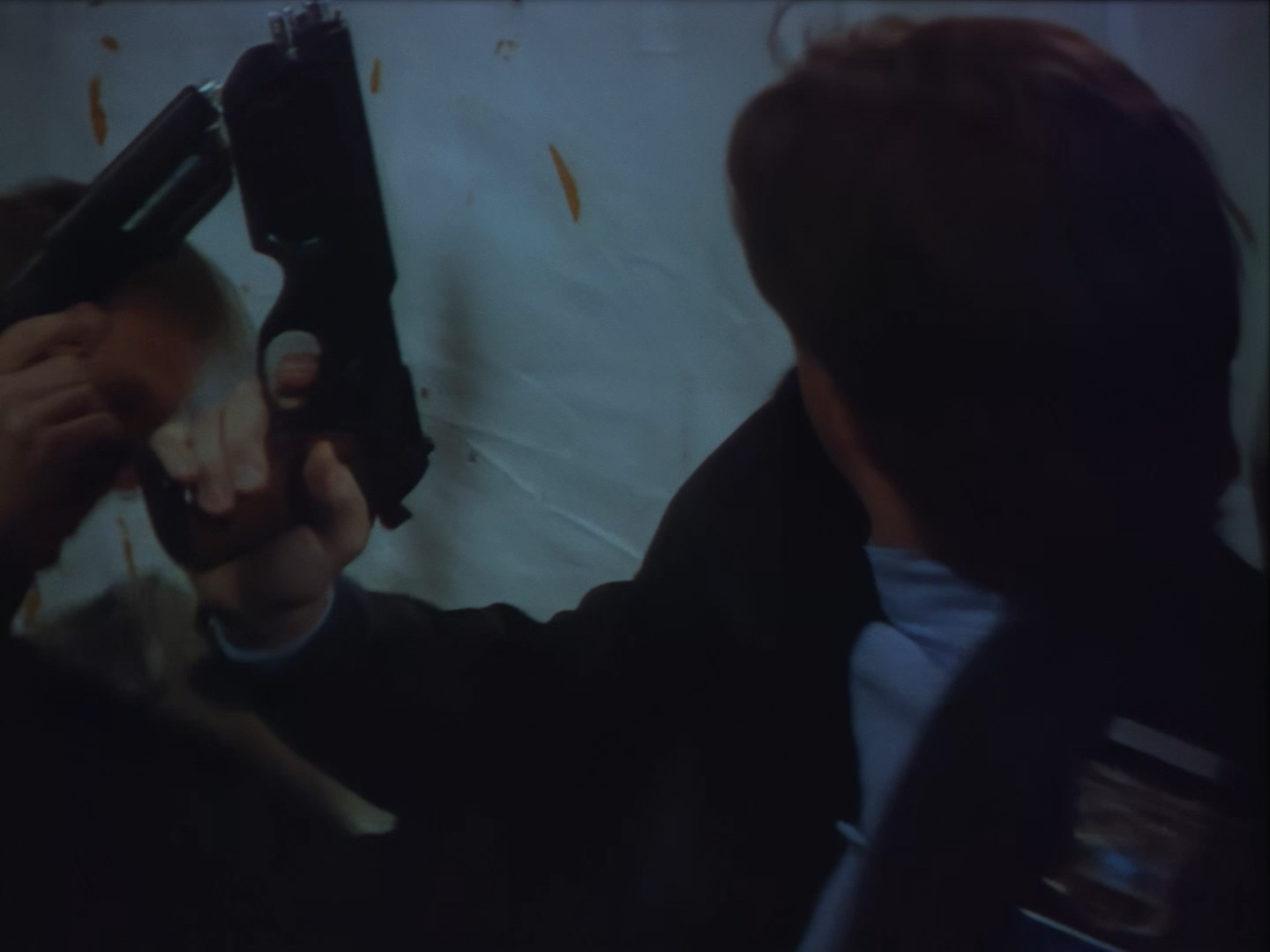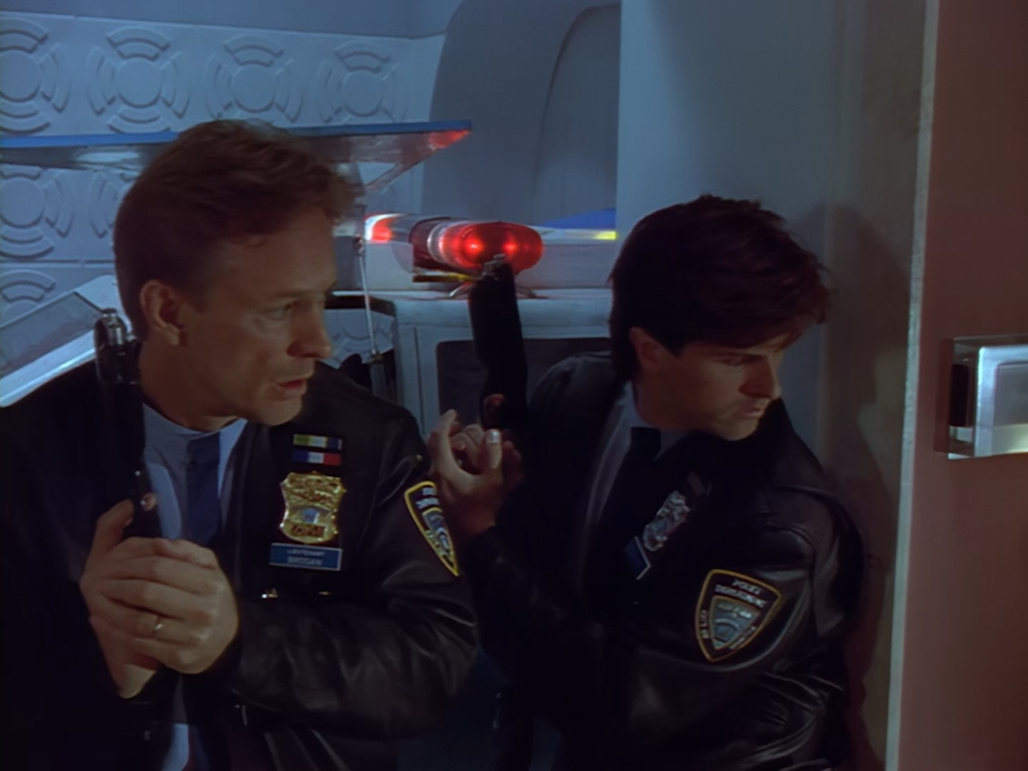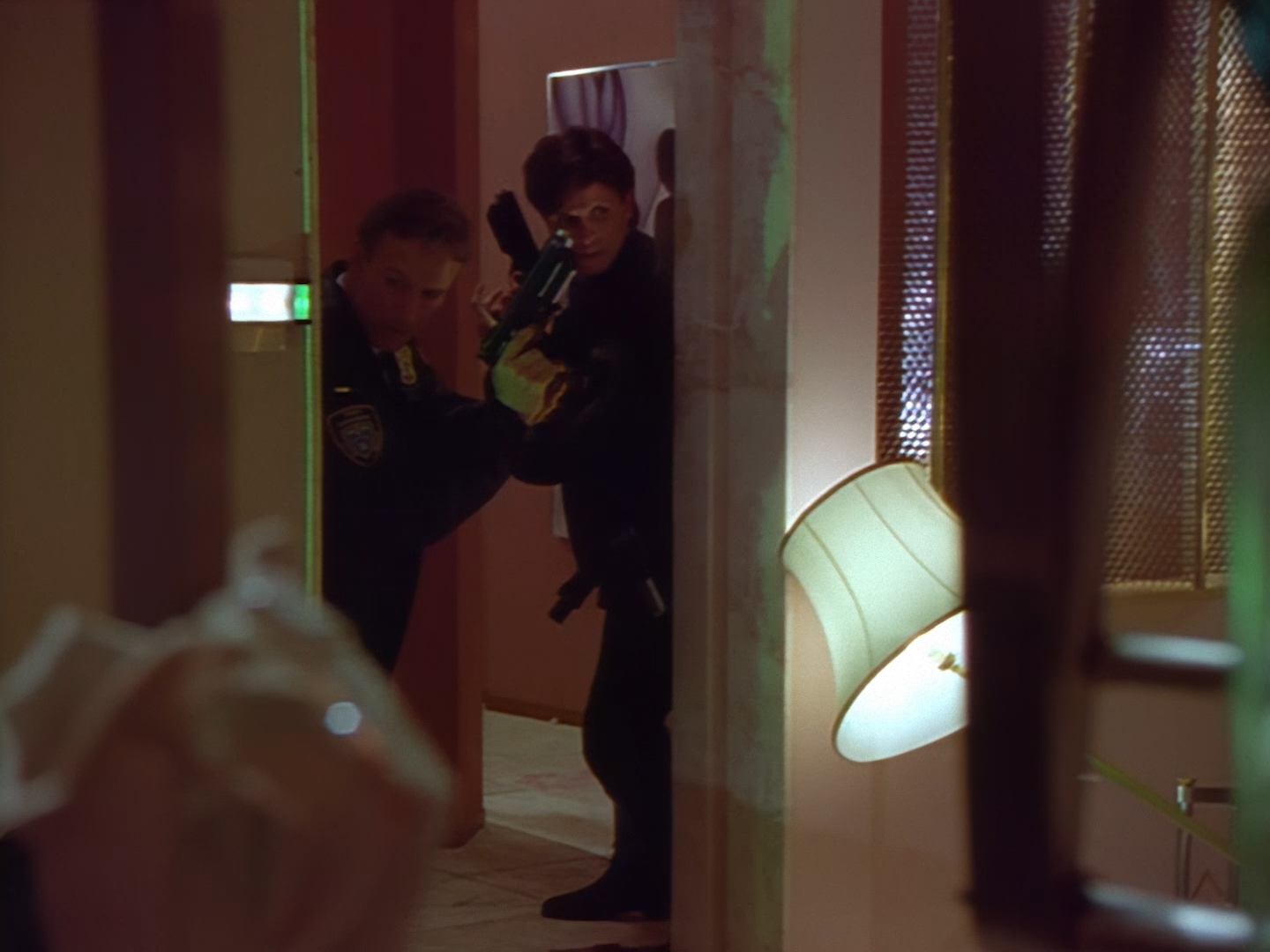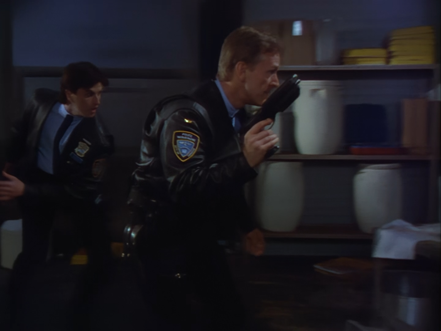 Brogan rushes in, gun drawn, ready to save the day. This is an alternative take of the shot we see of Brogan from the opening titles.