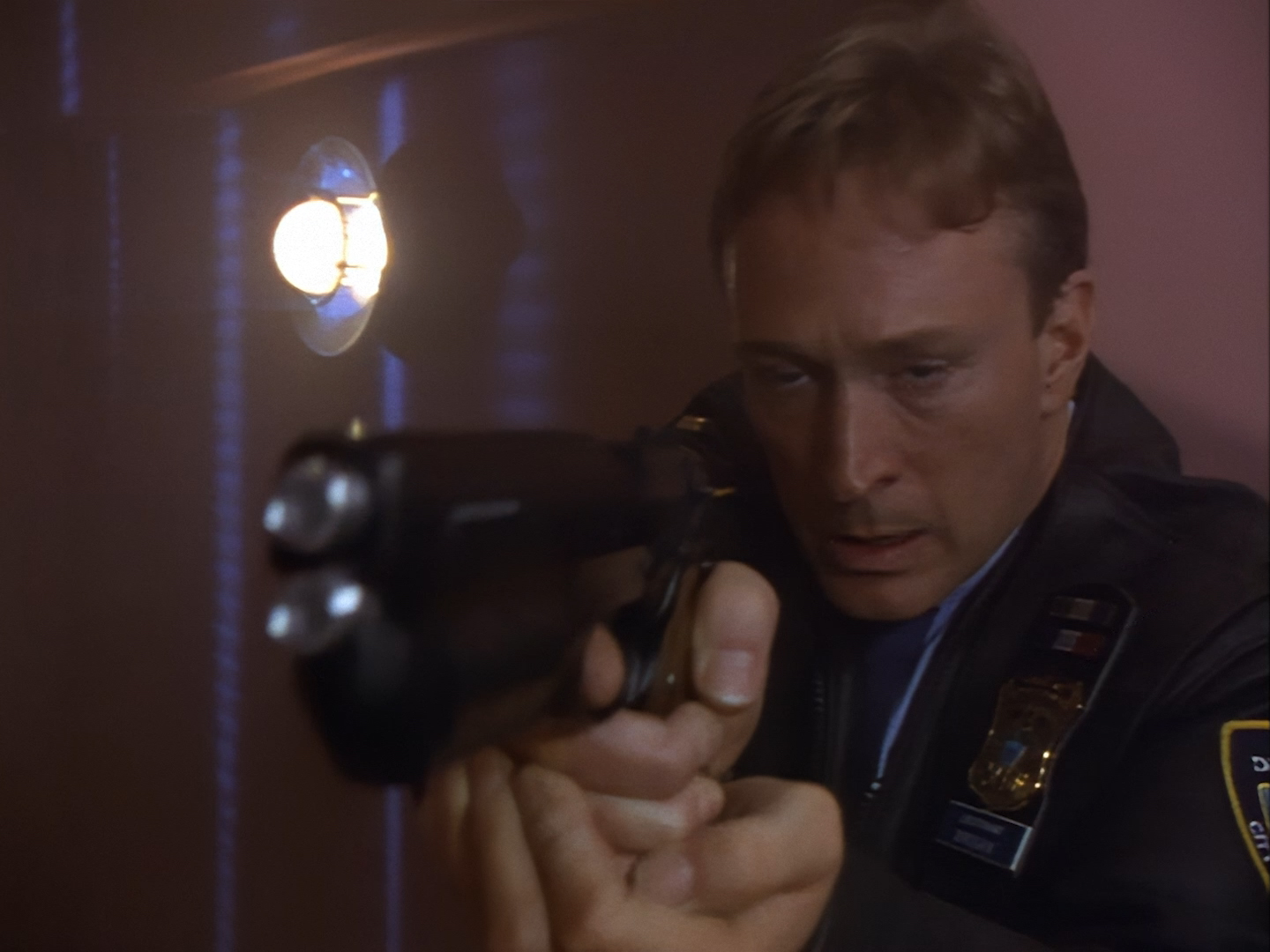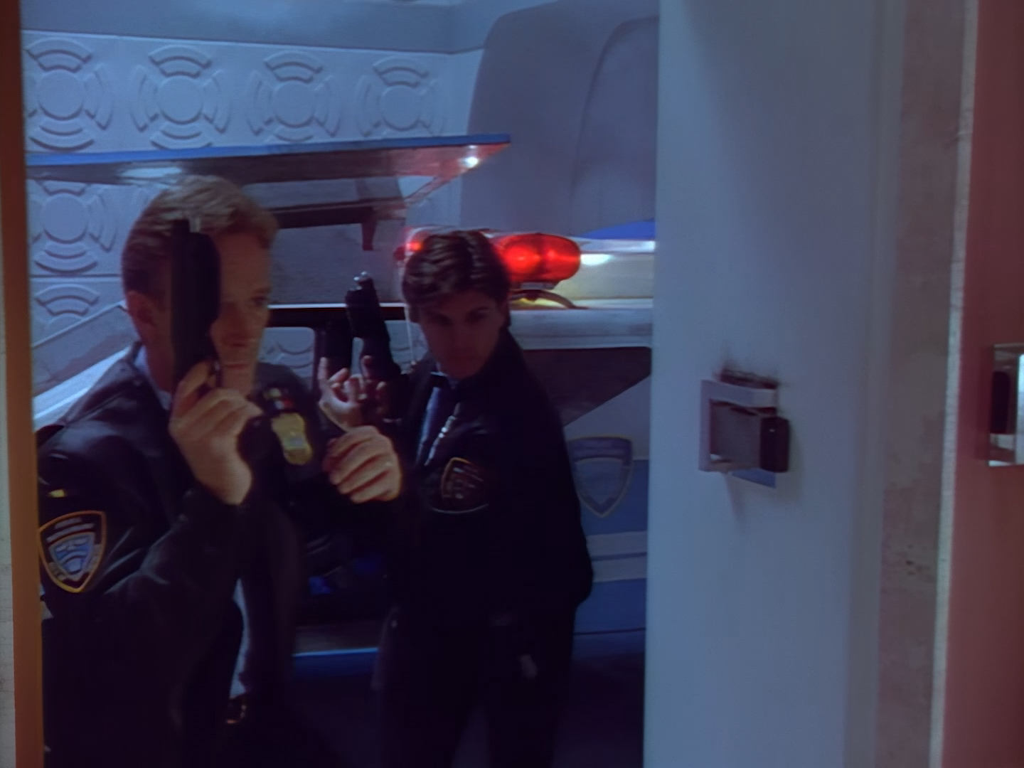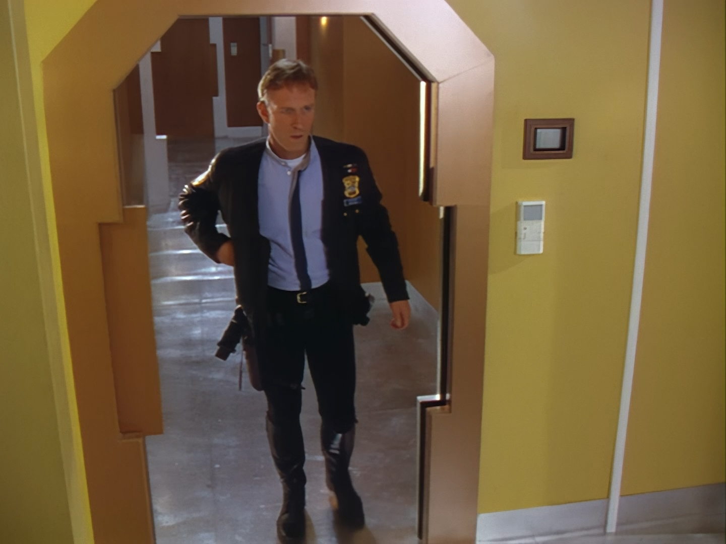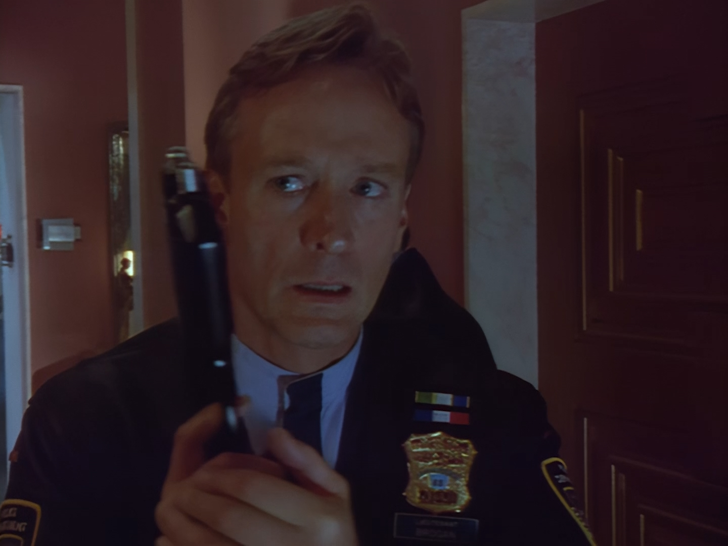 Brogan rushes in, gun drawn, ready to save the day. This is an alternative take of the shot we see of Brogan from the opening titles.