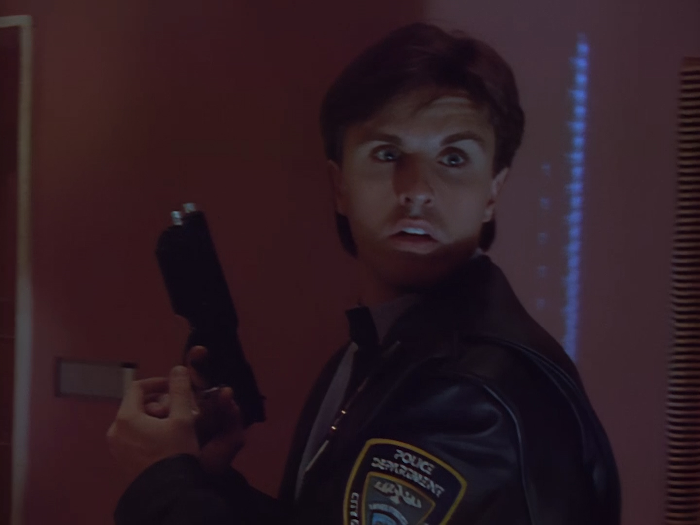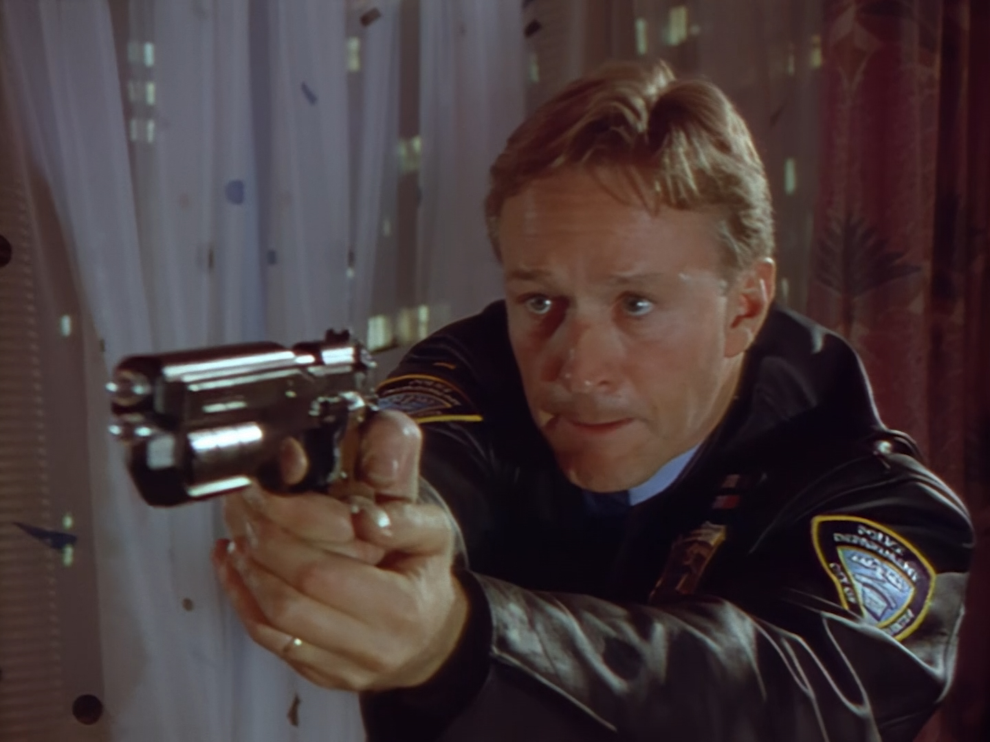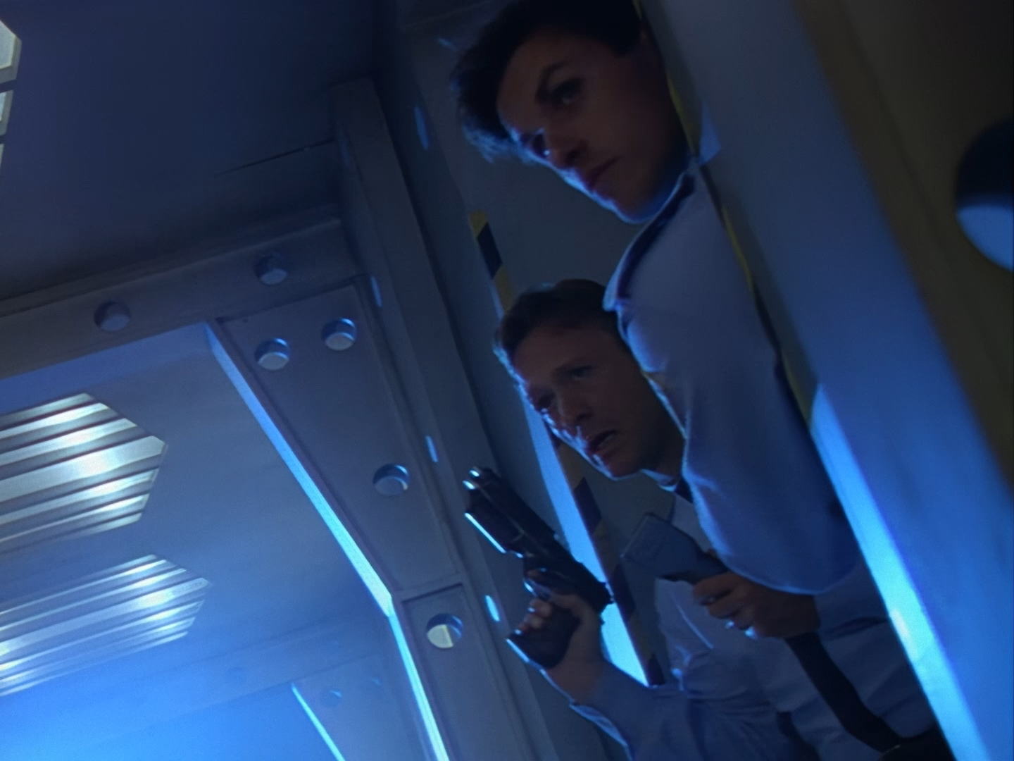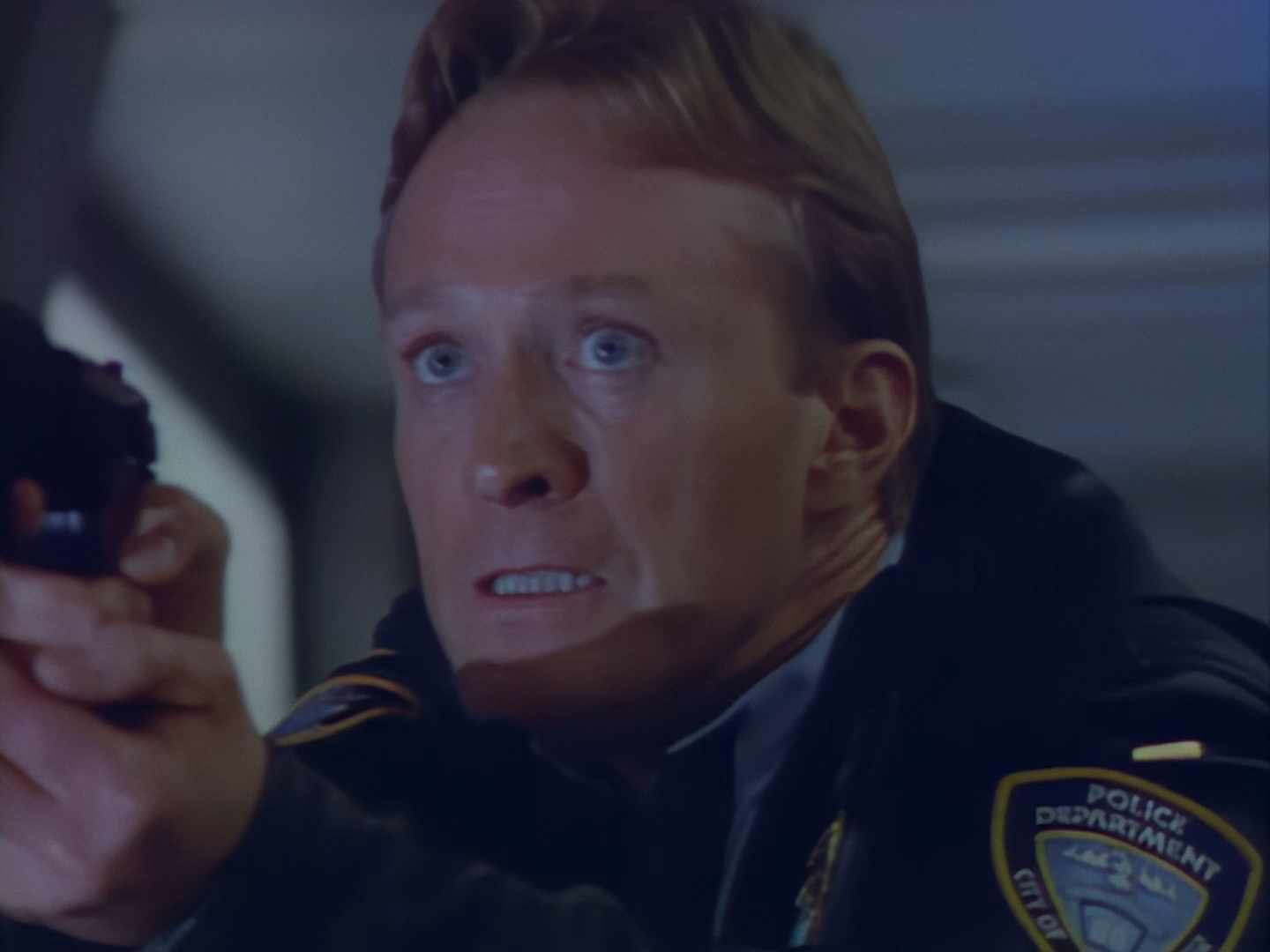 Brogan rushes in, gun drawn, ready to save the day. This is an alternative take of the shot we see of Brogan from the opening titles.
