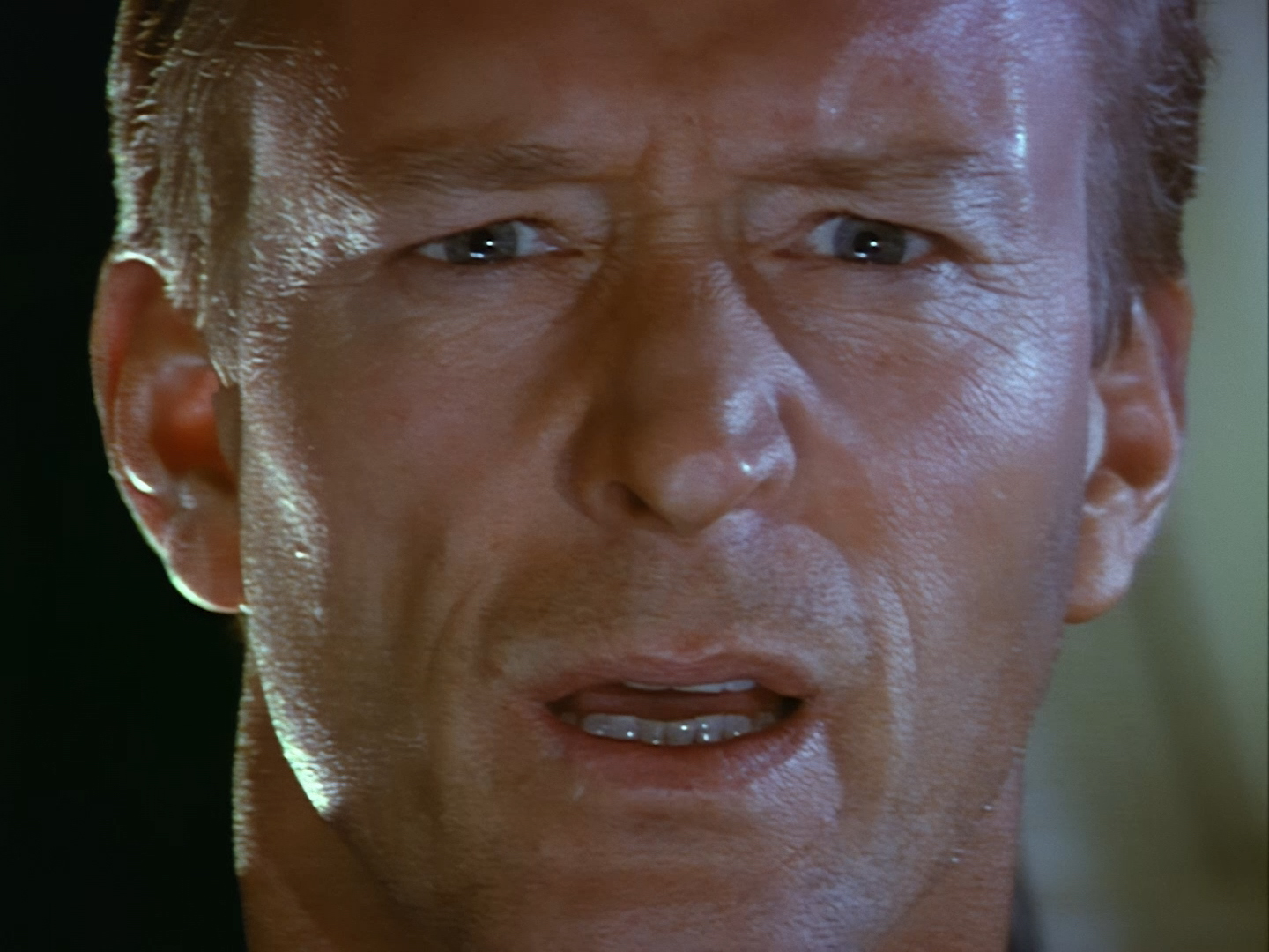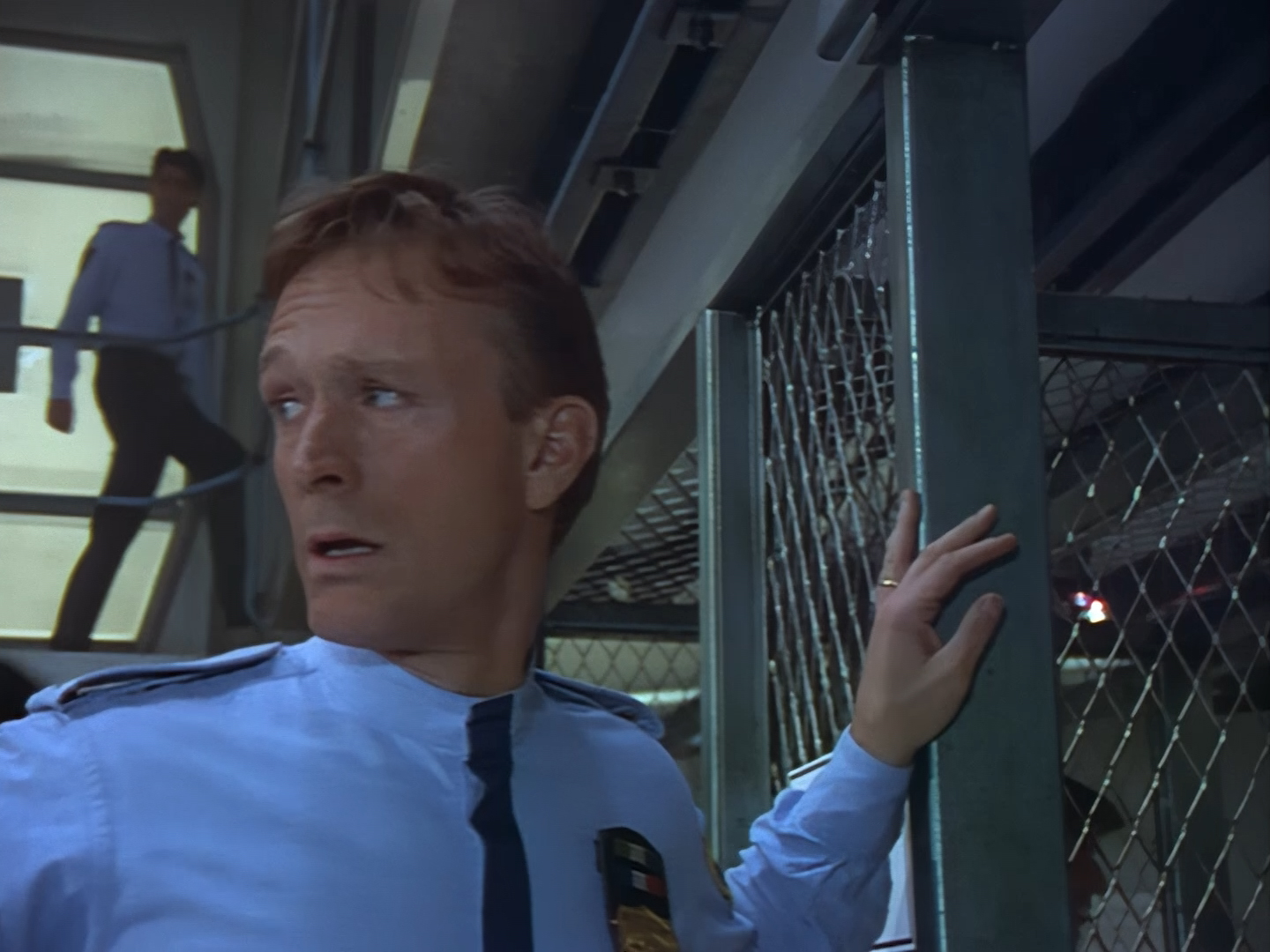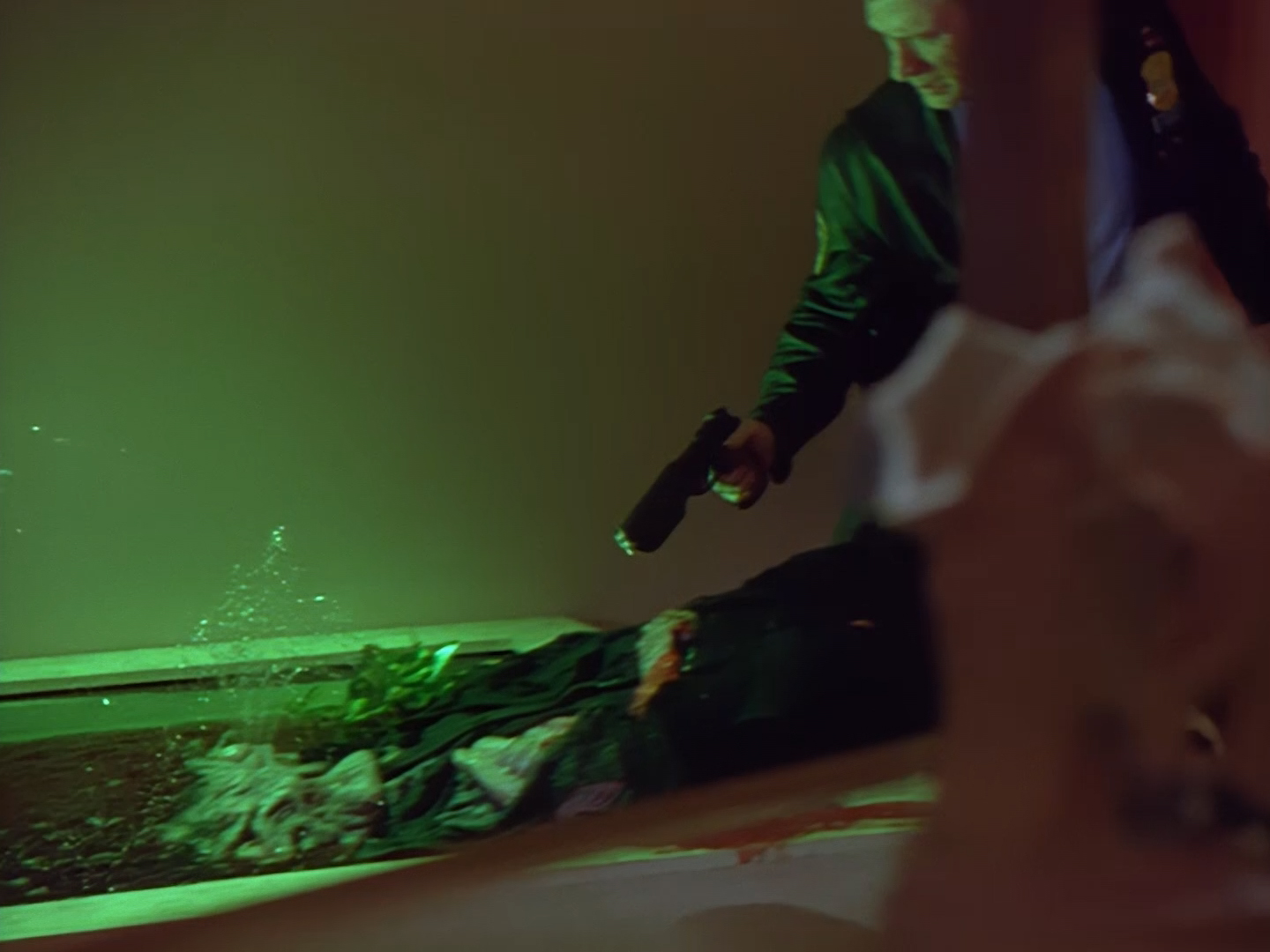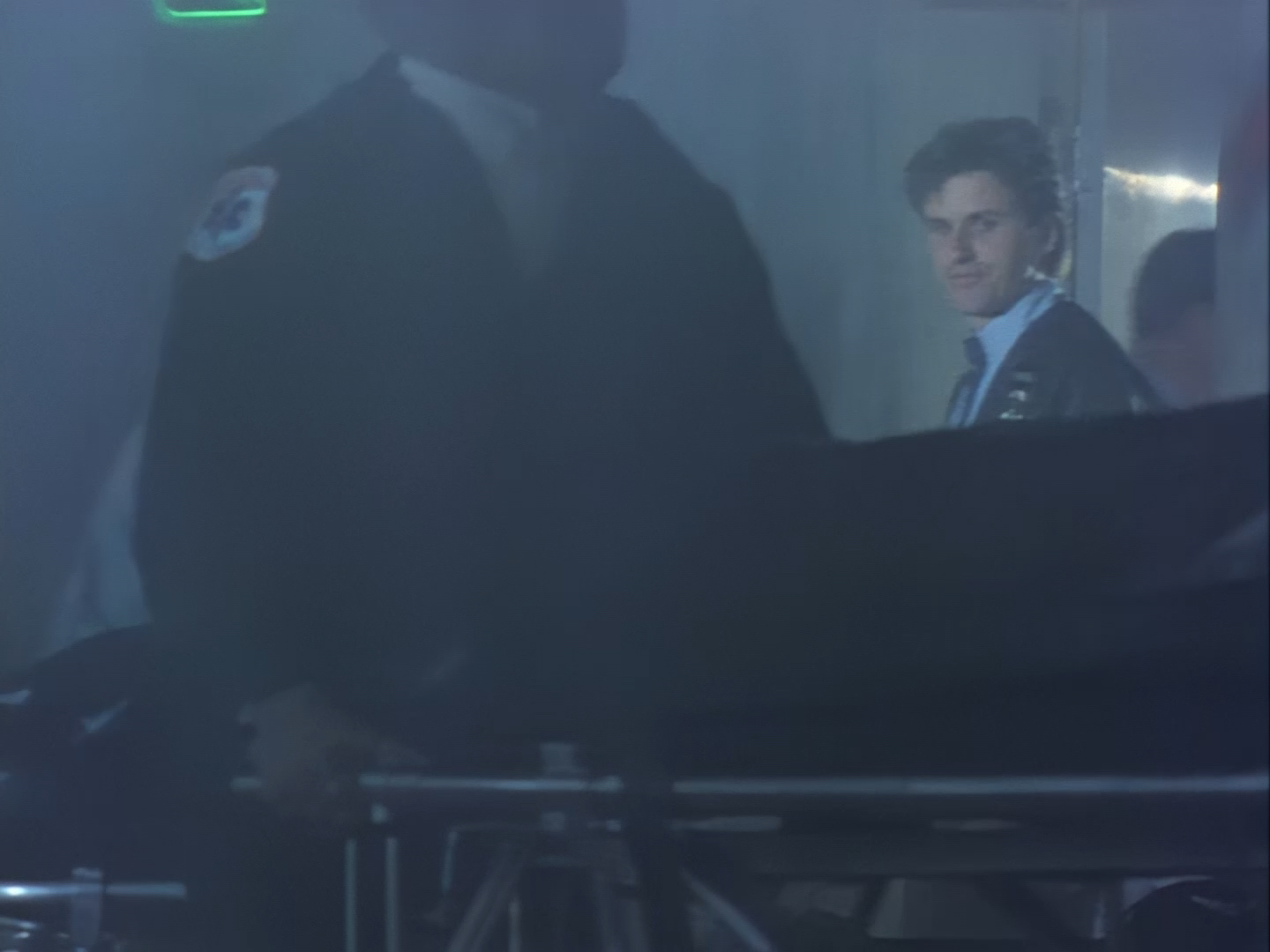 Brogan rushes in, gun drawn, ready to save the day. This is an alternative take of the shot we see of Brogan from the opening titles.