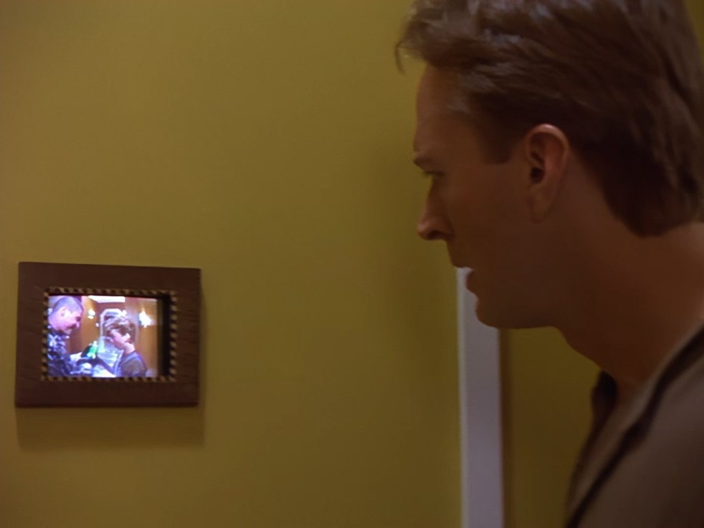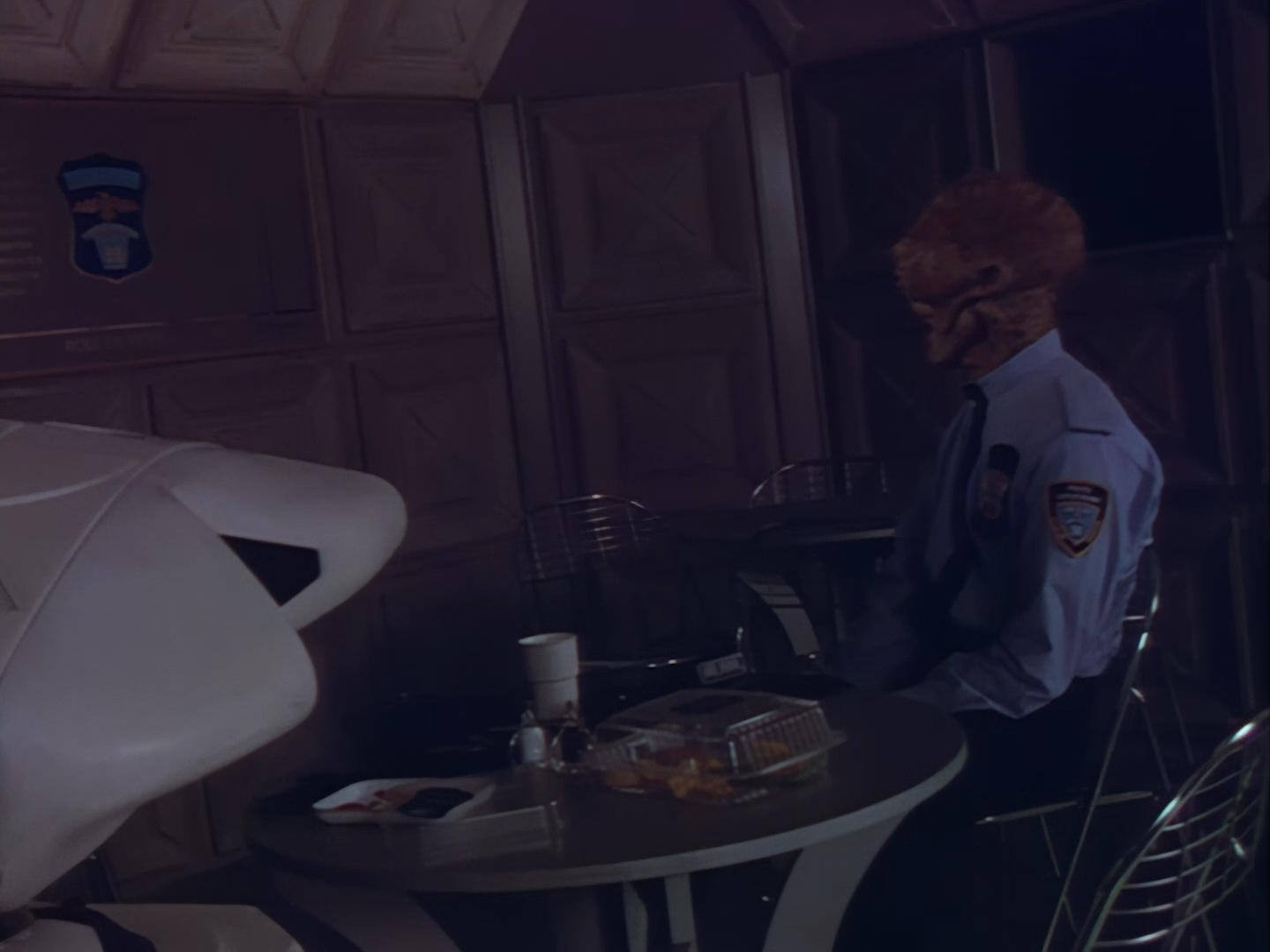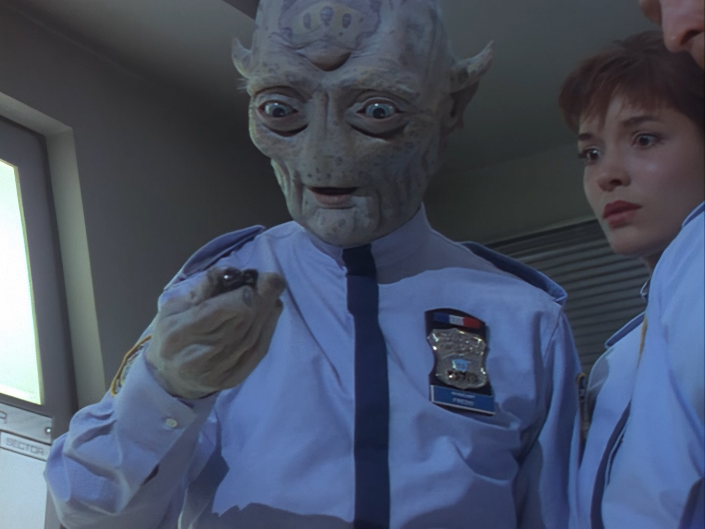 Back in the break room, Orrin and Slomo are using the best AI-upscaling technology that the near-future apparently has to offer. Of course, the “Enhance Button” trope is all too common in police procedurals, so at least Space Precinct can offer up a reasonably sci-fi explanation for it in the form of Slomo’s capabilities. And by thunder I think I recognise that hideously over-sized pendant from somewhere…