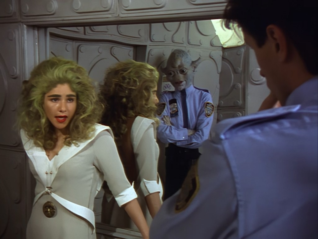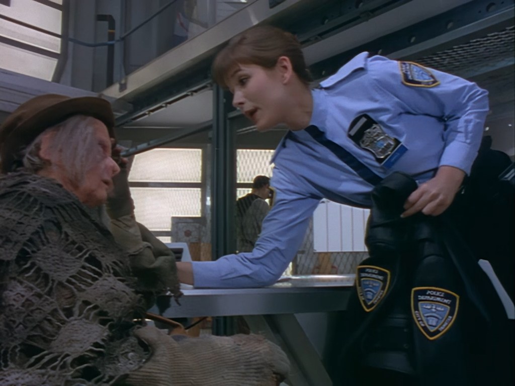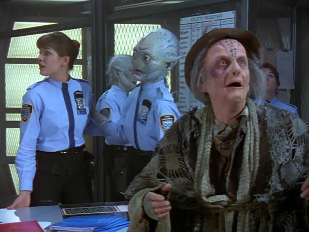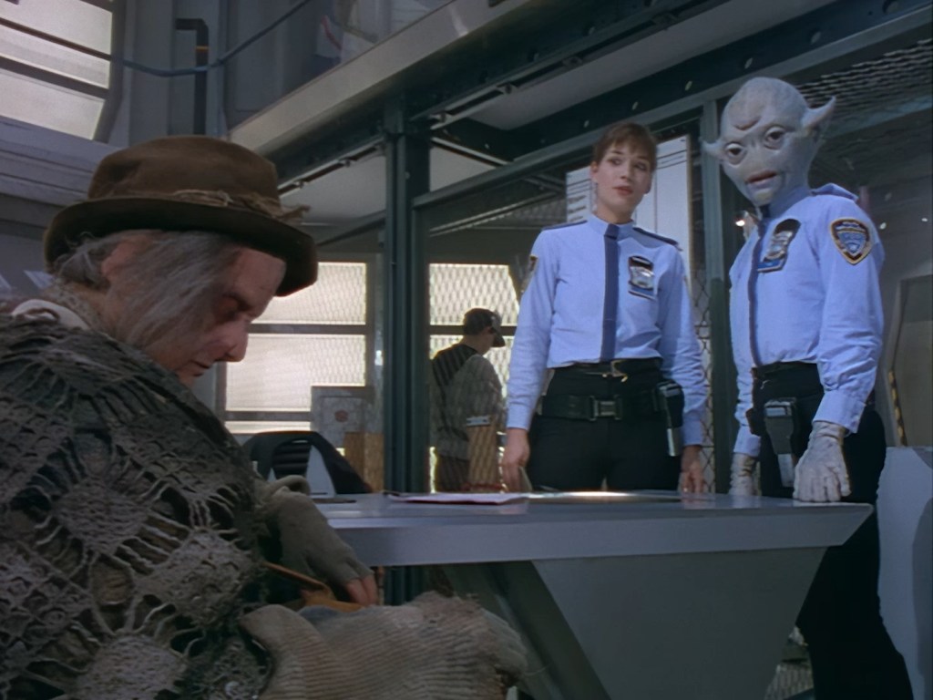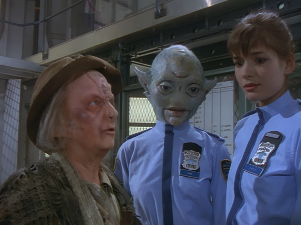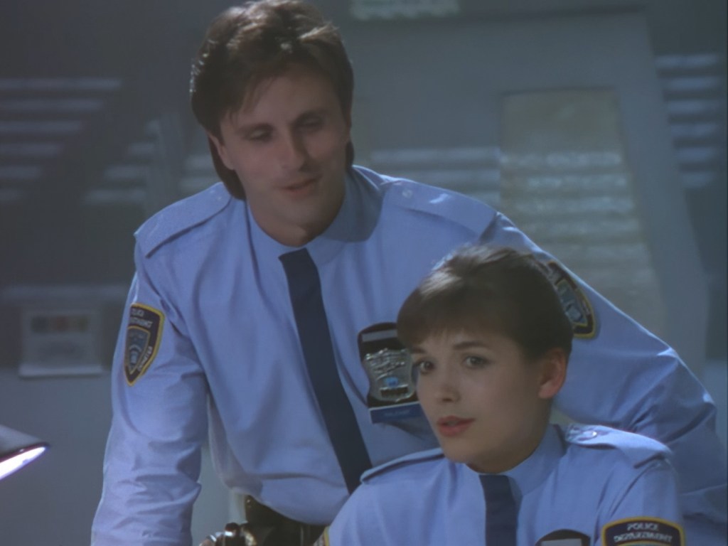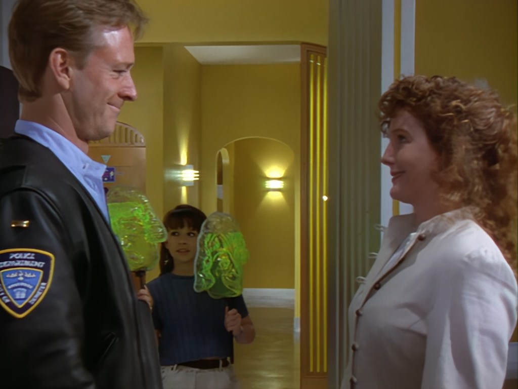 Simone Bendix is Officer Jane Castle! Again, Simone is brilliant in the role and she has great chemistry with the rest of the cast, but she was an unusual casting choice for a leading role since she had very few film and television credits to her name prior to Space Precinct. Then again, I can’t imagine the part was particularly inspiring on paper – playing the third lead who is specifically there to get sidelined every week by the two male leads who are off having bigger, more important crimefighting adventures. Fortunately, the writers did end up finding a place for Officer Castle later on, but for this week Double Duty definitely saddles her with the uninspired B-plot.