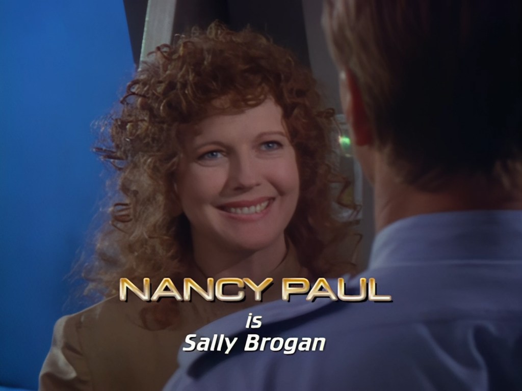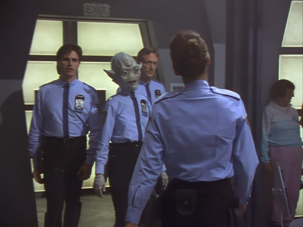 Finishing the lineup of stars is Nancy Paul as Sally Brogan… yup, she’s in this as well. Frankly, based on the early episodes anyway, I think it’s a miracle the casting directors managed to interest anyone into playing the role of Sally Brogan. Nancy Paul does a decent enough job with what she was given… and that’s all I have to say on that for now. The fact that Nancy Paul received main title billing but someone like Jerome Willis as Captain Podly didn’t (at first) is perhaps the clearest indicator that the writers and producers had no idea where they were taking the show tonally… So far in this title sequence we’ve had one single alien randomly pop up in amongst all these very Hollywood-handsome friendly human looking people.