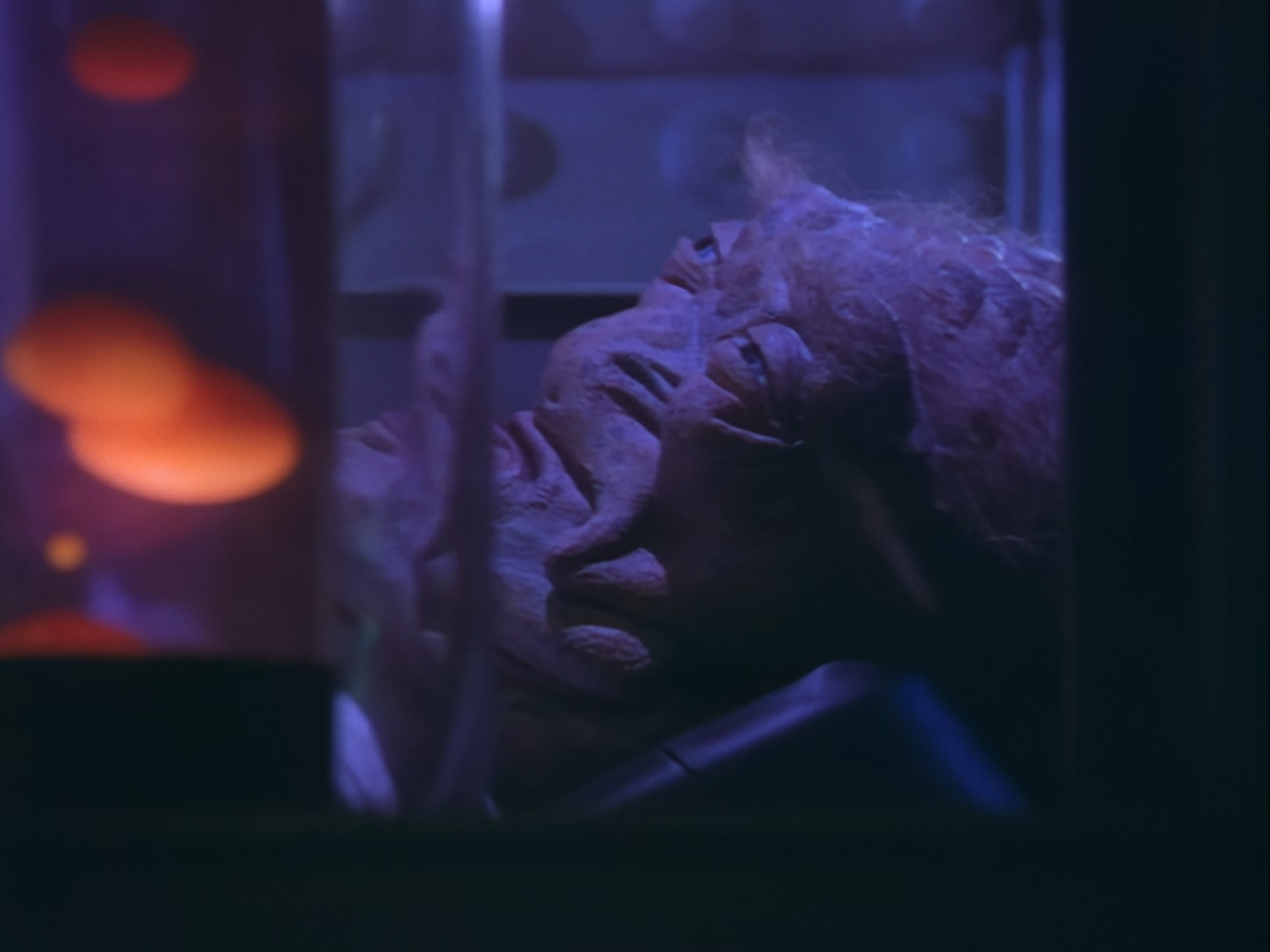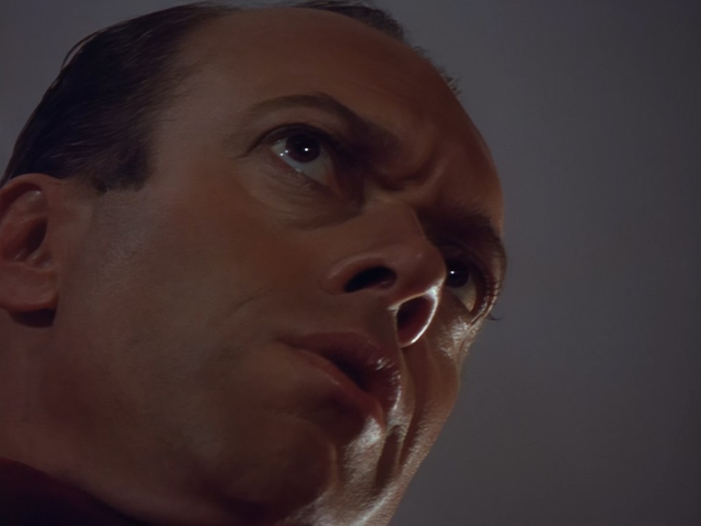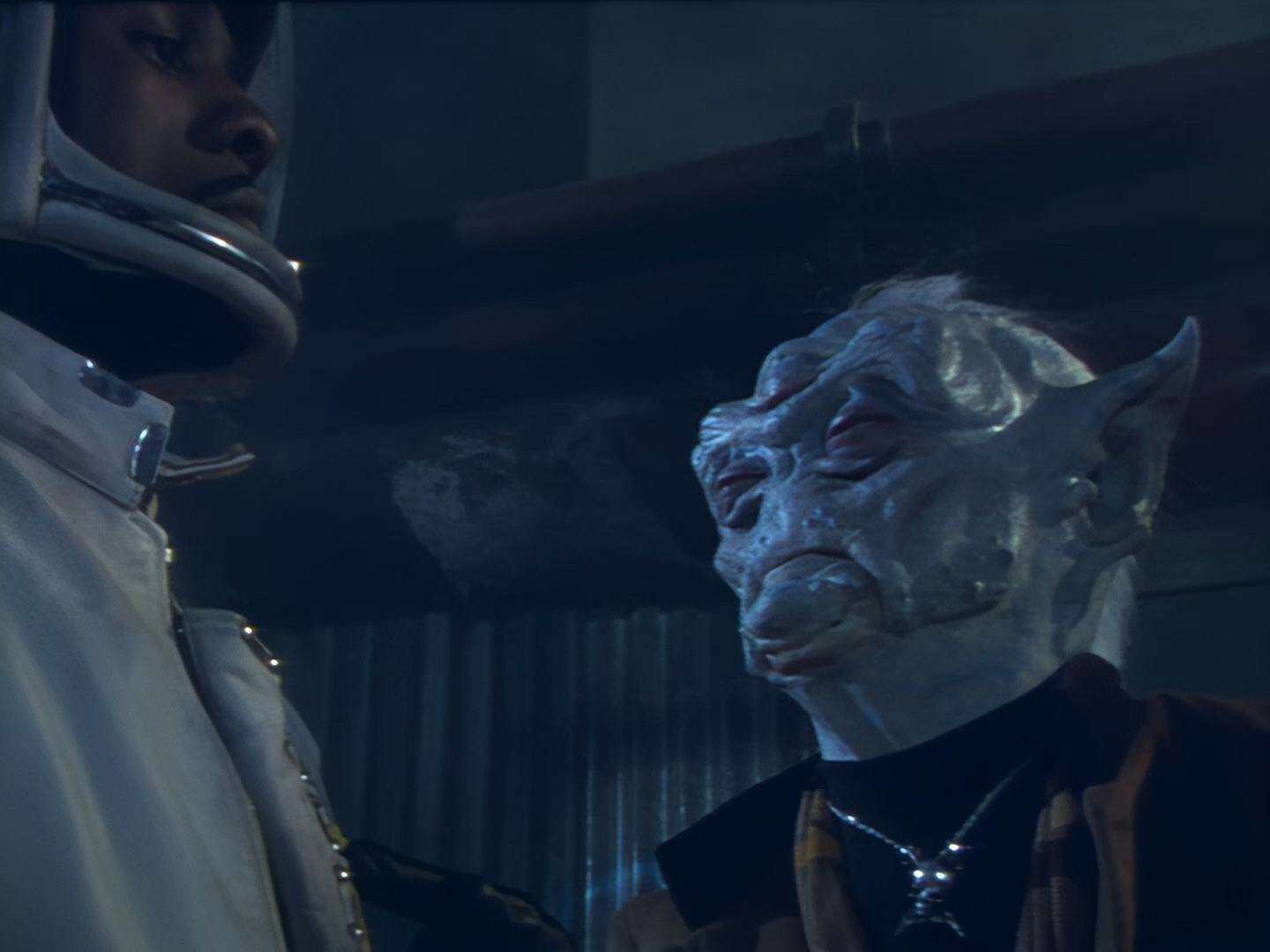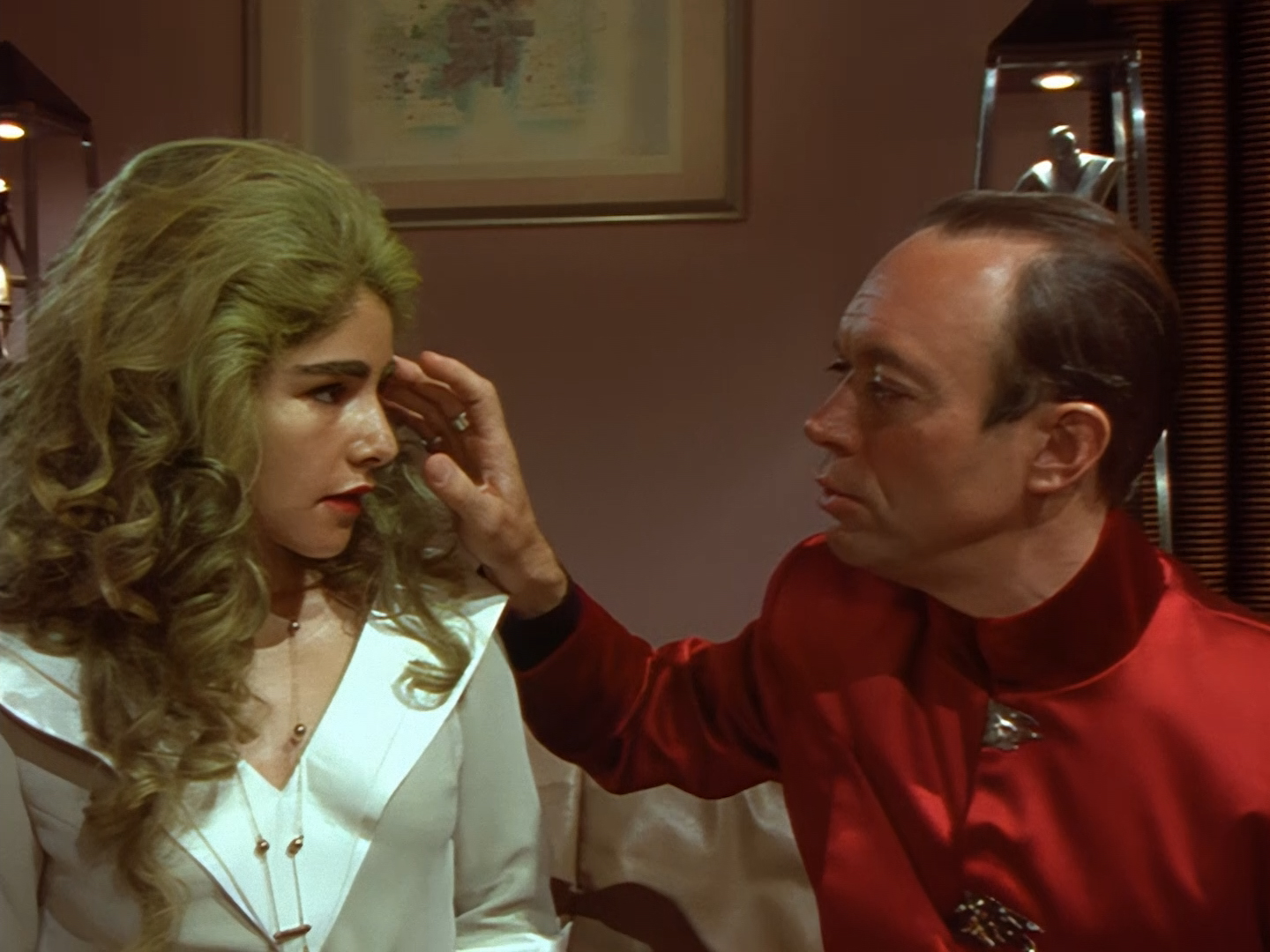Aleesha tries to convince Haldane she was only interested in Nissim for his charm and polite conversation… an argument I’d find a lot more convincing if I hadn’t spent the first five minutes trying not to chuck up my dinner every time Nissim spoke. Then we switch from a bit of a flirty energy to poor Aleesha overwhelmed with emotion breaking down in tears. The voice actor, Moir Leslie, is desperately trying to match Lana Citron’s on-screen performance but for obvious reasons it just sounds even more fake than it probably did live on the sound stage. The dubbing makes it pretty much impossible to become invested in the emotion of the scene and leaves the whole thing feeling like a bit of a cheesy mess. This isn’t helped by the fact that the set looks like it was thrown together out of bits of vacuum-formed packaging in about five minutes. The three actors, one of whom is in a big bulky mask, are clearly having trouble moving around the space to keep the scene interesting, and the camera is pushed right in to avoid exposing the edges of the set. The large mirror probably doesn’t help much with hiding the camera either.