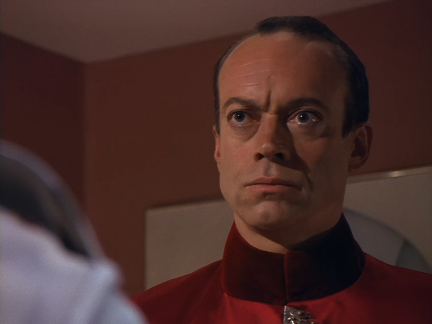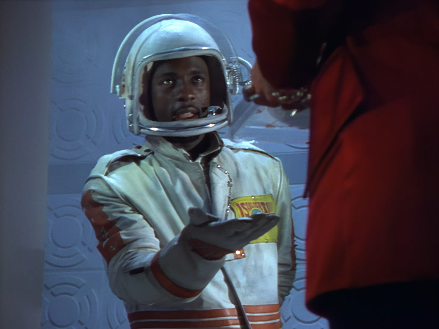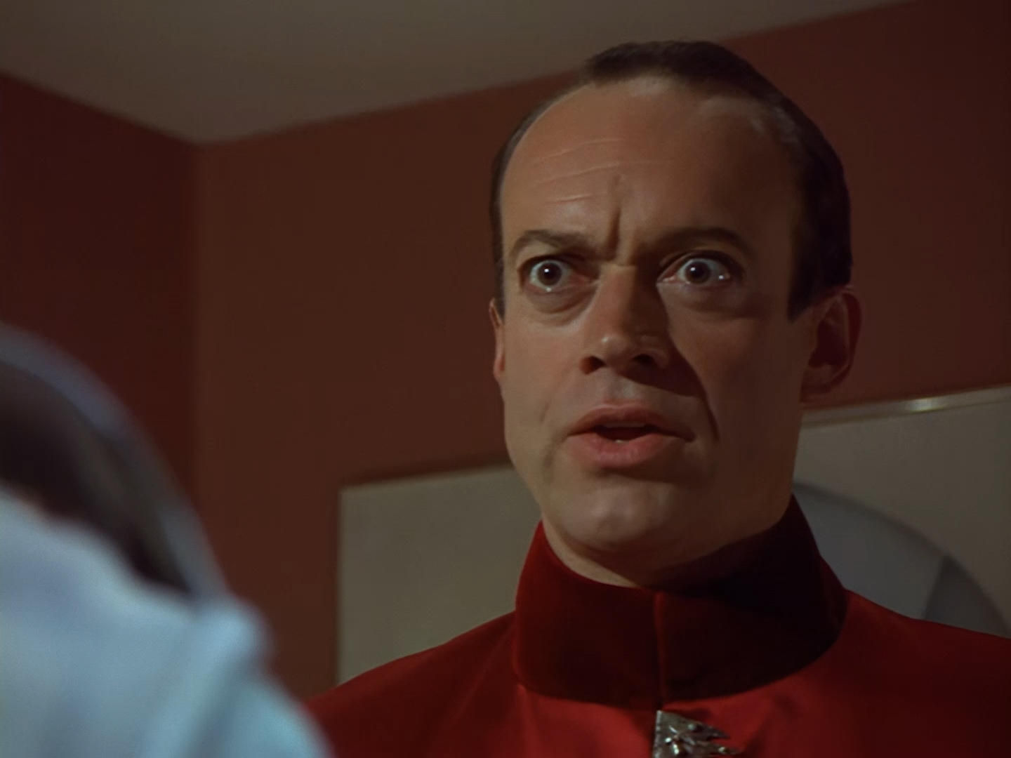 Aleesha tries to convince Haldane she was only interested in Nissim for his charm and polite conversation… an argument I’d find a lot more convincing if I hadn’t spent the first five minutes trying not to chuck up my dinner every time Nissim spoke. Then we switch from a bit of a flirty energy to poor Aleesha overwhelmed with emotion breaking down in tears. The voice actor, Moir Leslie, is desperately trying to match Lana Citron’s on-screen performance but for obvious reasons it just sounds even more fake than it probably did live on the sound stage. The dubbing makes it pretty much impossible to become invested in the emotion of the scene and leaves the whole thing feeling like a bit of a cheesy mess. This isn’t helped by the fact that the set looks like it was thrown together out of bits of vacuum-formed packaging in about five minutes. The three actors, one of whom is in a big bulky mask, are clearly having trouble moving around the space to keep the scene interesting, and the camera is pushed right in to avoid exposing the edges of the set. The large mirror probably doesn’t help much with hiding the camera either.