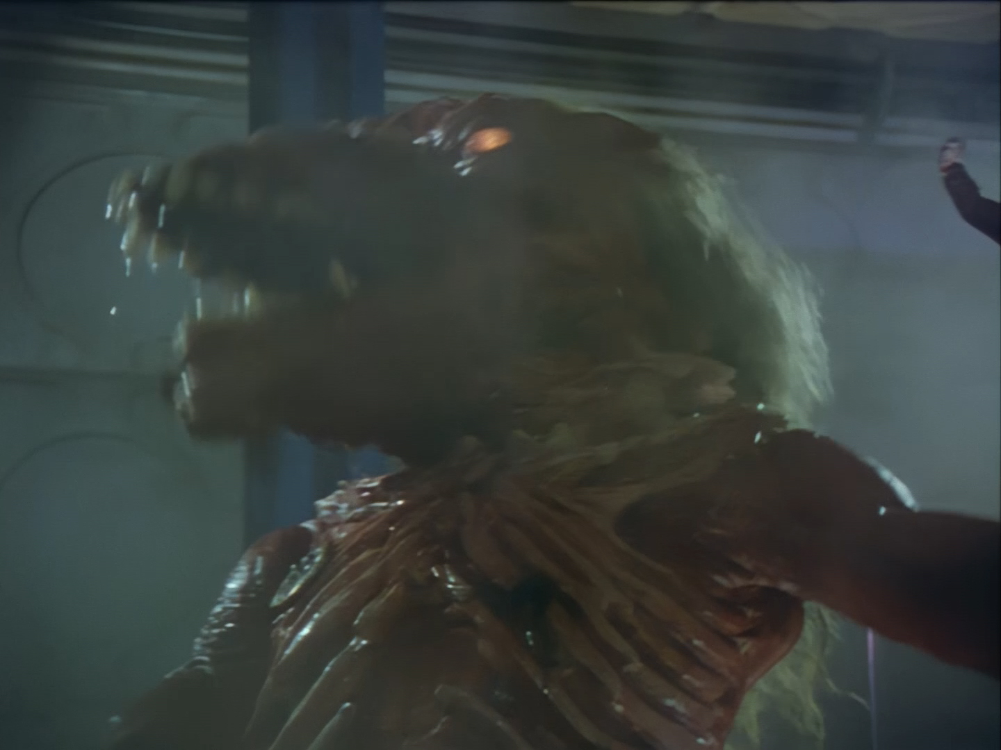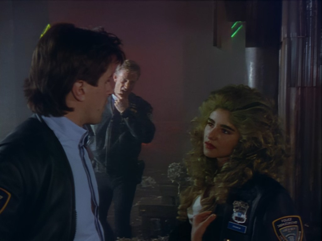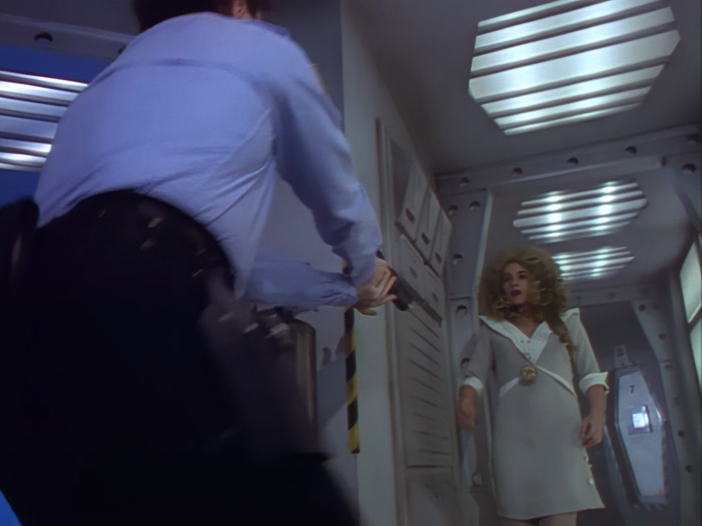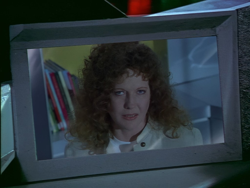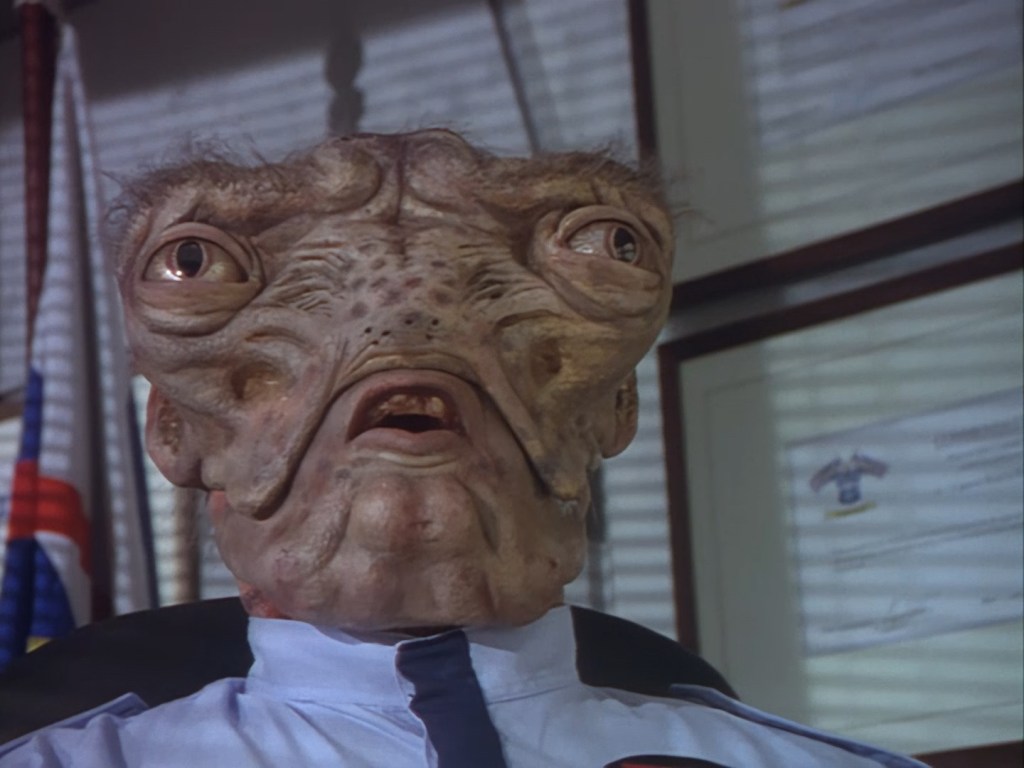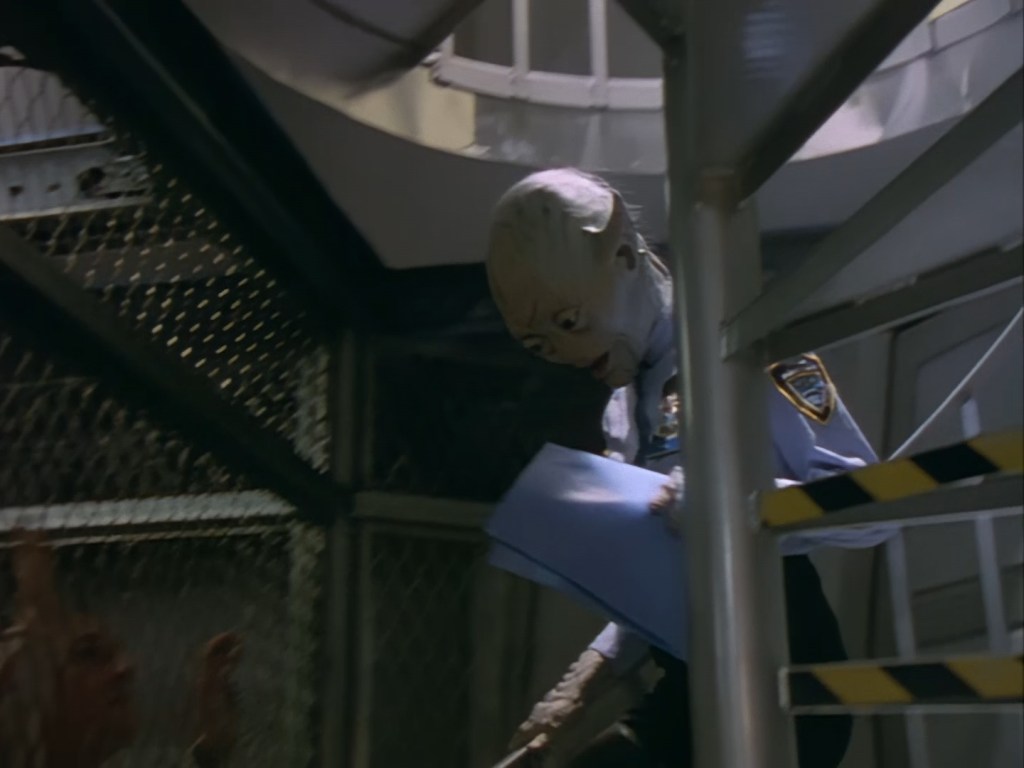 Look, it’s not the most convincing transformation in the world, but it’s not the worst either. The fact the blue screen lighting doesn’t match the backdrop is a problem, but the way the grizzly prosthetic on Aleesha’s back morphs into the grizzly head of the monster is quite effective. Obviously we all knew it was coming, but I don’t think I would have predicted exactly how the change would actually be done. That said, I’m pretty sure The Thing (1982) was a big influence on this. In fact, you’ll find that a lot of Space Precinct episodes beg, steal or borrow imagery from famous movies. (Unfortunately, I won’t always spot them because I’m woefully uneducated about movie history. I’ve essentially spent the past 30 years watching nothing but cheap and cheerful telly, so forgive me if a reference to a pinnacle piece of cinematic history passes me by.)