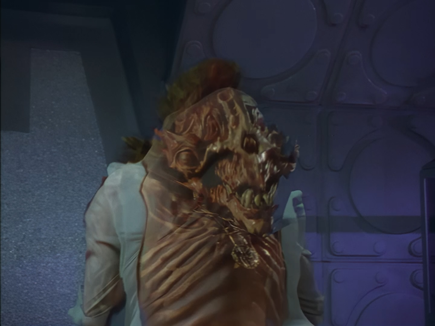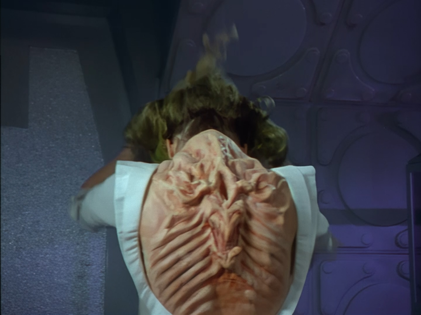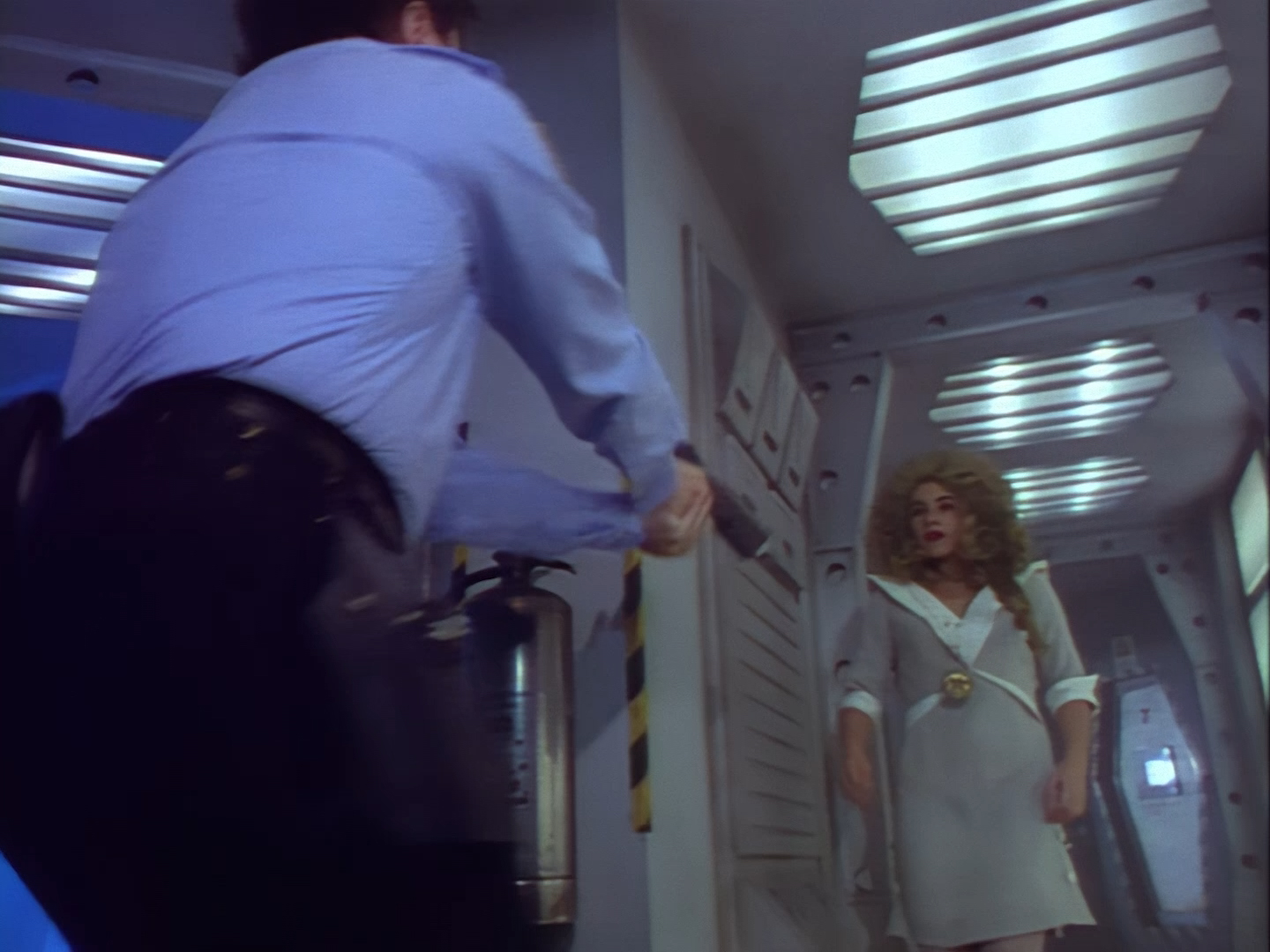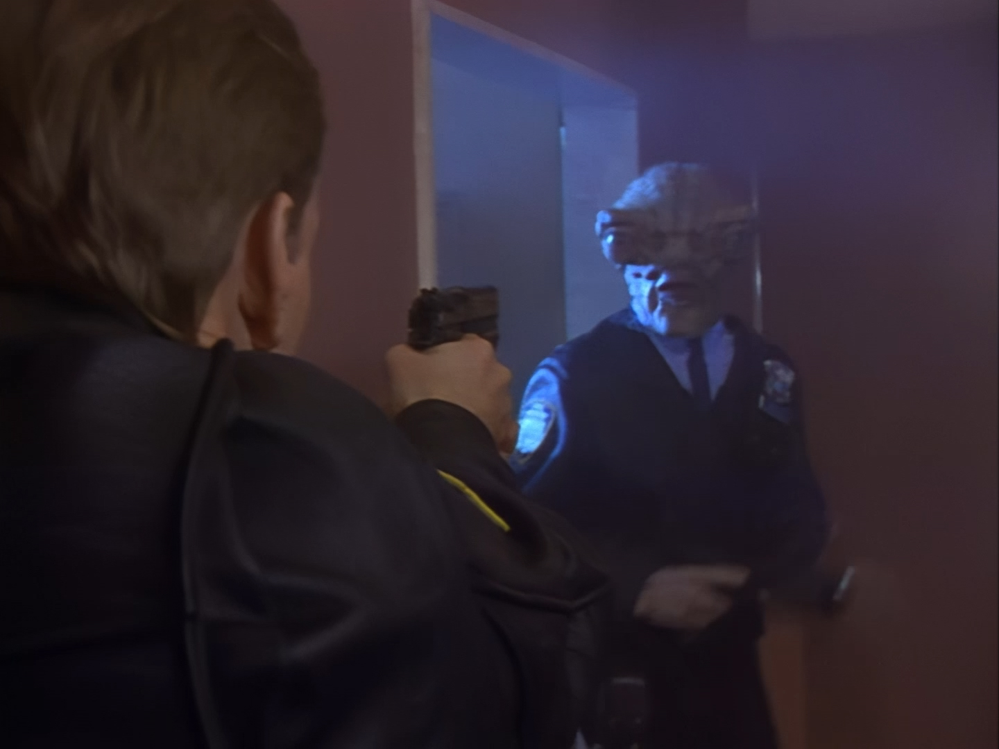 Look, it’s not the most convincing transformation in the world, but it’s not the worst either. The fact the blue screen lighting doesn’t match the backdrop is a problem, but the way the grizzly prosthetic on Aleesha’s back morphs into the grizzly head of the monster is quite effective. Obviously we all knew it was coming, but I don’t think I would have predicted exactly how the change would actually be done. That said, I’m pretty sure The Thing (1982) was a big influence on this. In fact, you’ll find that a lot of Space Precinct episodes beg, steal or borrow imagery from famous movies. (Unfortunately, I won’t always spot them because I’m woefully uneducated about movie history. I’ve essentially spent the past 30 years watching nothing but cheap and cheerful telly, so forgive me if a reference to a pinnacle piece of cinematic history passes me by.)