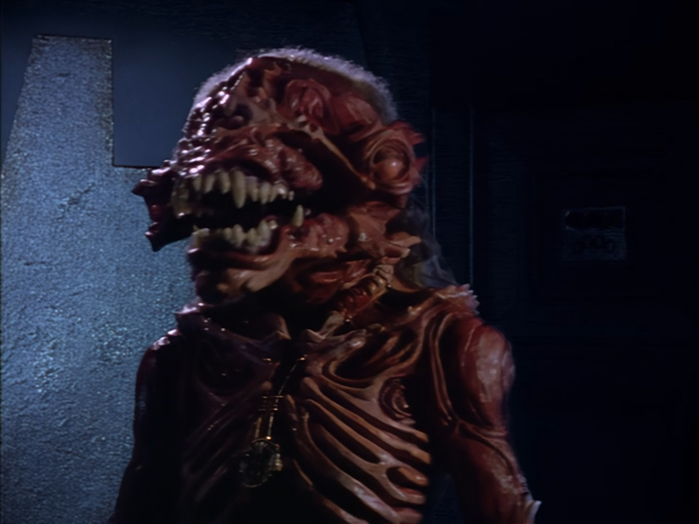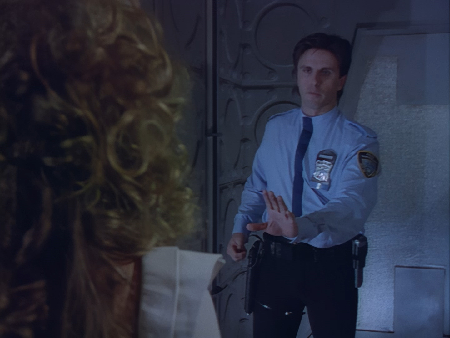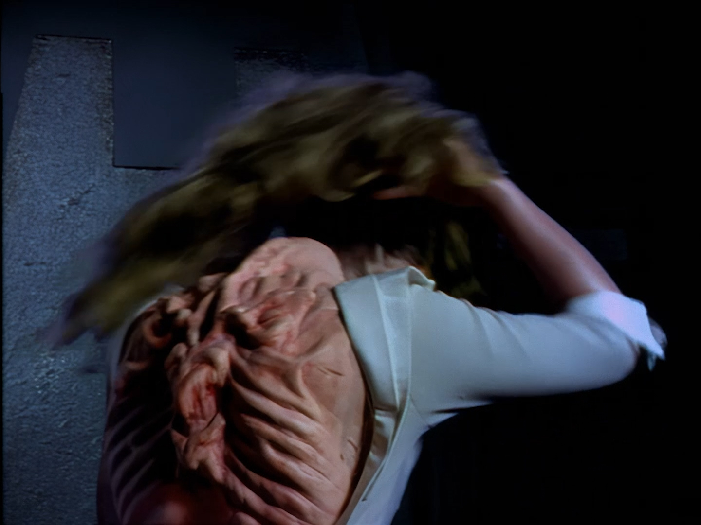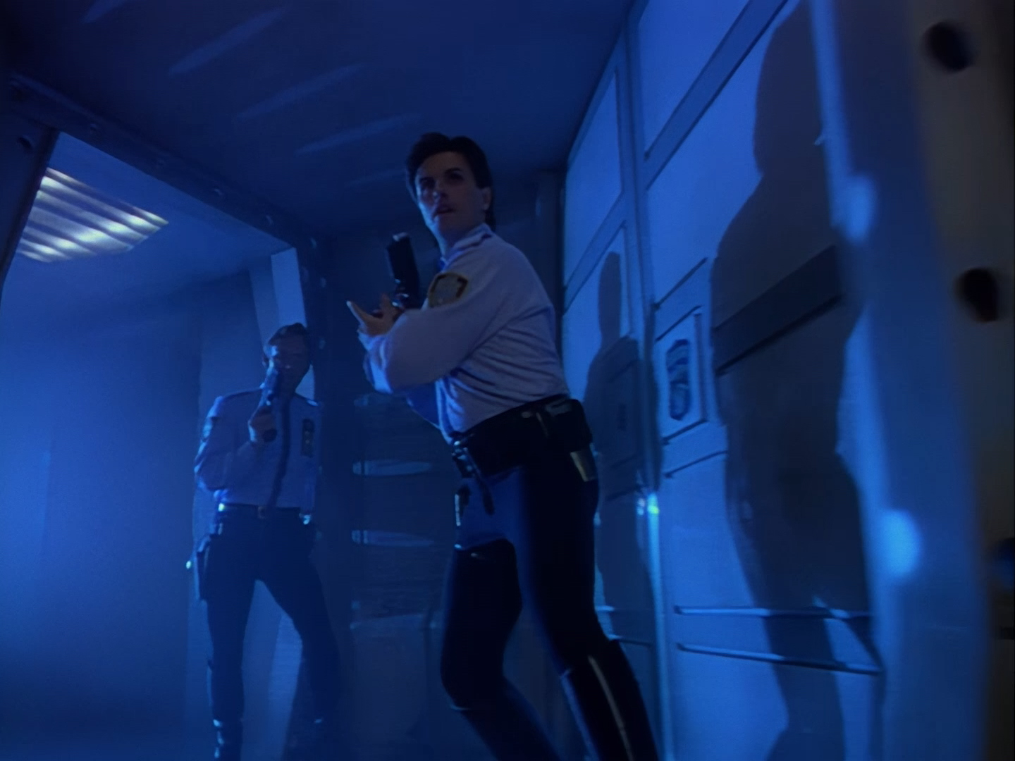 Look, it’s not the most convincing transformation in the world, but it’s not the worst either. The fact the blue screen lighting doesn’t match the backdrop is a problem, but the way the grizzly prosthetic on Aleesha’s back morphs into the grizzly head of the monster is quite effective. Obviously we all knew it was coming, but I don’t think I would have predicted exactly how the change would actually be done. That said, I’m pretty sure The Thing (1982) was a big influence on this. In fact, you’ll find that a lot of Space Precinct episodes beg, steal or borrow imagery from famous movies. (Unfortunately, I won’t always spot them because I’m woefully uneducated about movie history. I’ve essentially spent the past 30 years watching nothing but cheap and cheerful telly, so forgive me if a reference to a pinnacle piece of cinematic history passes me by.)