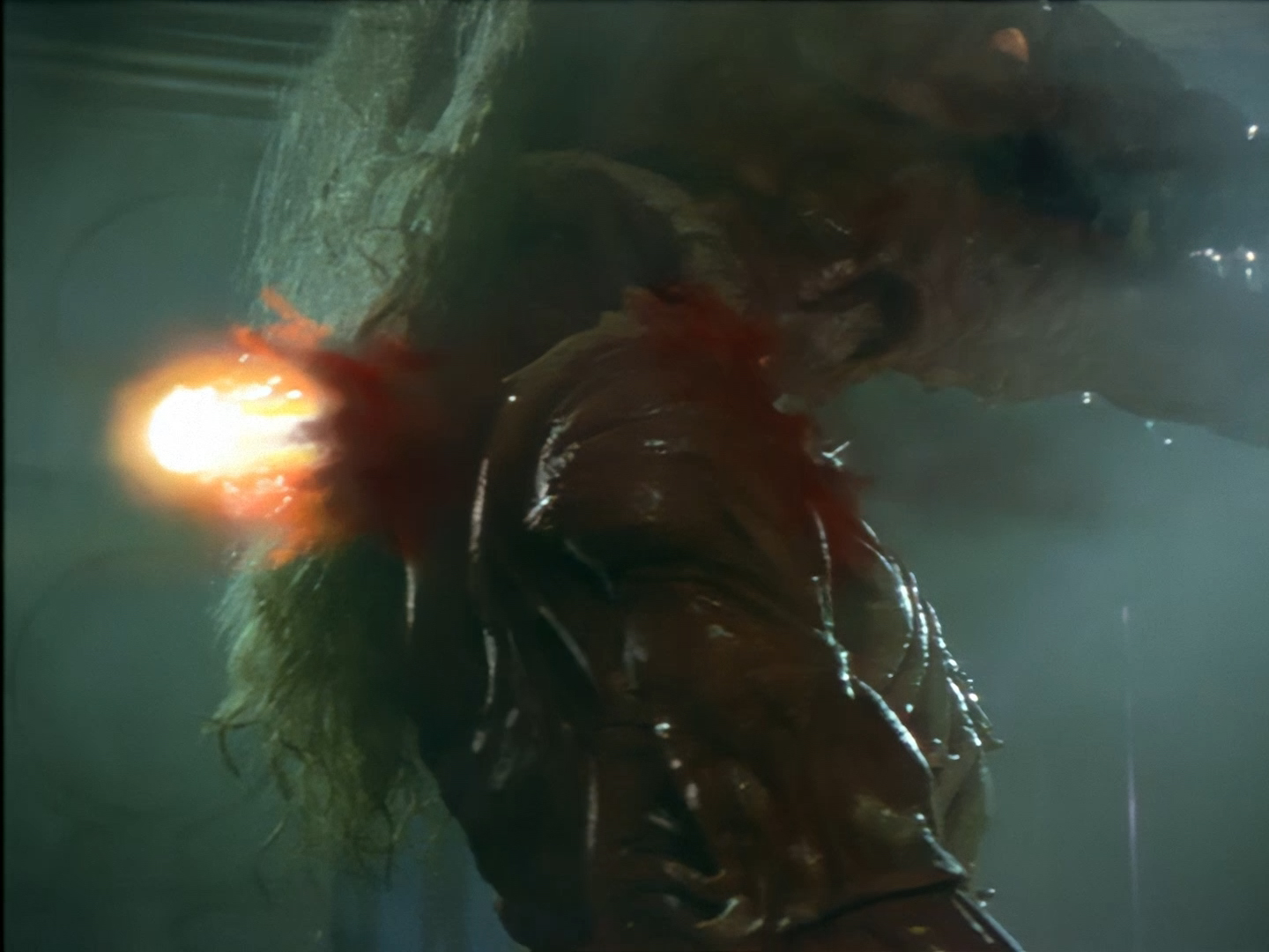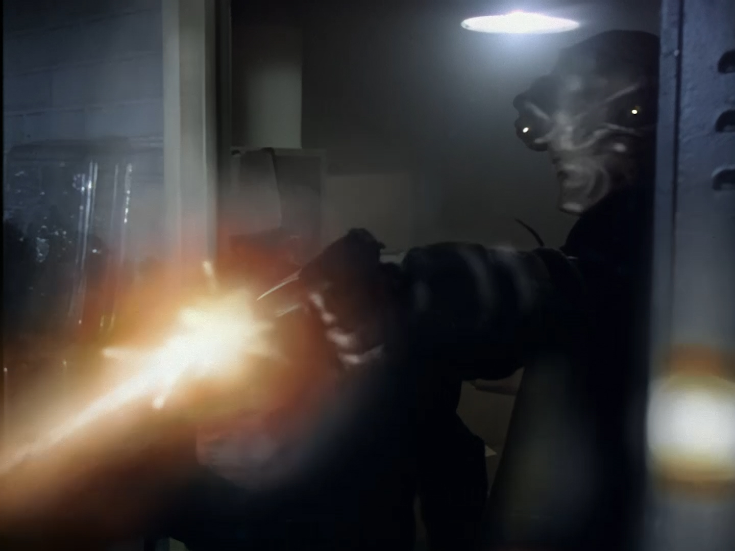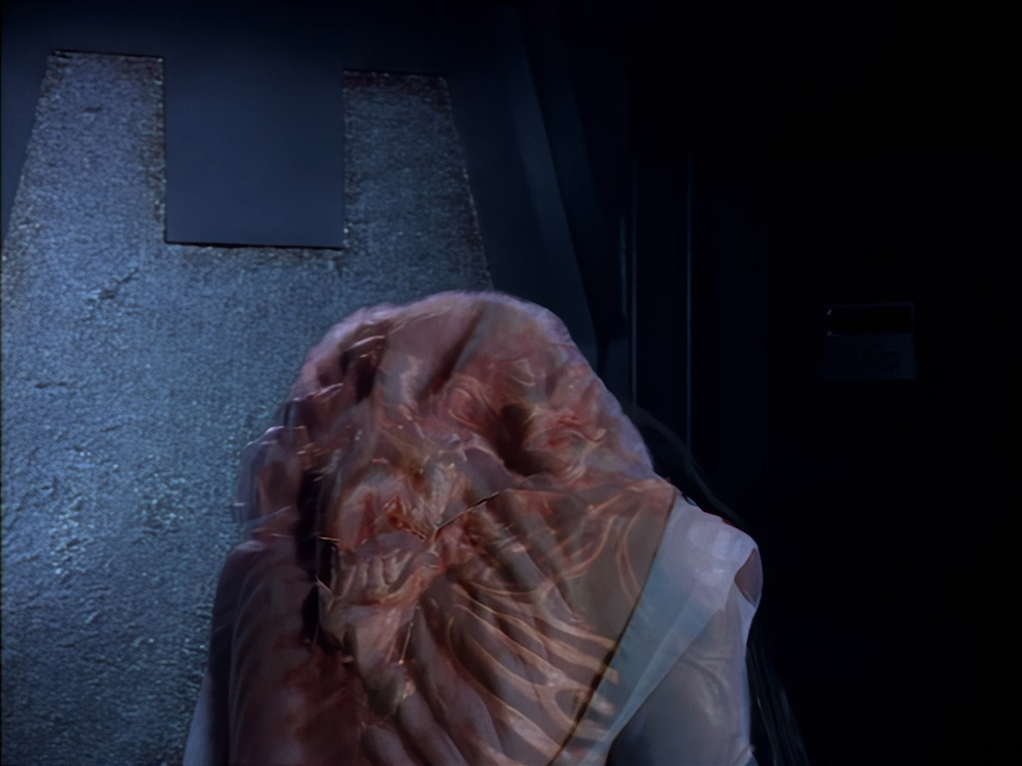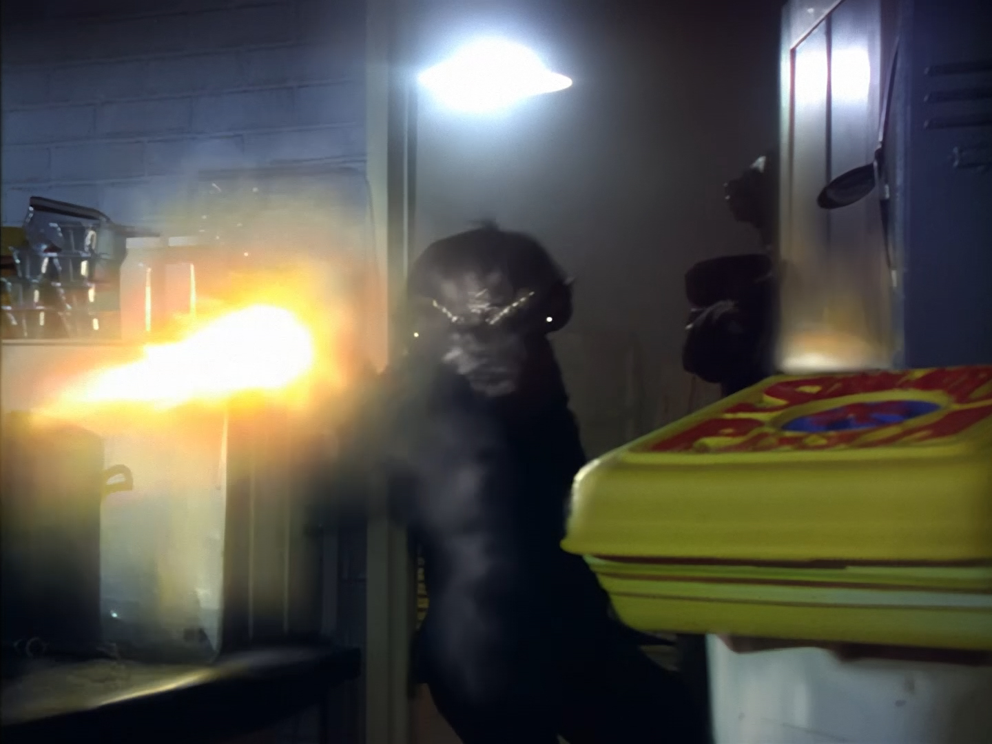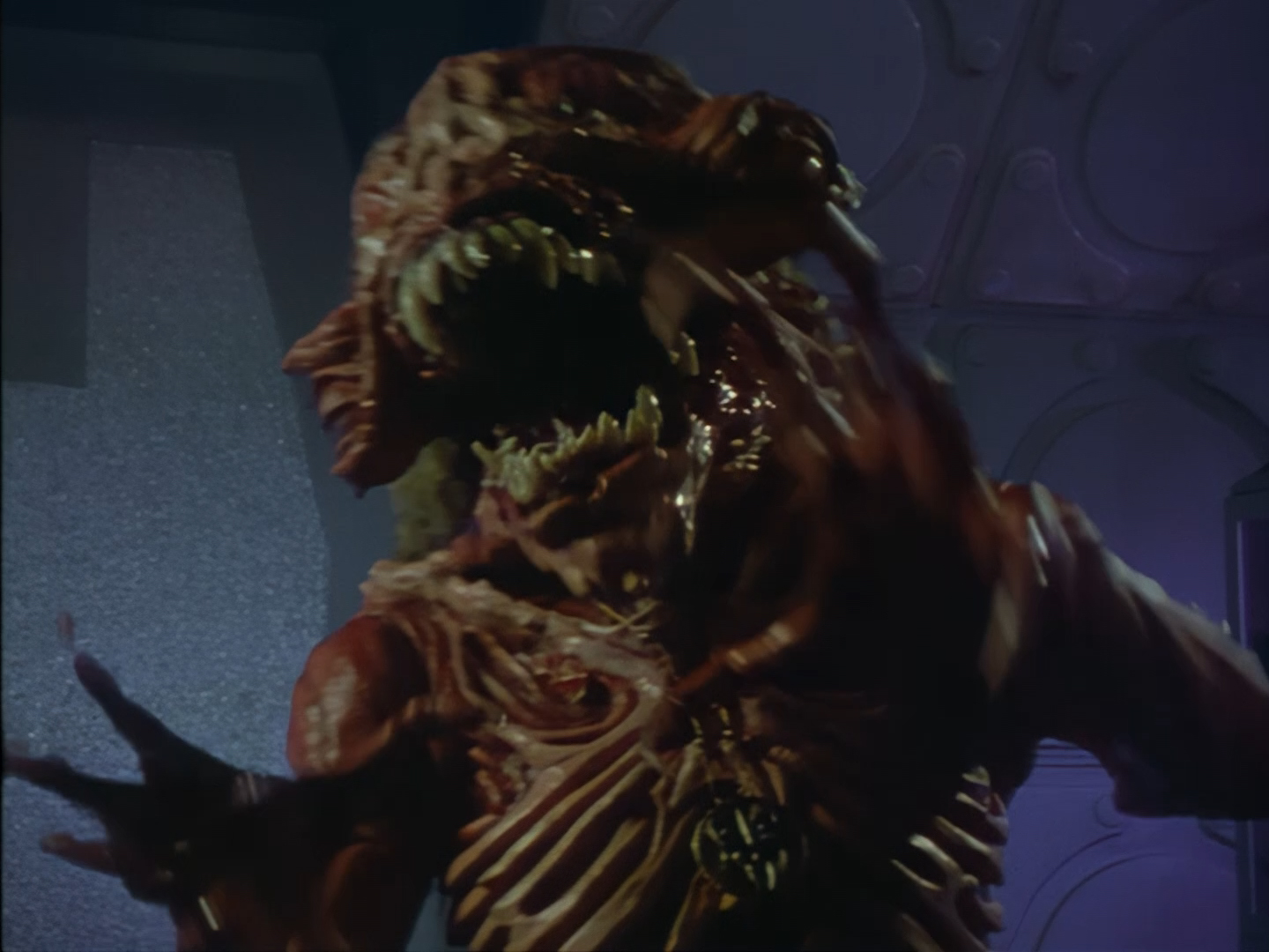 Look, it’s not the most convincing transformation in the world, but it’s not the worst either. The fact the blue screen lighting doesn’t match the backdrop is a problem, but the way the grizzly prosthetic on Aleesha’s back morphs into the grizzly head of the monster is quite effective. Obviously we all knew it was coming, but I don’t think I would have predicted exactly how the change would actually be done. That said, I’m pretty sure The Thing (1982) was a big influence on this. In fact, you’ll find that a lot of Space Precinct episodes beg, steal or borrow imagery from famous movies. (Unfortunately, I won’t always spot them because I’m woefully uneducated about movie history. I’ve essentially spent the past 30 years watching nothing but cheap and cheerful telly, so forgive me if a reference to a pinnacle piece of cinematic history passes me by.)
