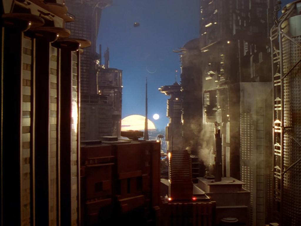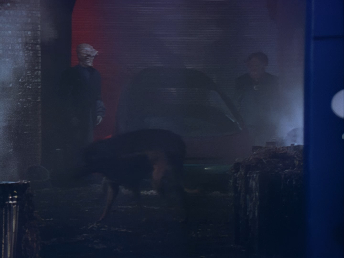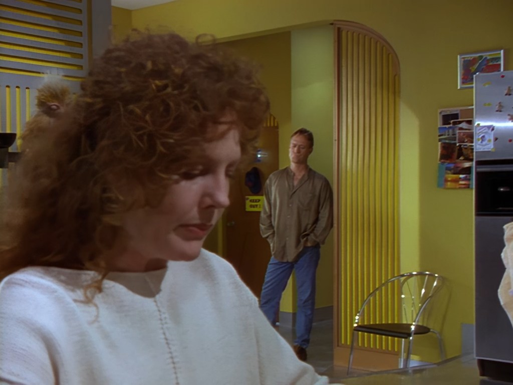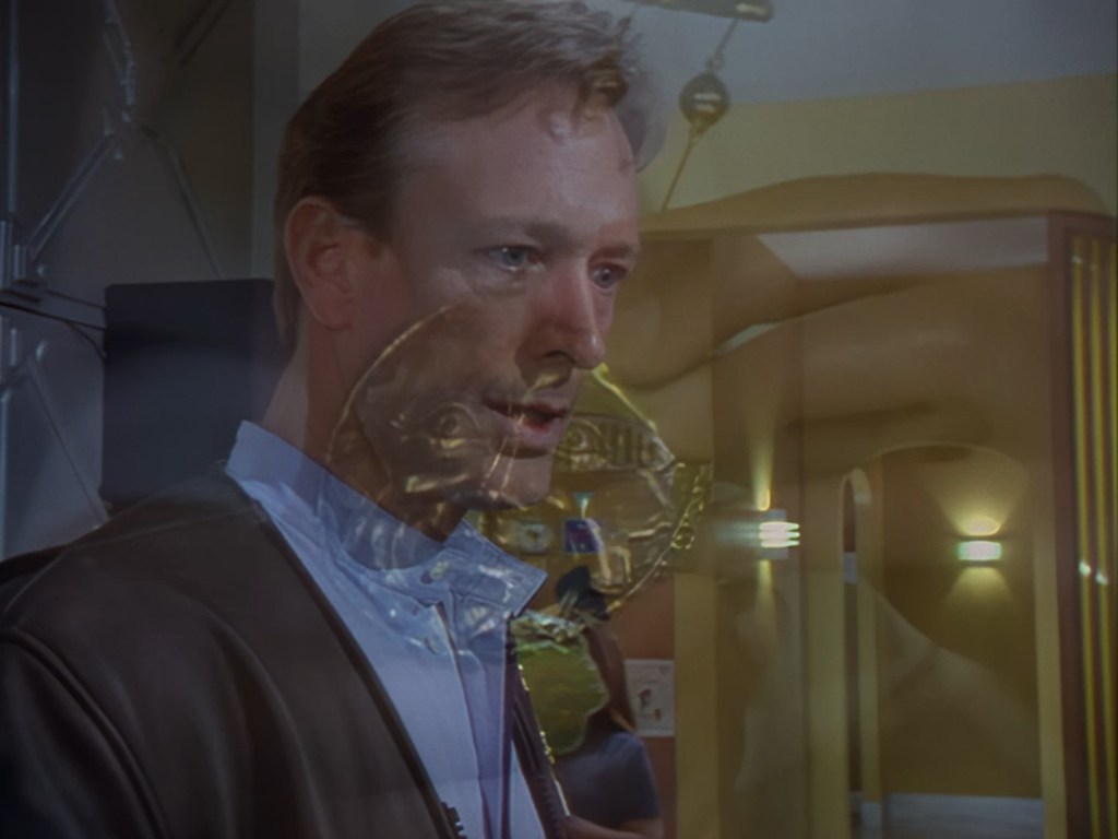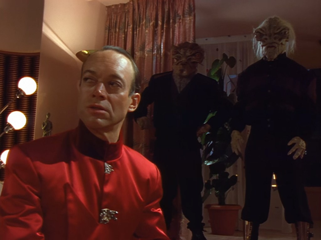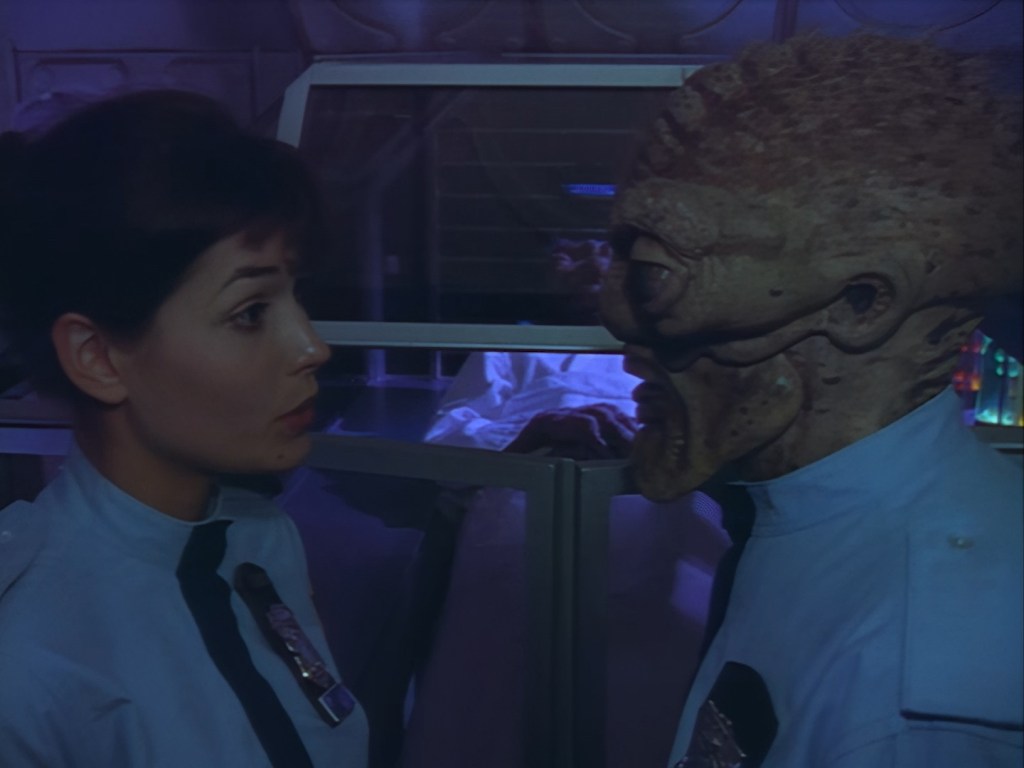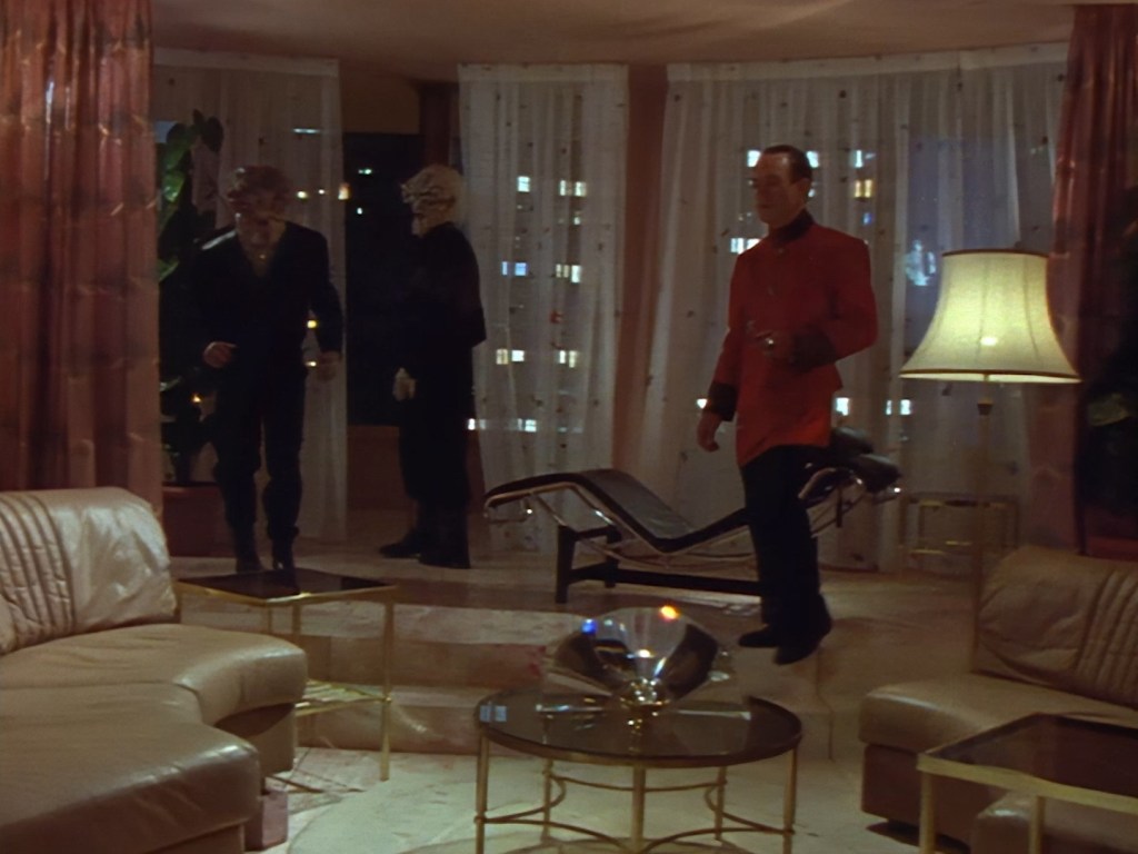 It becomes apparent that Brogan and Haldane are going to hover around outside for a bit which makes the two Creon cronies nervous. Nissim’s apartment is… well look, I’m no interior designer, and I know it was the 90s, but the idea that a crime lord on an alien planet in the future would have those curtains and that lamp shade is absurd. Not just absurd but distracting. The city outside just doesn’t match the apartment inside. That might be okay if it weren’t for the fact you also have two incredibly realistic-looking aliens standing on the set. It’s a major clash of styles and unfortunately this particular set isn’t the only casualty.