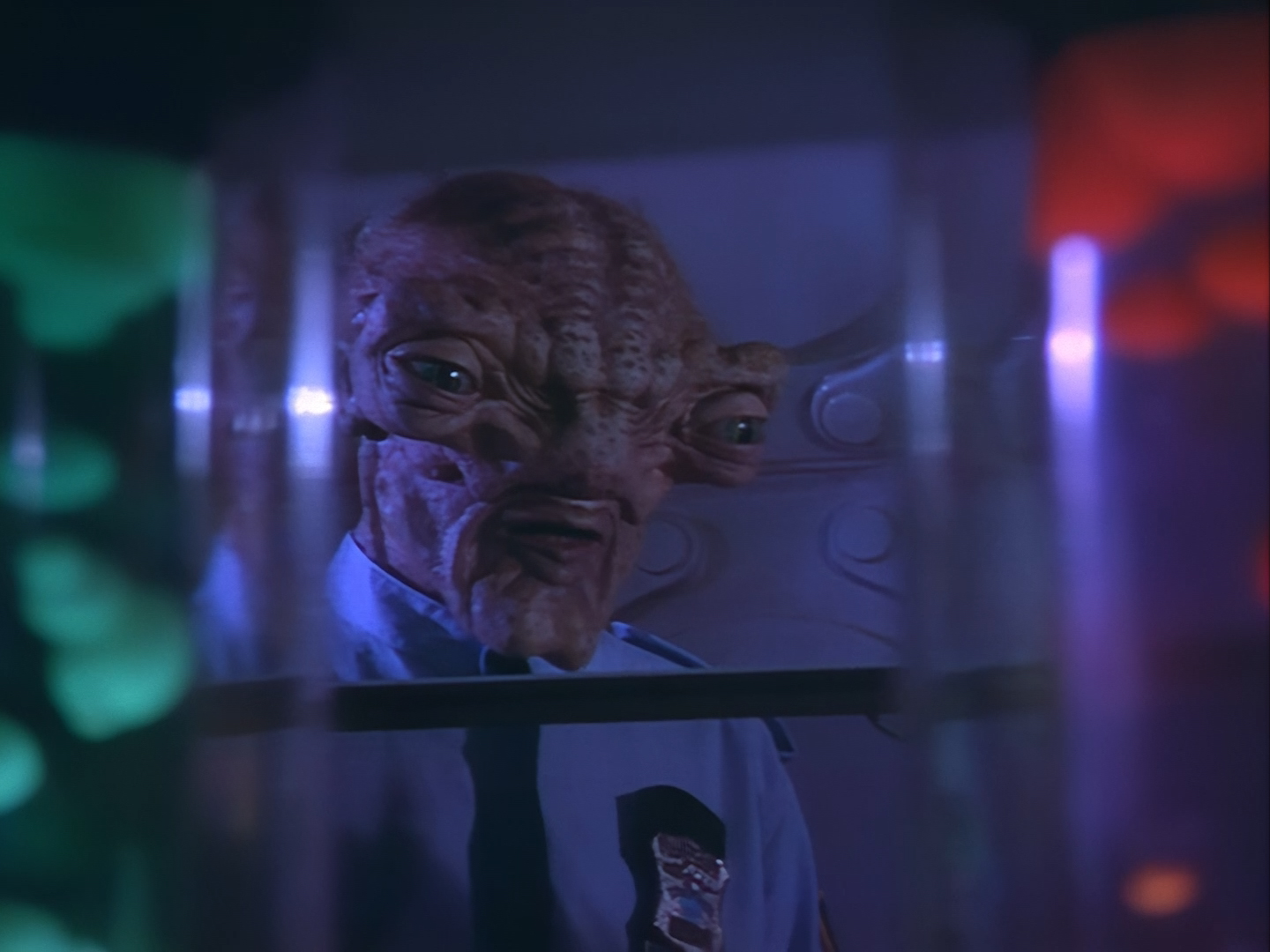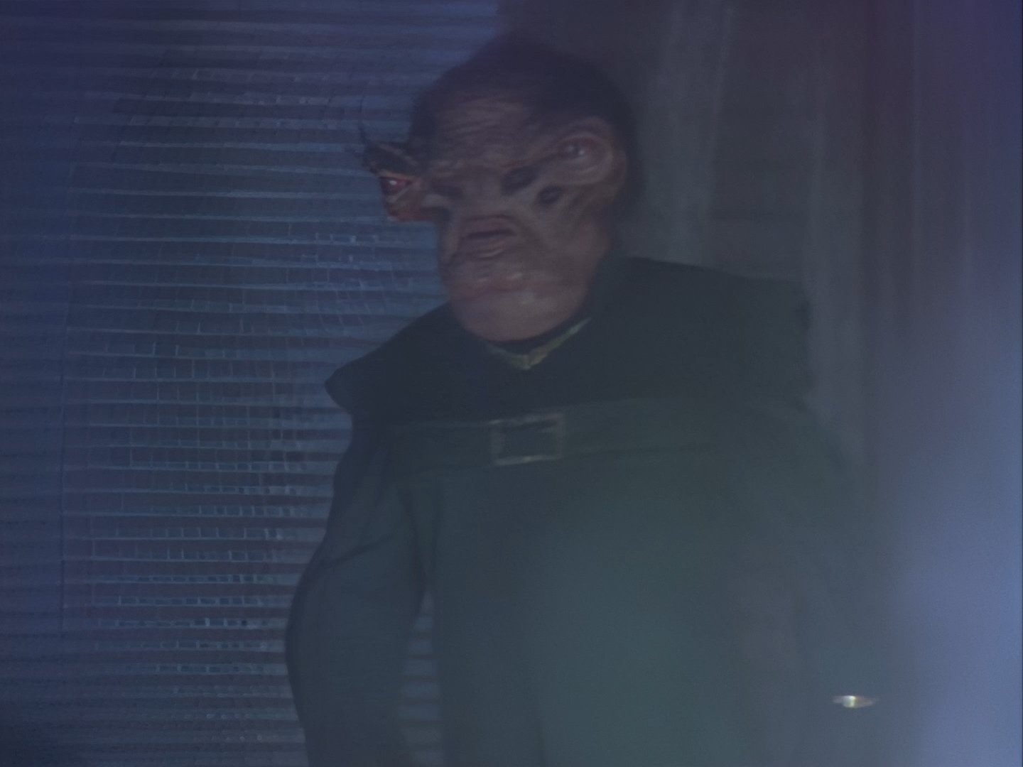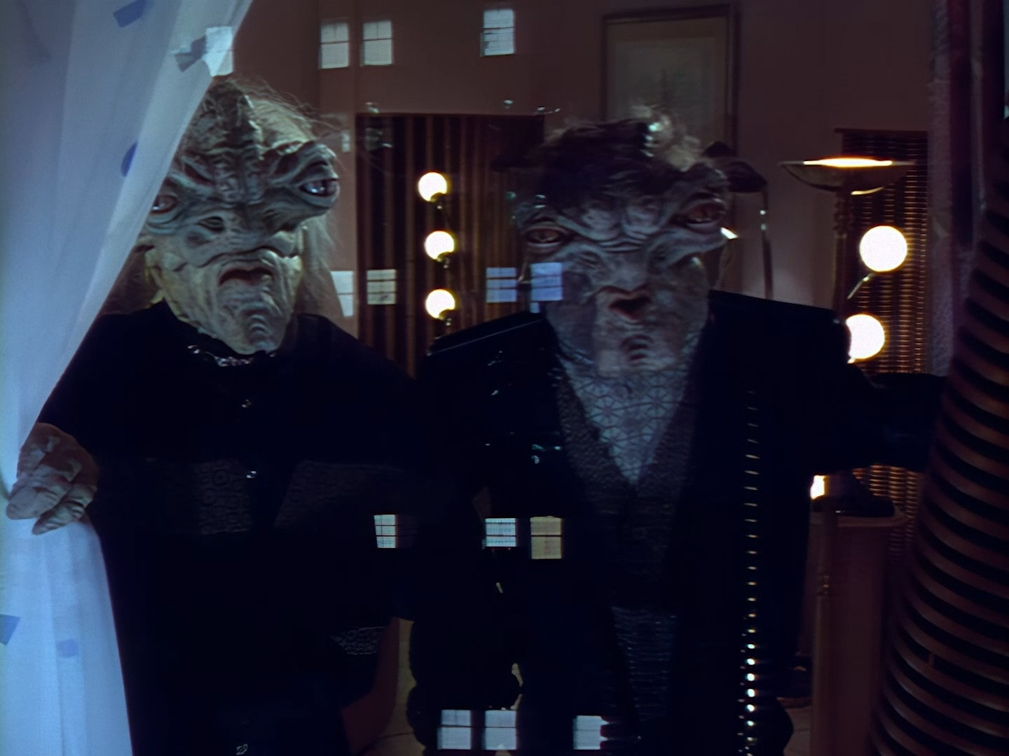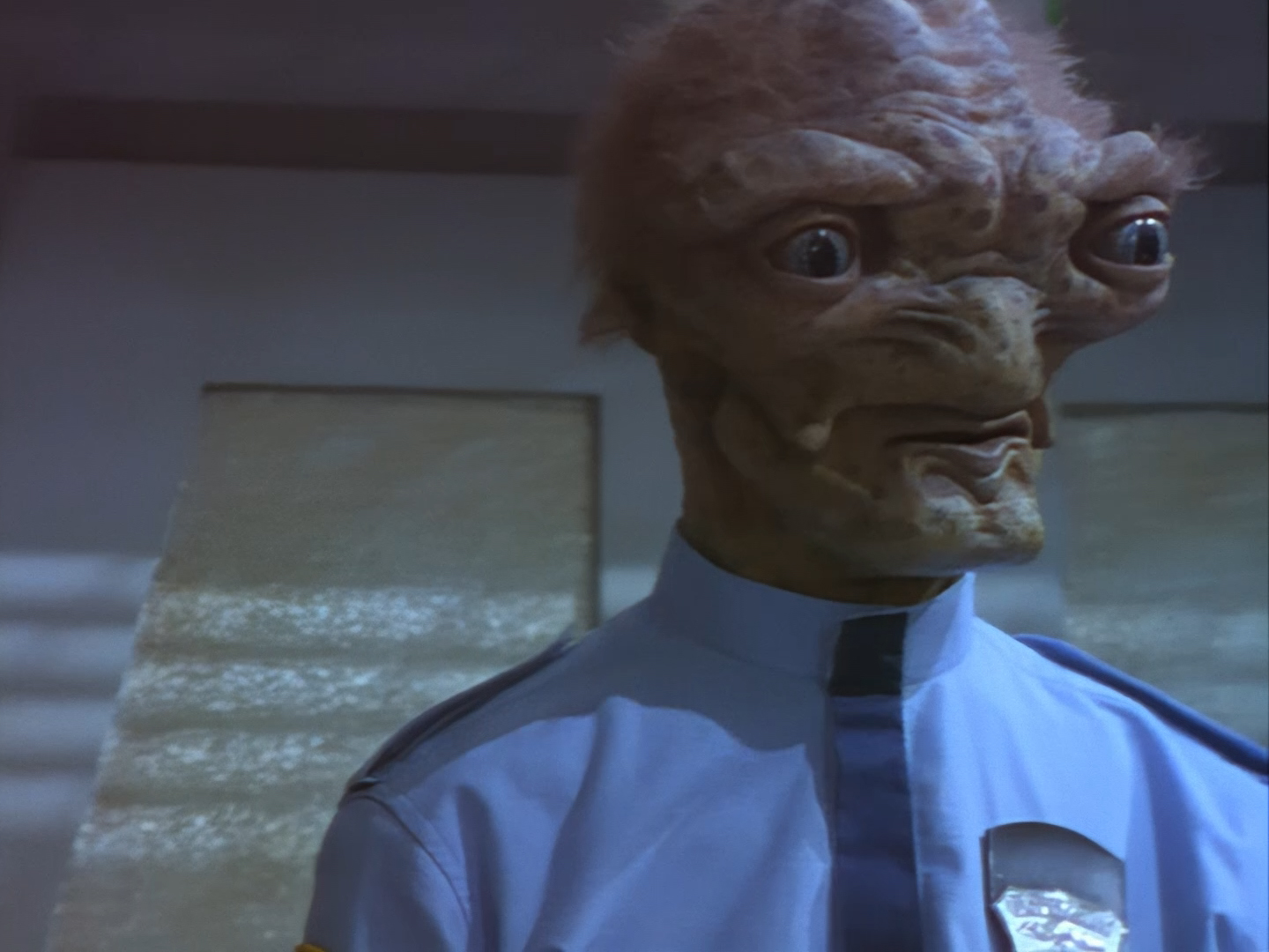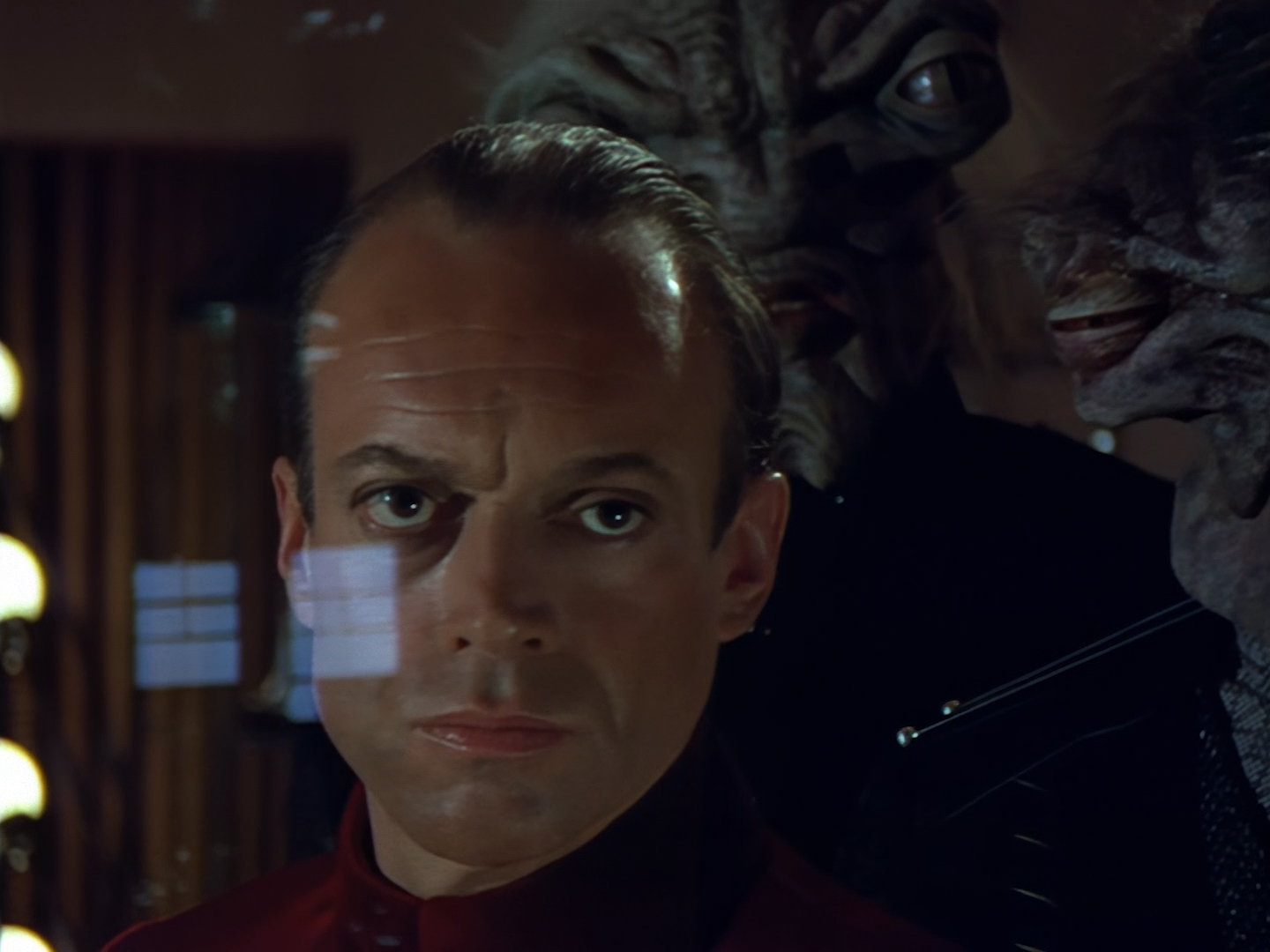 It becomes apparent that Brogan and Haldane are going to hover around outside for a bit which makes the two Creon cronies nervous. Nissim’s apartment is… well look, I’m no interior designer, and I know it was the 90s, but the idea that a crime lord on an alien planet in the future would have those curtains and that lamp shade is absurd. Not just absurd but distracting. The city outside just doesn’t match the apartment inside. That might be okay if it weren’t for the fact you also have two incredibly realistic-looking aliens standing on the set. It’s a major clash of styles and unfortunately this particular set isn’t the only casualty.