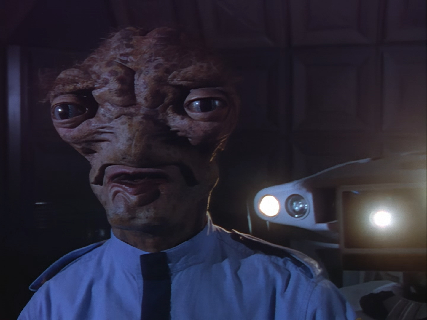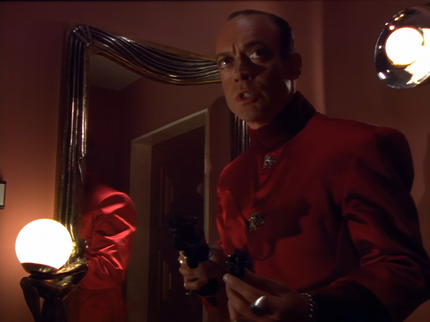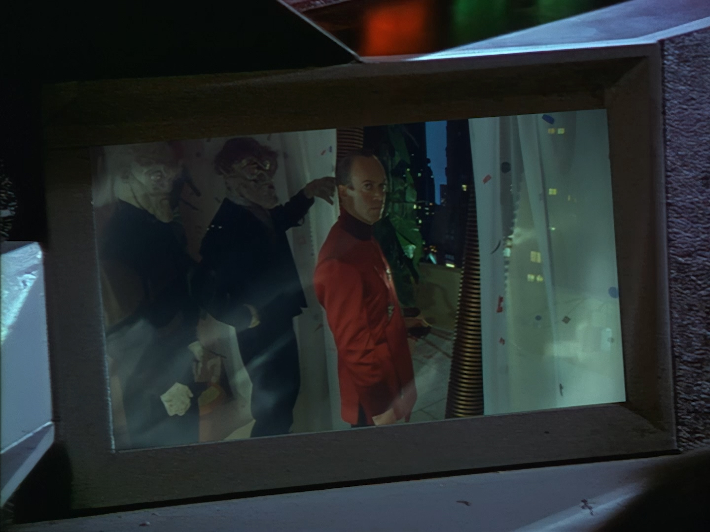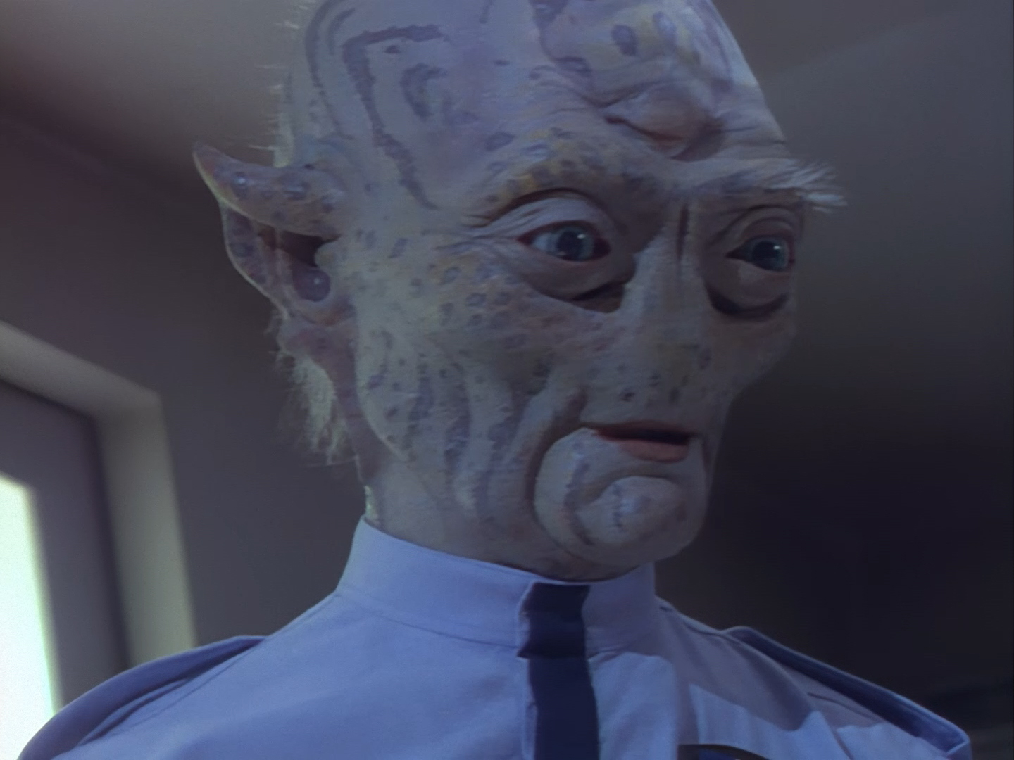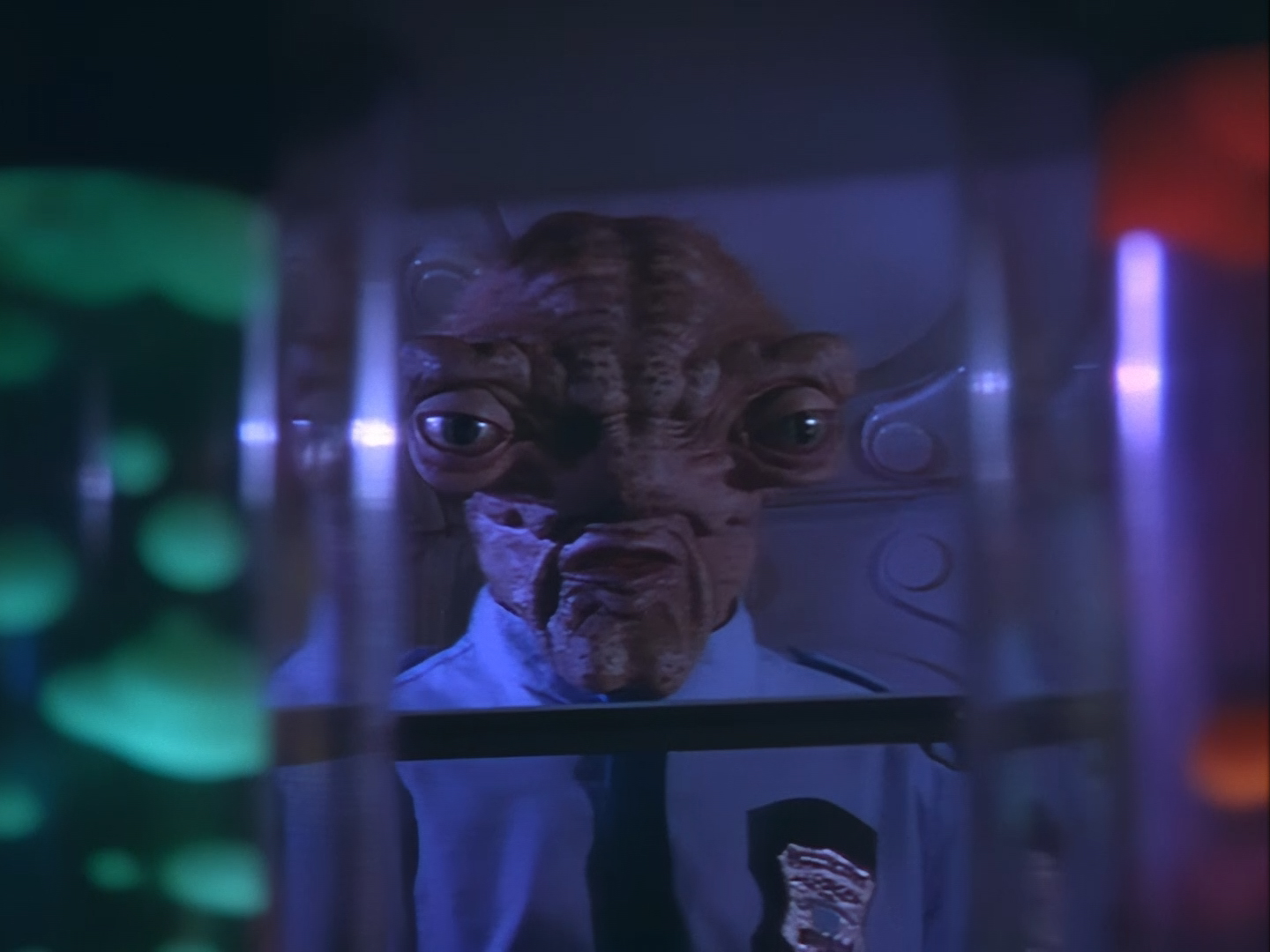 It becomes apparent that Brogan and Haldane are going to hover around outside for a bit which makes the two Creon cronies nervous. Nissim’s apartment is… well look, I’m no interior designer, and I know it was the 90s, but the idea that a crime lord on an alien planet in the future would have those curtains and that lamp shade is absurd. Not just absurd but distracting. The city outside just doesn’t match the apartment inside. That might be okay if it weren’t for the fact you also have two incredibly realistic-looking aliens standing on the set. It’s a major clash of styles and unfortunately this particular set isn’t the only casualty.
