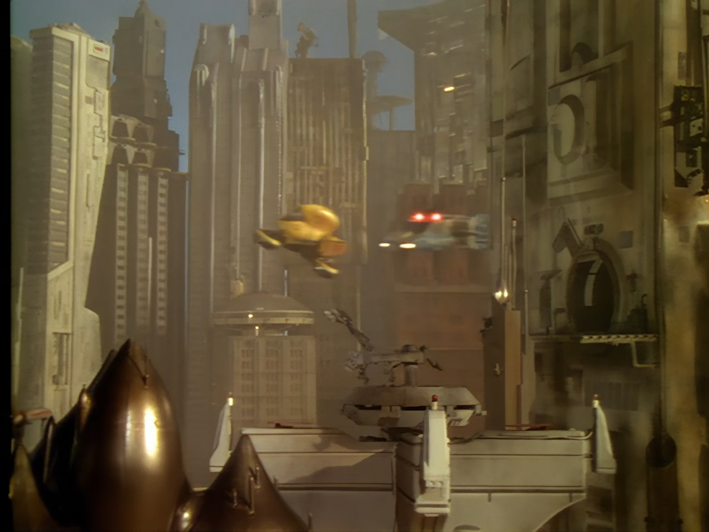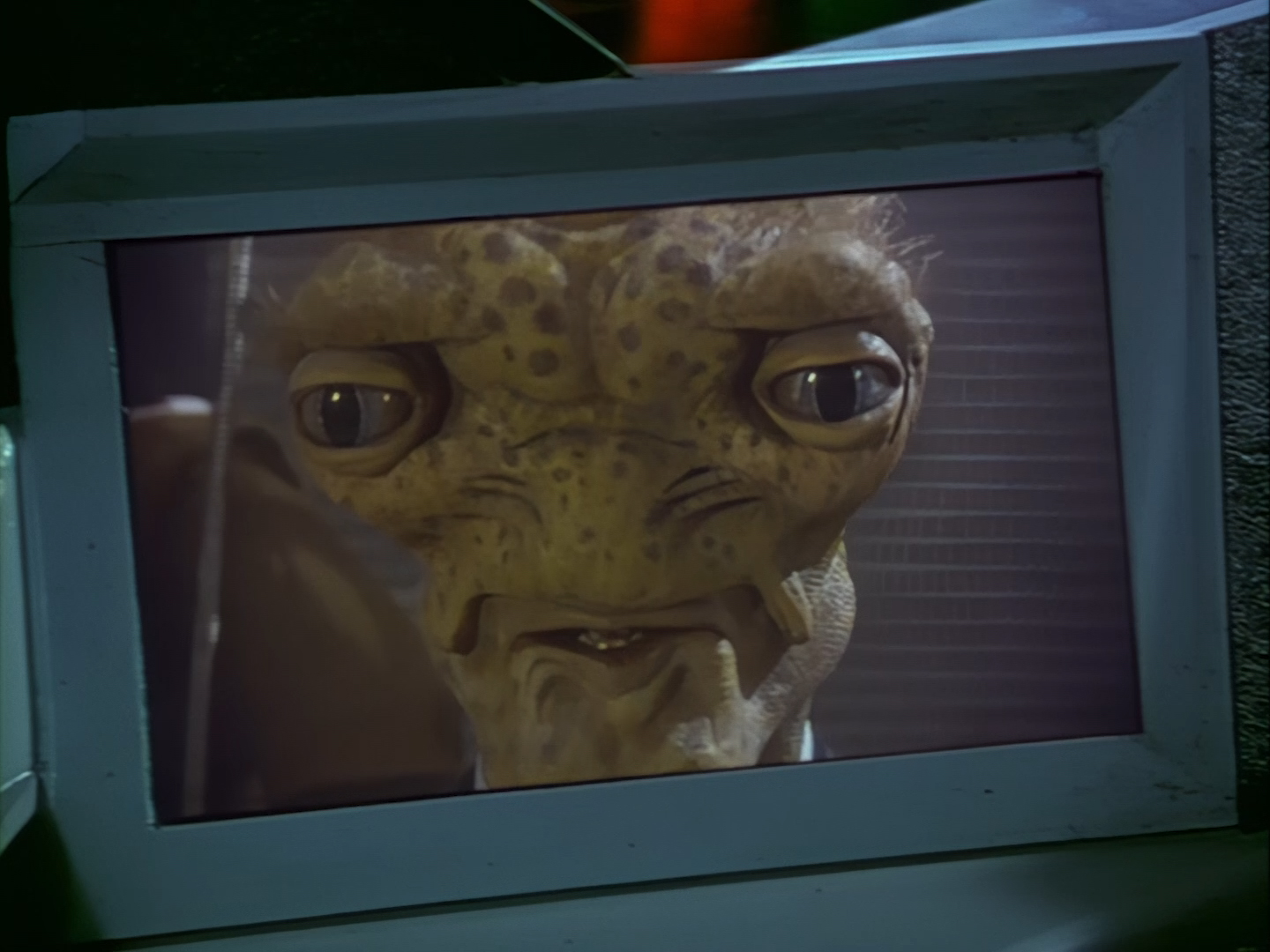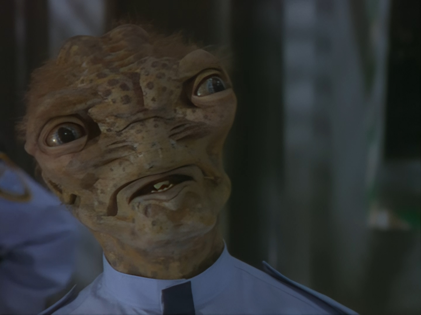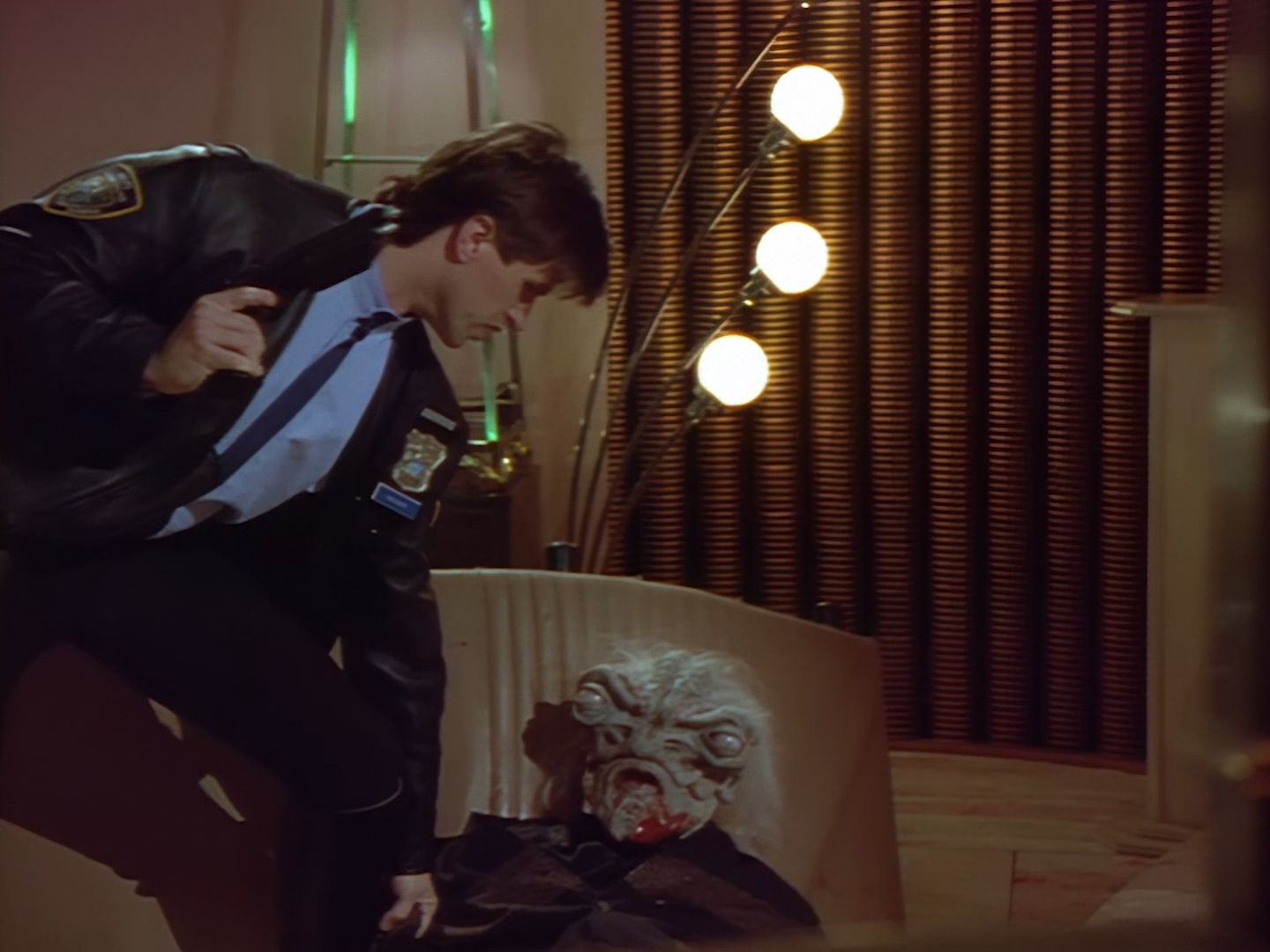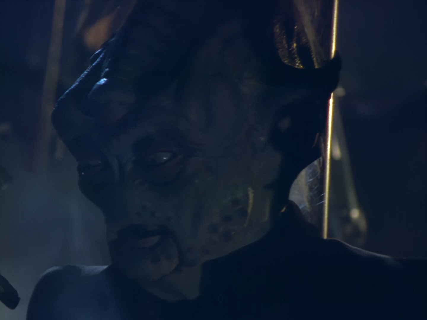 It becomes apparent that Brogan and Haldane are going to hover around outside for a bit which makes the two Creon cronies nervous. Nissim’s apartment is… well look, I’m no interior designer, and I know it was the 90s, but the idea that a crime lord on an alien planet in the future would have those curtains and that lamp shade is absurd. Not just absurd but distracting. The city outside just doesn’t match the apartment inside. That might be okay if it weren’t for the fact you also have two incredibly realistic-looking aliens standing on the set. It’s a major clash of styles and unfortunately this particular set isn’t the only casualty.