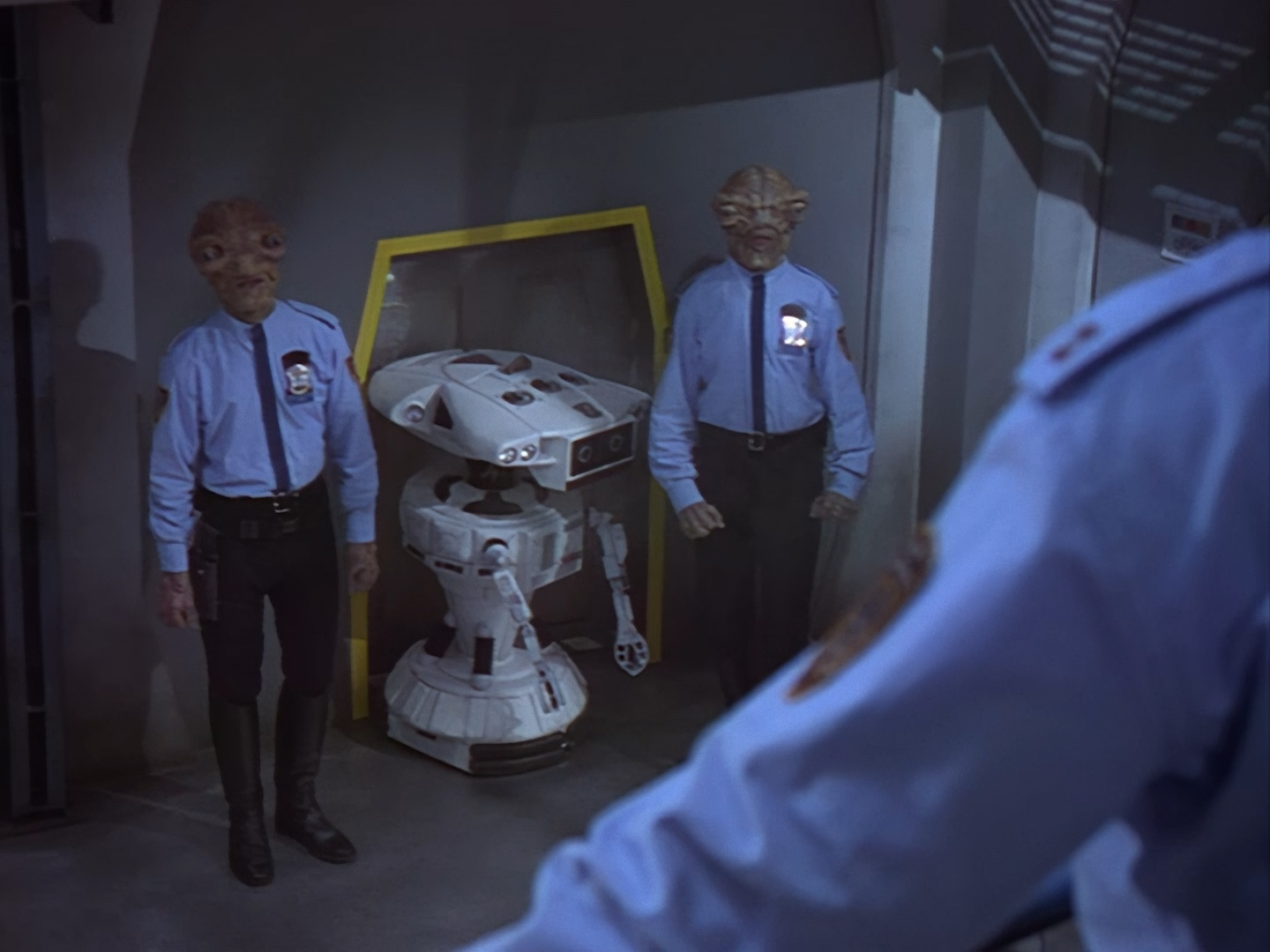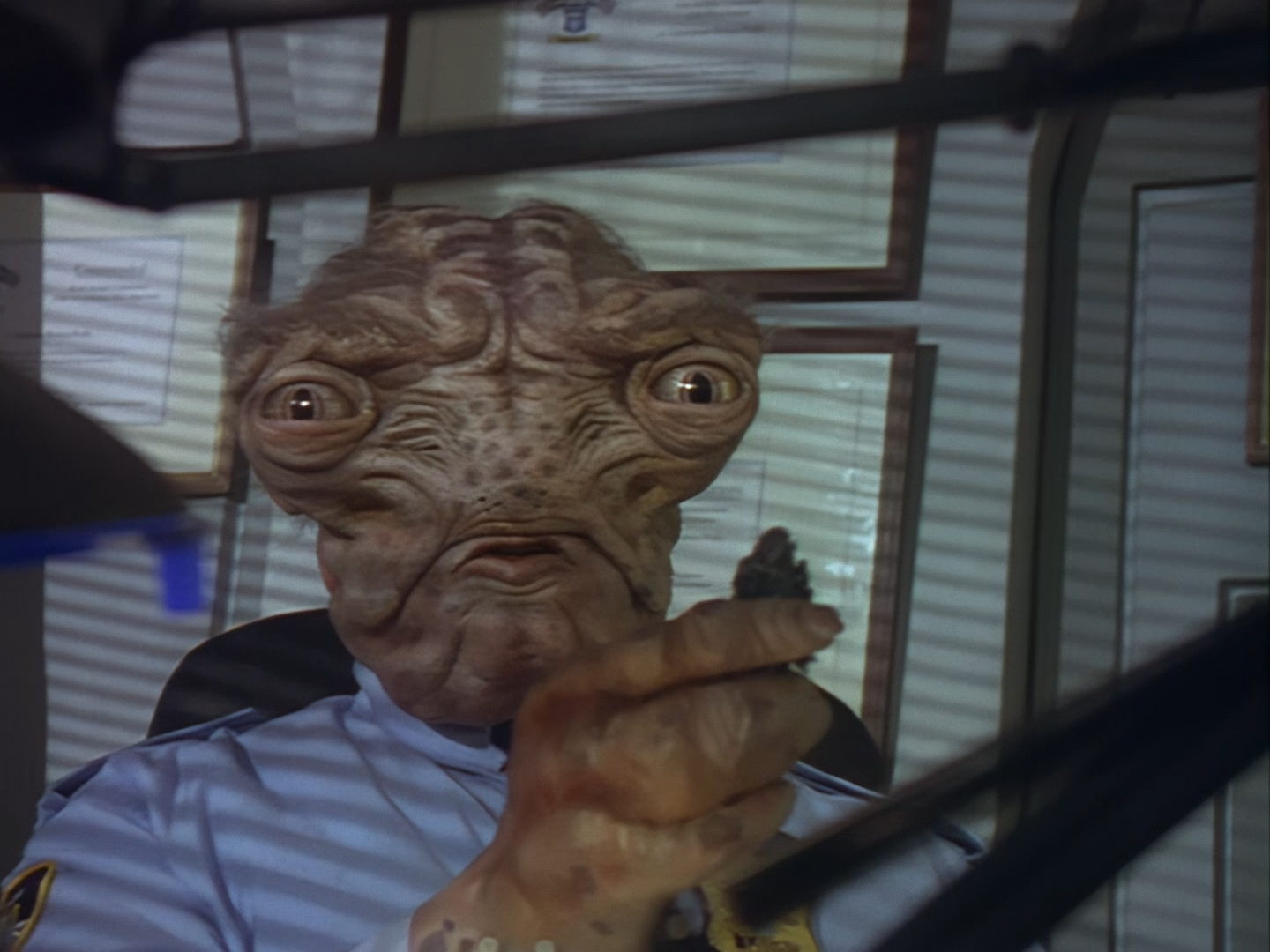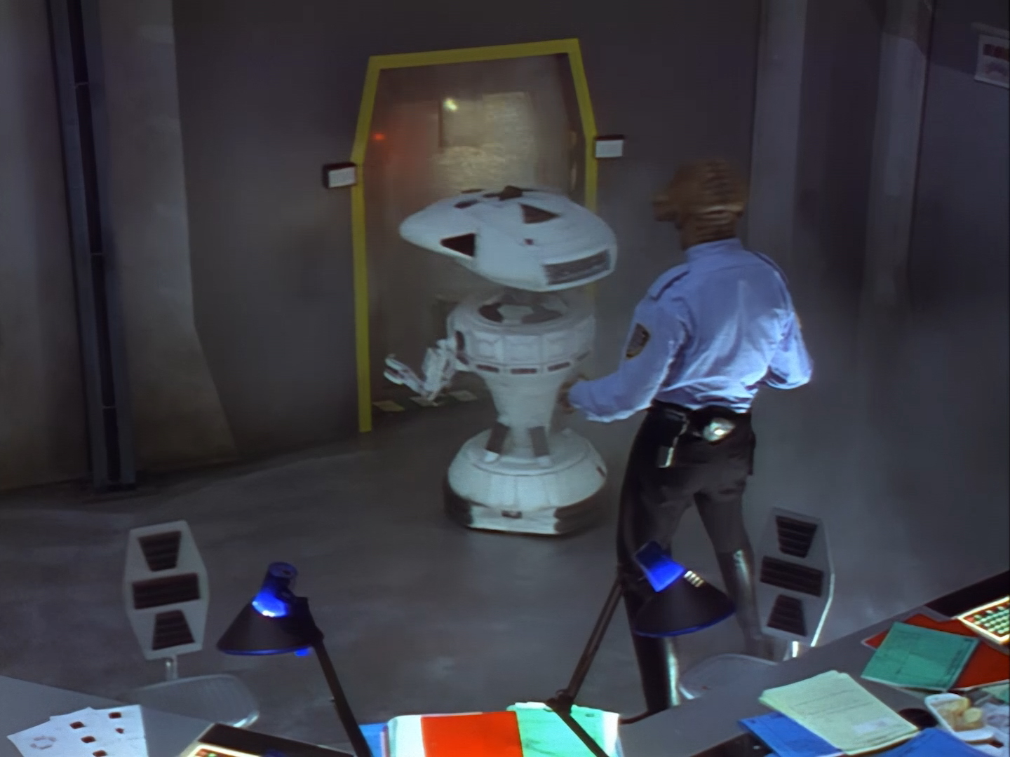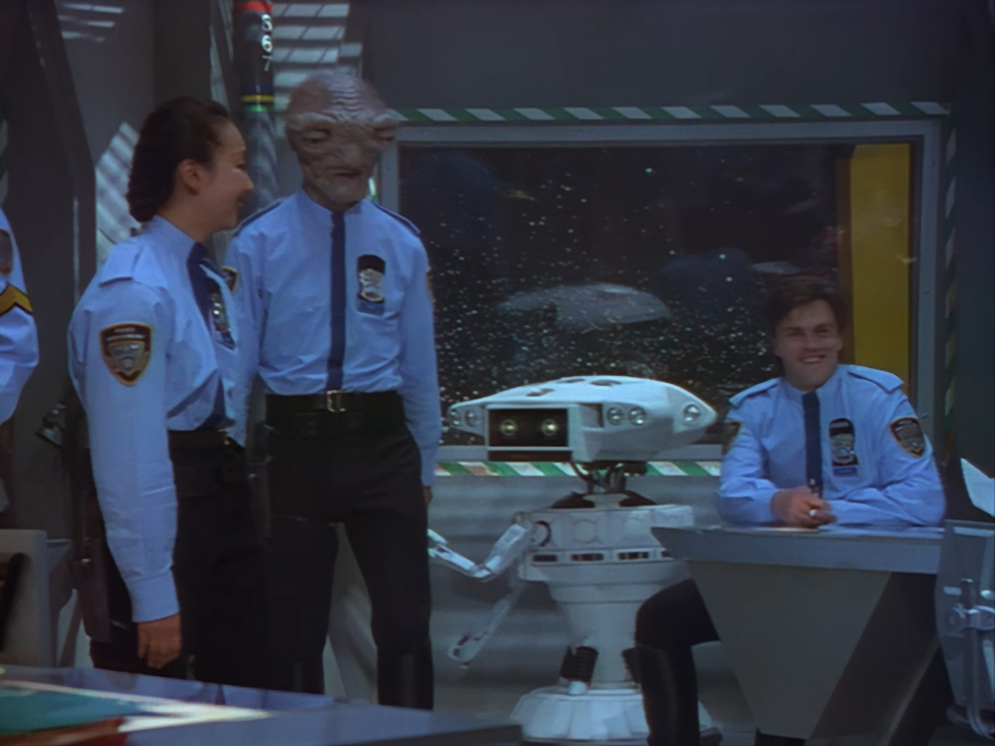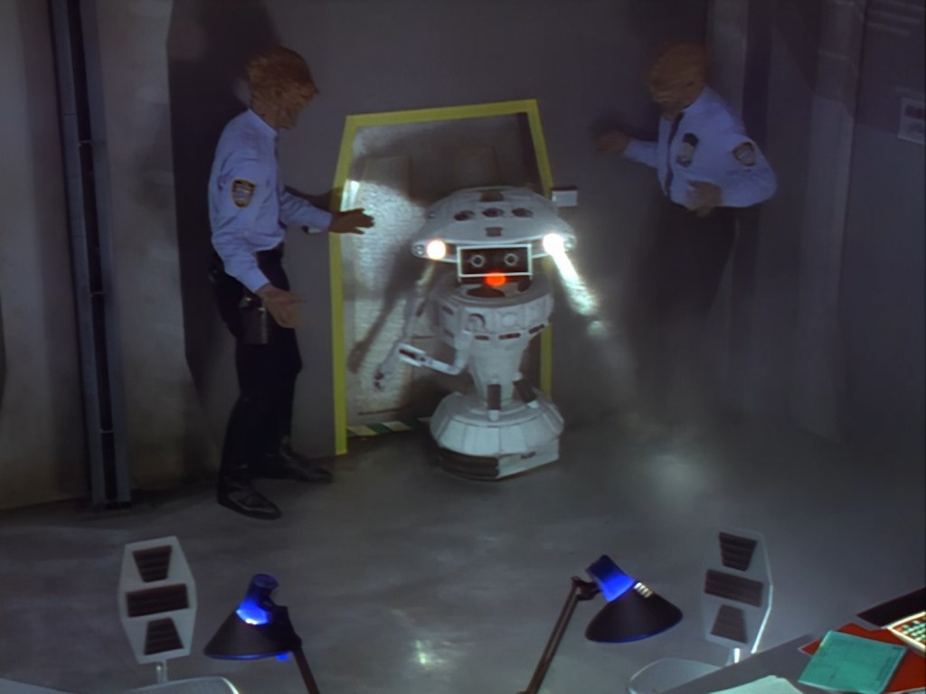 Oh look, it’s Slomo! The trouble with this not being a proper first episode is that characters just appear and disappear without a decent introduction. Other than Brogan, Slomo is the only character who was carried over from the original Space Police: Star Laws pilot in any meaningful way. Designed by David Dunsterville, built by Richard Gregory, and voiced by Gary Martin, Slomo is one of the most unique and charming characters in Space Precinct. The original exceedingly heavy prop survives to this day! As of summer 2024, Slomo resides in the collection of model builder and collector David Sisson.