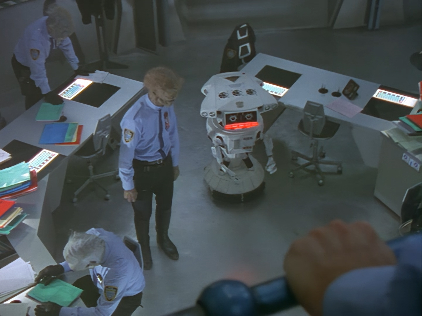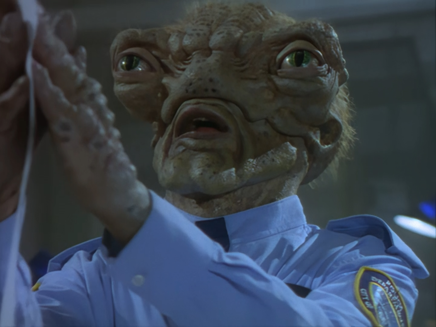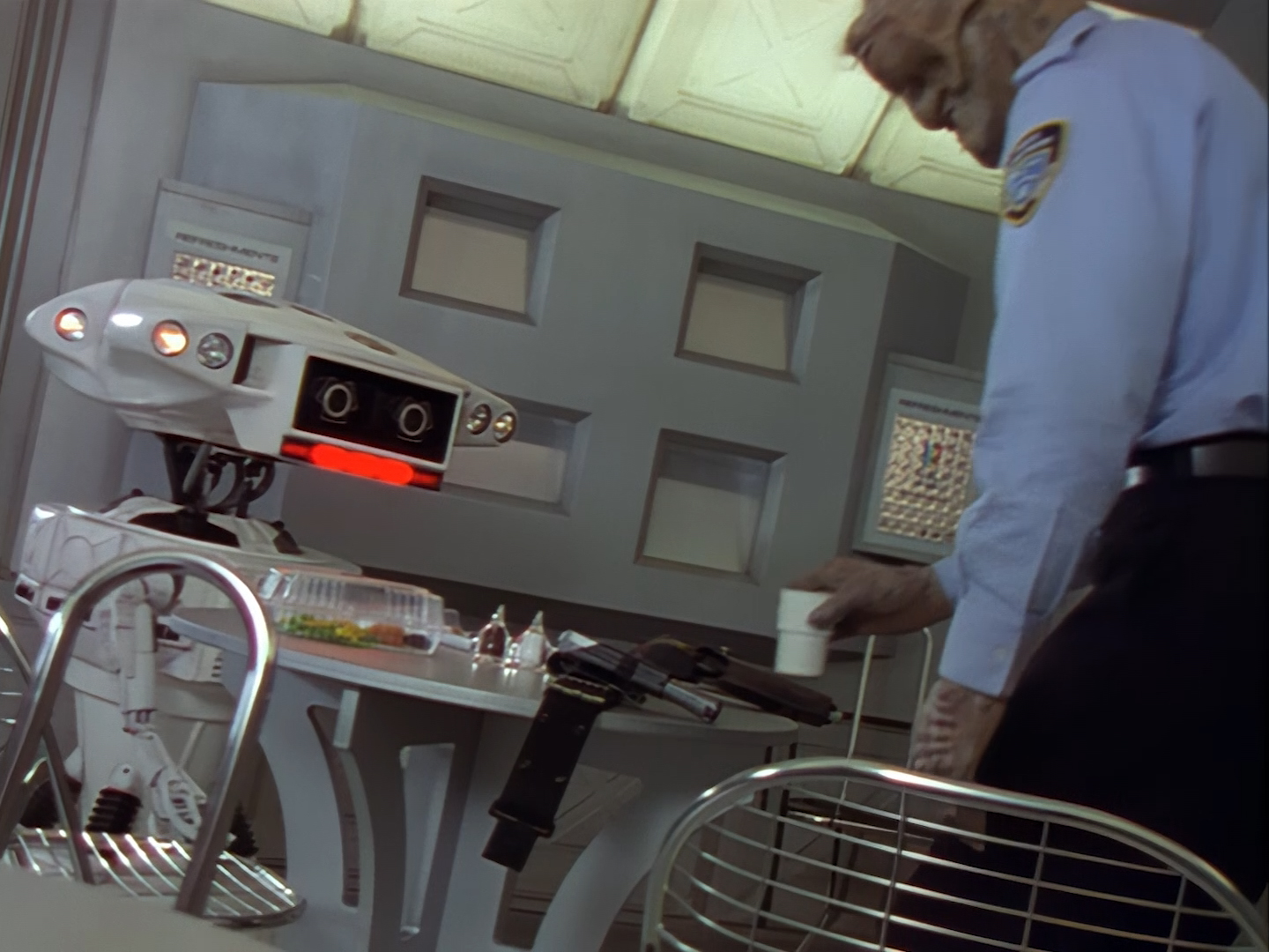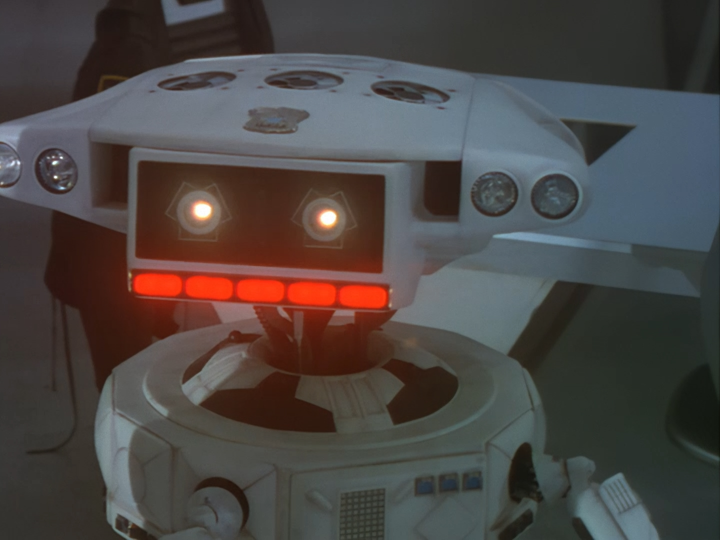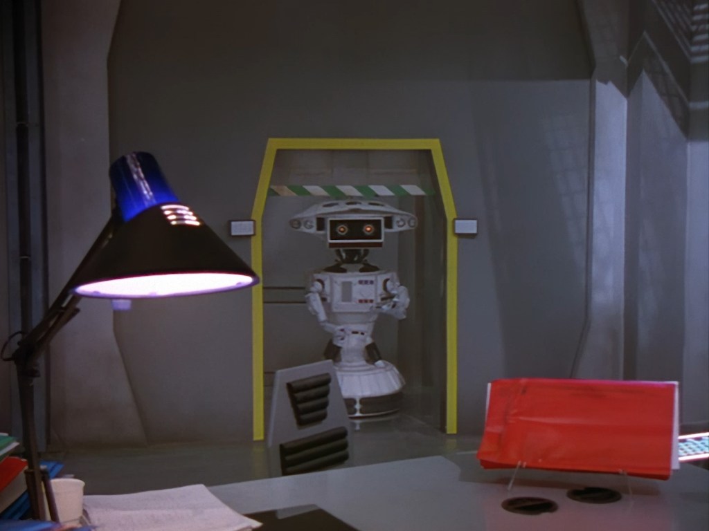 Oh look, it’s Slomo! The trouble with this not being a proper first episode is that characters just appear and disappear without a decent introduction. Other than Brogan, Slomo is the only character who was carried over from the original Space Police: Star Laws pilot in any meaningful way. Designed by David Dunsterville, built by Richard Gregory, and voiced by Gary Martin, Slomo is one of the most unique and charming characters in Space Precinct. The original exceedingly heavy prop survives to this day! As of summer 2024, Slomo resides in the collection of model builder and collector David Sisson.