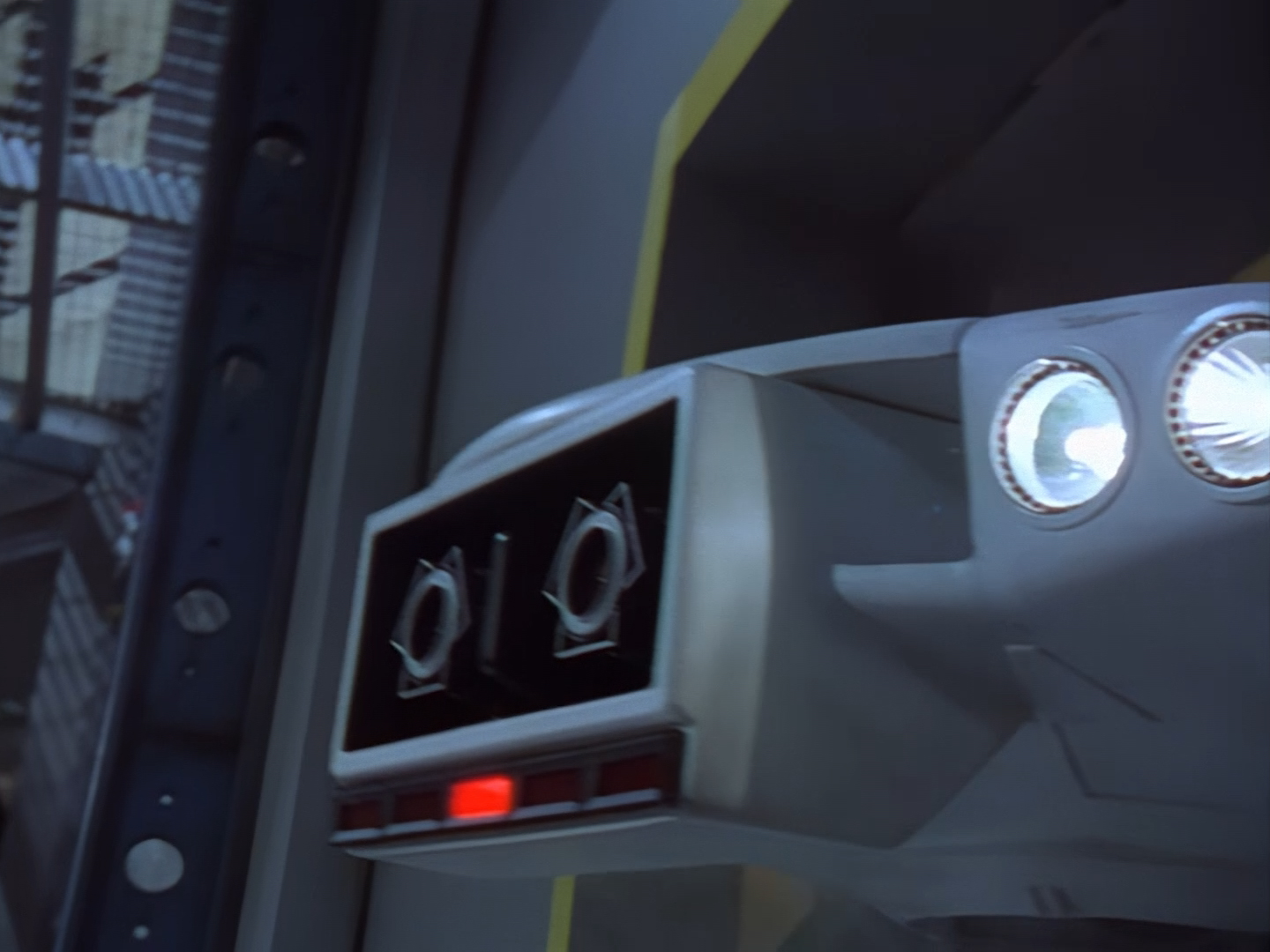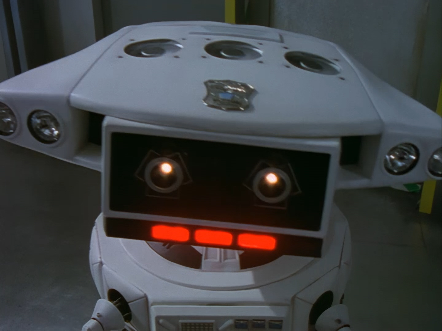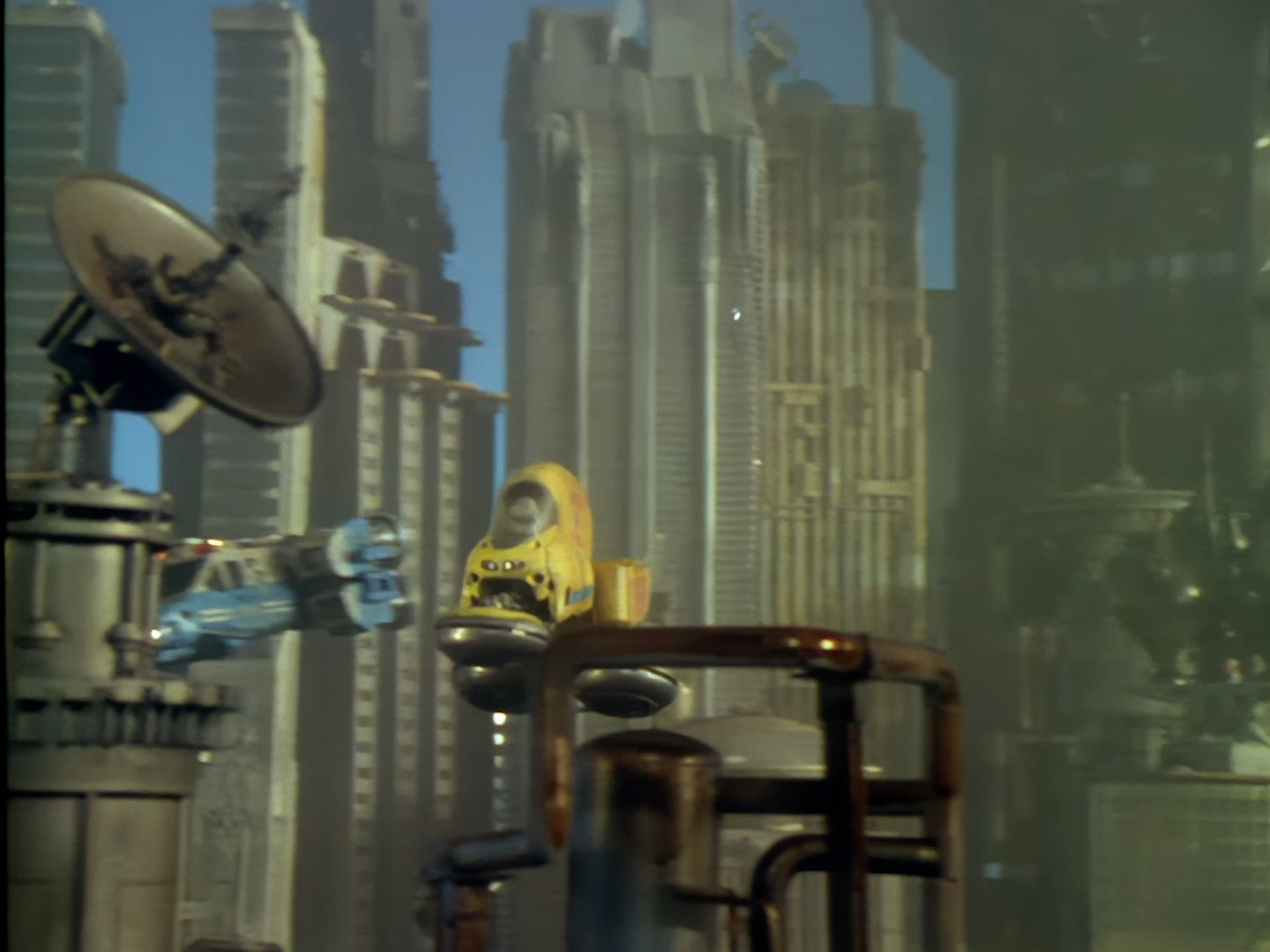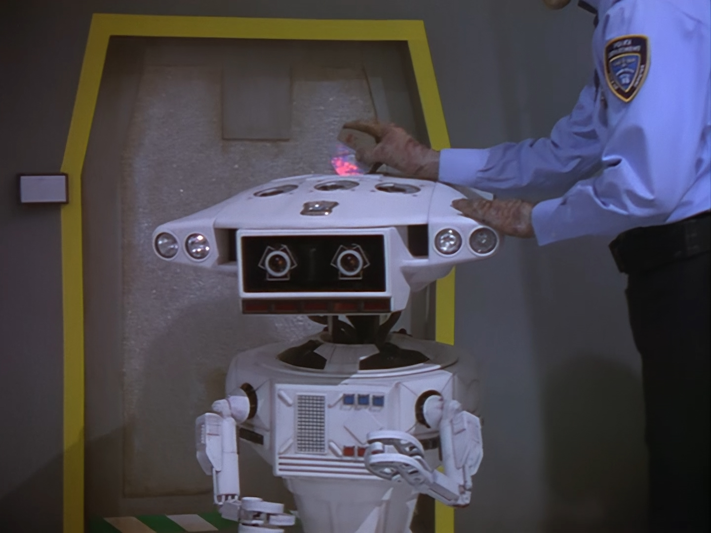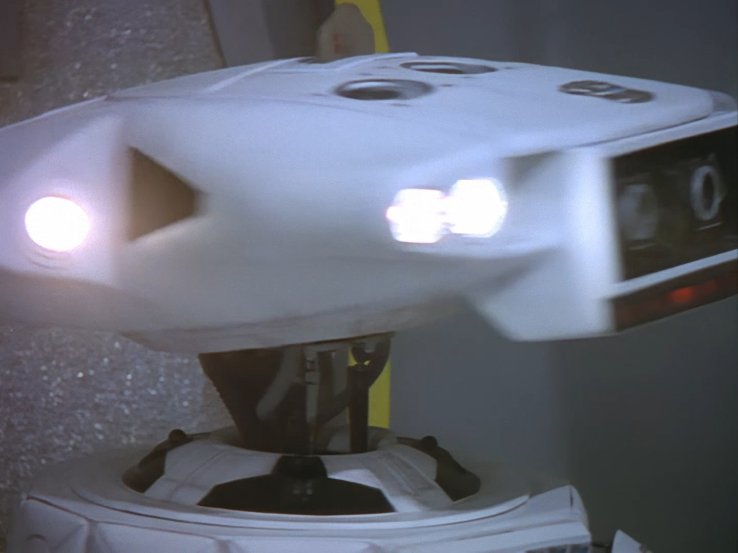 Oh look, it’s Slomo! The trouble with this not being a proper first episode is that characters just appear and disappear without a decent introduction. Other than Brogan, Slomo is the only character who was carried over from the original Space Police: Star Laws pilot in any meaningful way. Designed by David Dunsterville, built by Richard Gregory, and voiced by Gary Martin, Slomo is one of the most unique and charming characters in Space Precinct. The original exceedingly heavy prop survives to this day! As of summer 2024, Slomo resides in the collection of model builder and collector David Sisson.