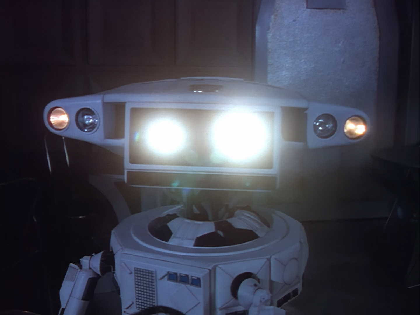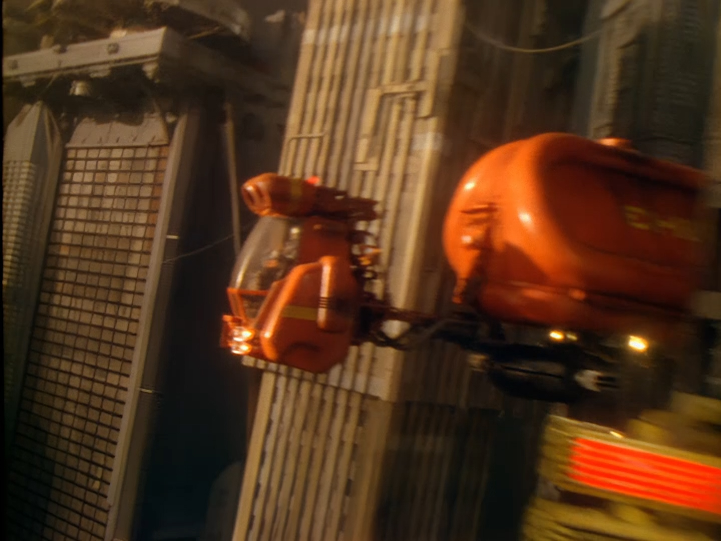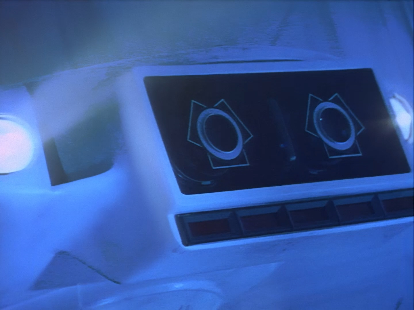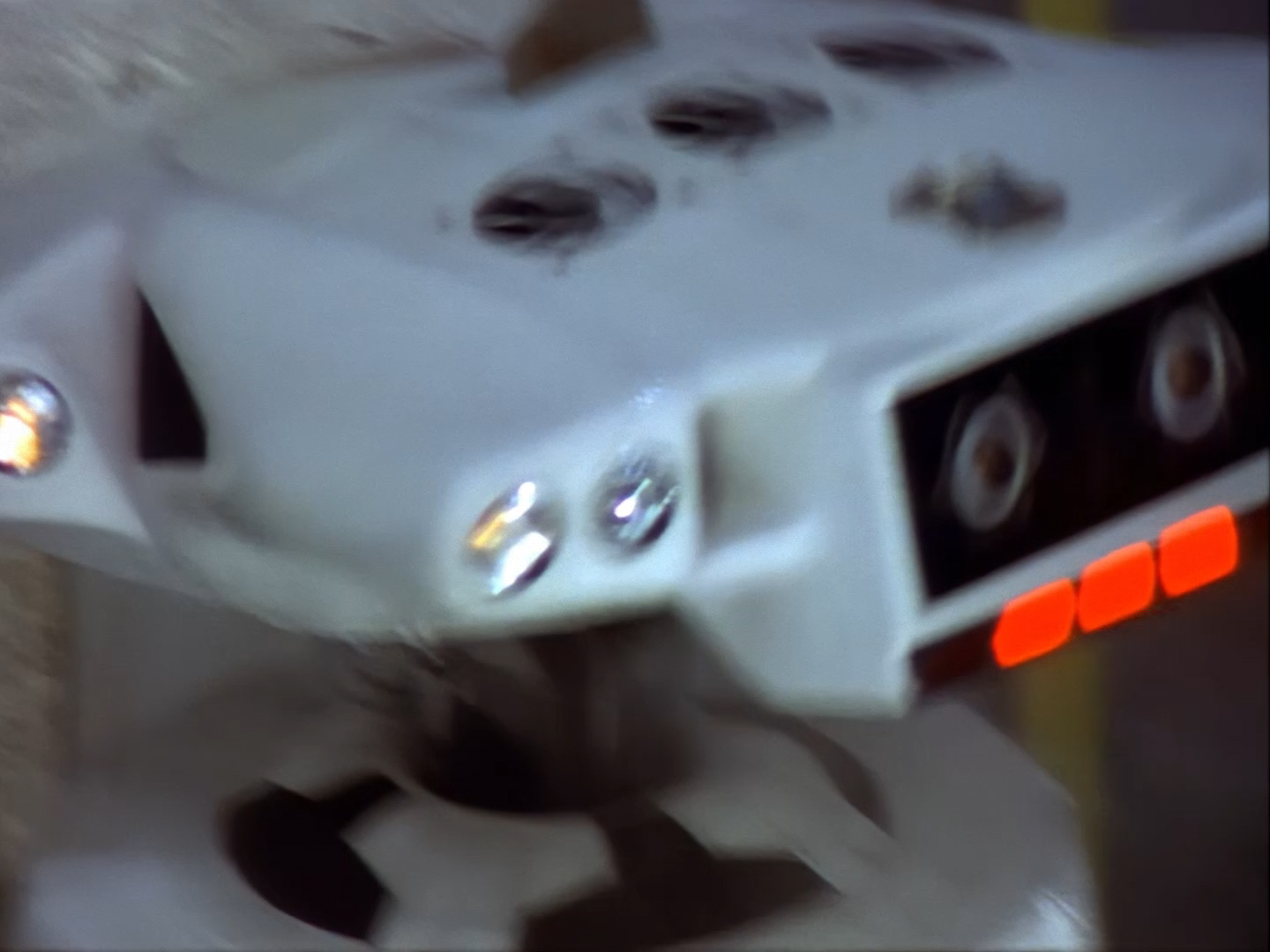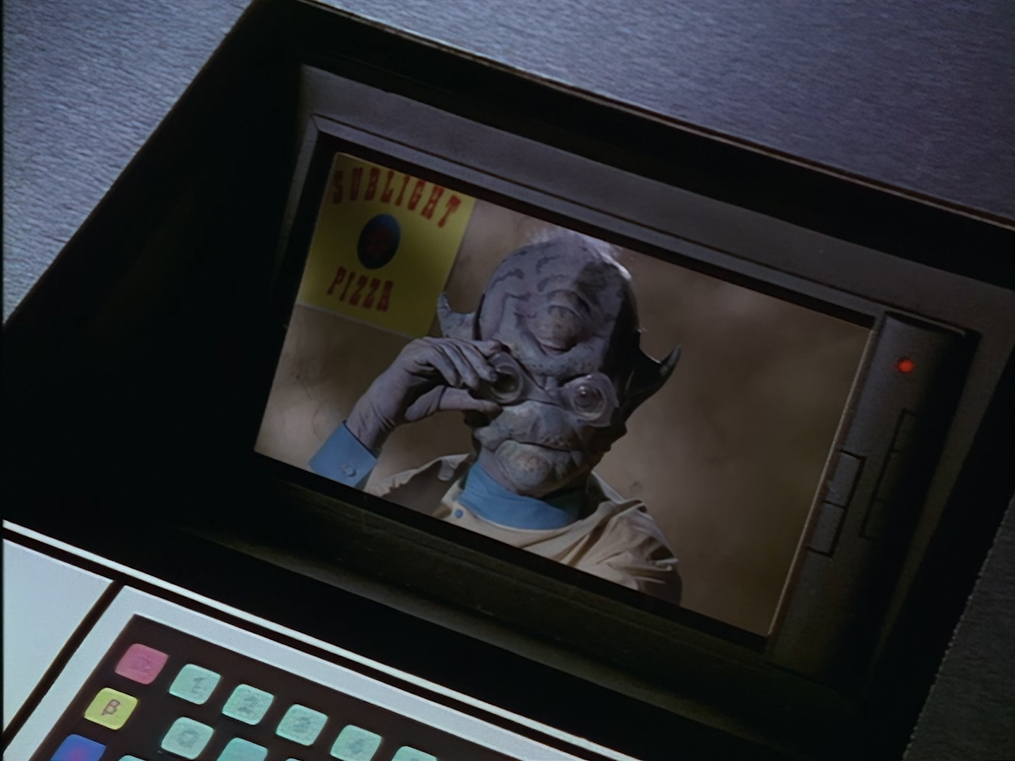 Oh look, it’s Slomo! The trouble with this not being a proper first episode is that characters just appear and disappear without a decent introduction. Other than Brogan, Slomo is the only character who was carried over from the original Space Police: Star Laws pilot in any meaningful way. Designed by David Dunsterville, built by Richard Gregory, and voiced by Gary Martin, Slomo is one of the most unique and charming characters in Space Precinct. The original exceedingly heavy prop survives to this day! As of summer 2024, Slomo resides in the collection of model builder and collector David Sisson.