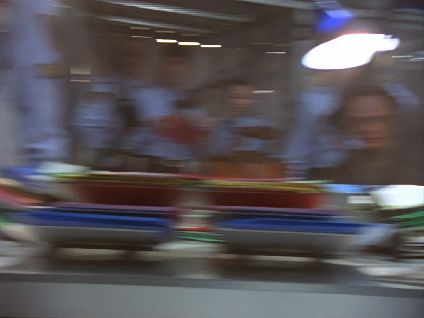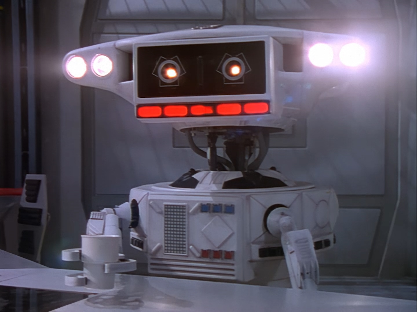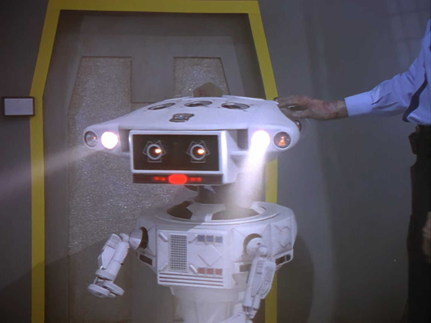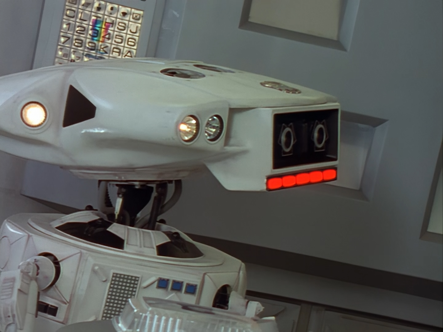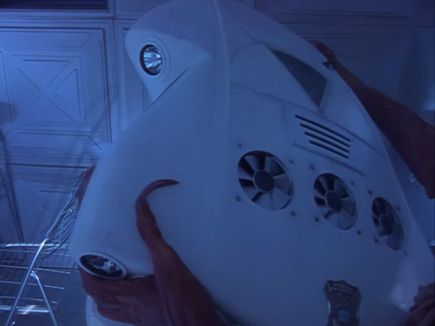 Oh look, it’s Slomo! The trouble with this not being a proper first episode is that characters just appear and disappear without a decent introduction. Other than Brogan, Slomo is the only character who was carried over from the original Space Police: Star Laws pilot in any meaningful way. Designed by David Dunsterville, built by Richard Gregory, and voiced by Gary Martin, Slomo is one of the most unique and charming characters in Space Precinct. The original exceedingly heavy prop survives to this day! As of summer 2024, Slomo resides in the collection of model builder and collector David Sisson.