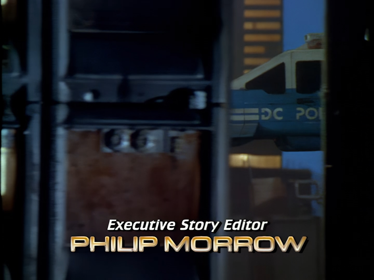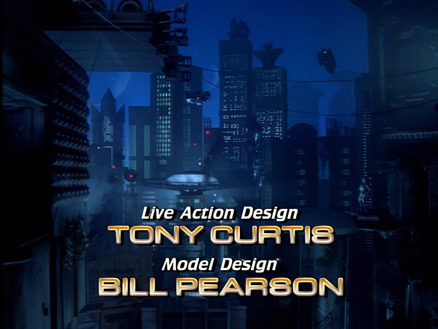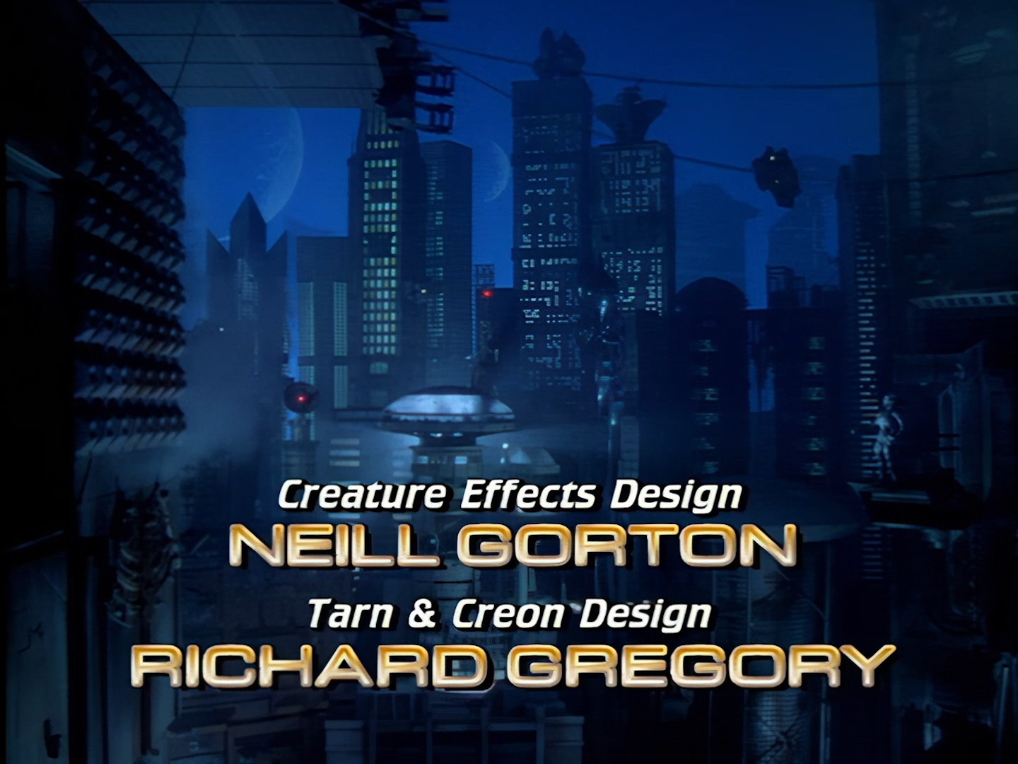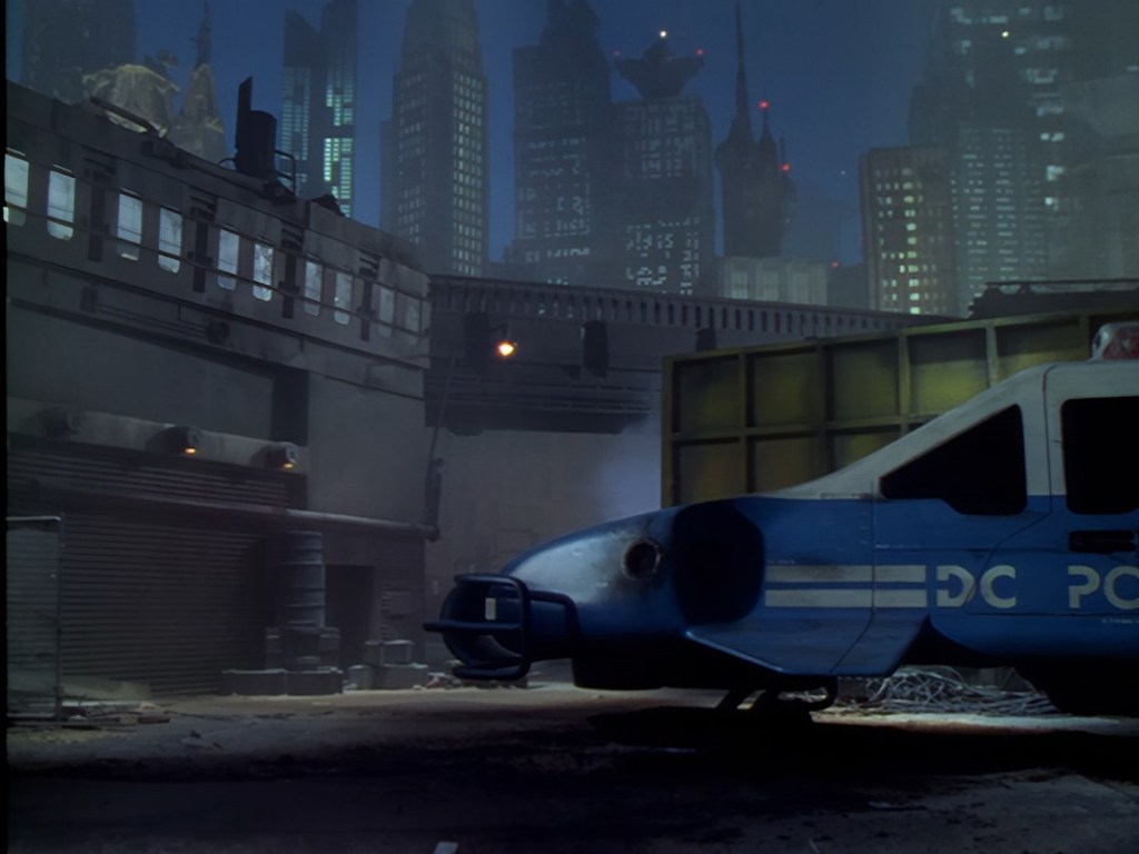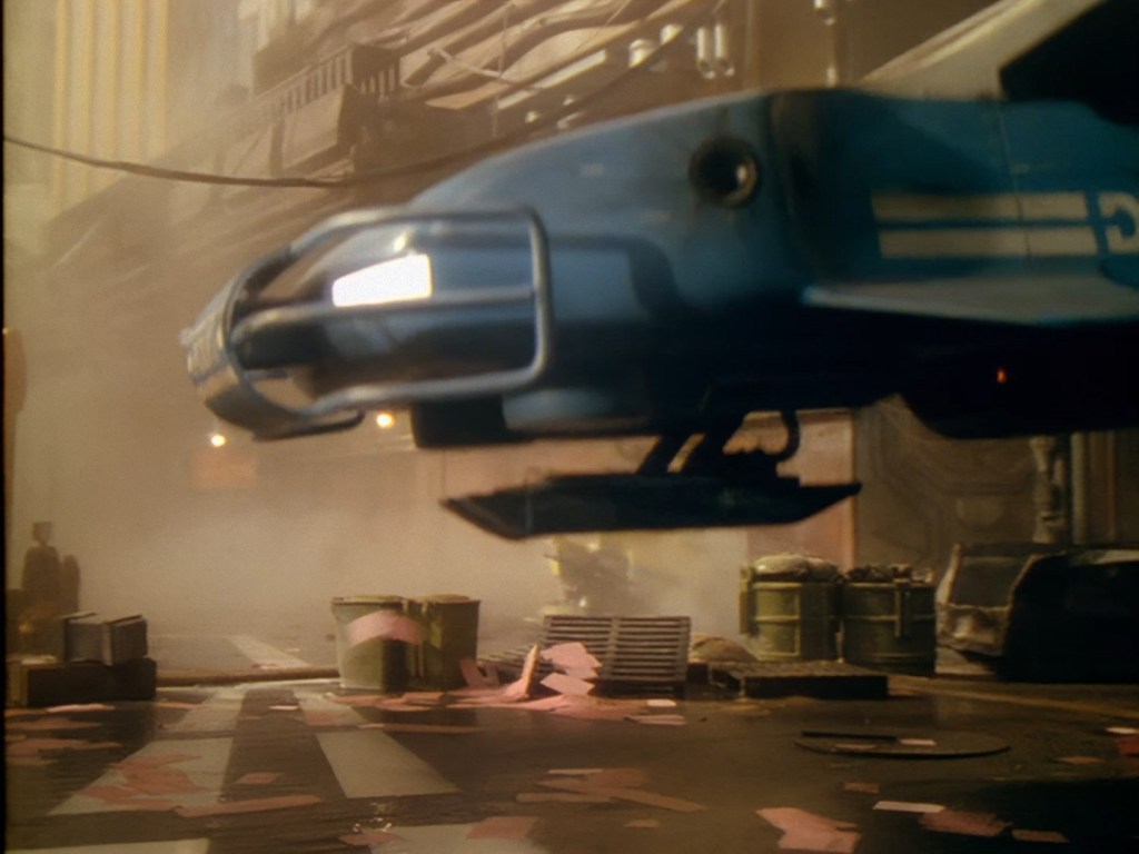 A few more credits as the episode begins proper on moody shots of Demeter City at night. We’ll discuss many of these names in more detail throughout these reviews, but one thing I will call out early on though is that Tony Curtis was a very experienced art director and production designer, which is… well… surprising for reasons we’ll discuss at length throughout these reviews. Let’s just say I find that the live action set design is one of the weaker elements of Space Precinct‘s overall look. Meanwhile the likes of Bill Pearson, Neill Gorton and Richard Gregory undoubtedly provide some of the most memorable design elements of the entire series with their models, prosthetics and animatronics.