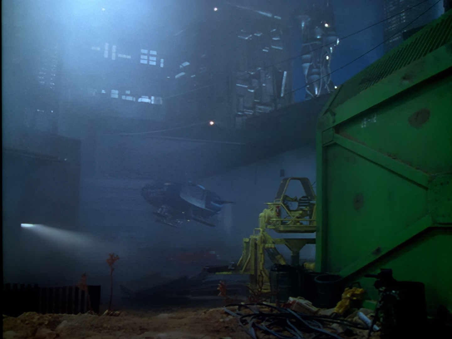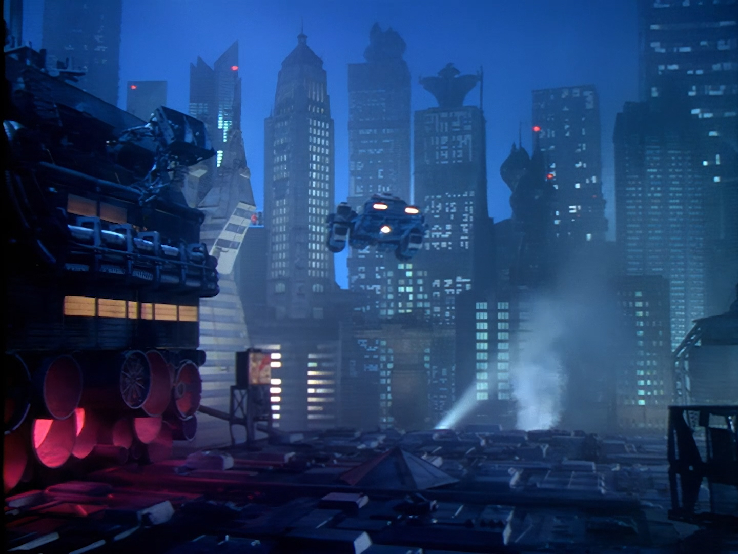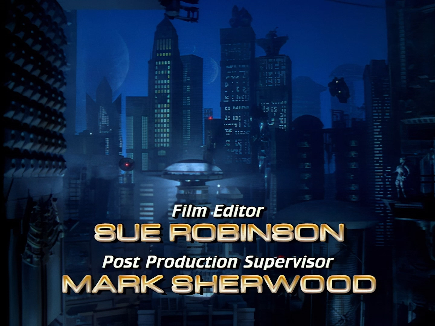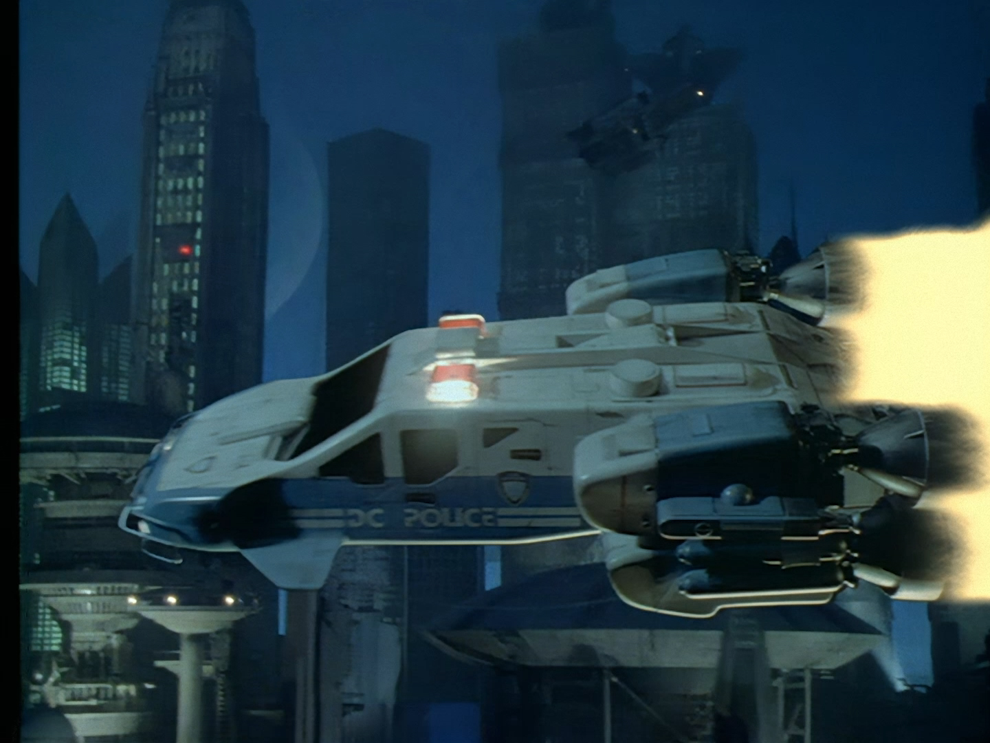 A few more credits as the episode begins proper on moody shots of Demeter City at night. We’ll discuss many of these names in more detail throughout these reviews, but one thing I will call out early on though is that Tony Curtis was a very experienced art director and production designer, which is… well… surprising for reasons we’ll discuss at length throughout these reviews. Let’s just say I find that the live action set design is one of the weaker elements of Space Precinct‘s overall look. Meanwhile the likes of Bill Pearson, Neill Gorton and Richard Gregory undoubtedly provide some of the most memorable design elements of the entire series with their models, prosthetics and animatronics.