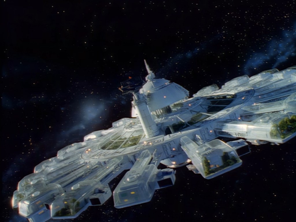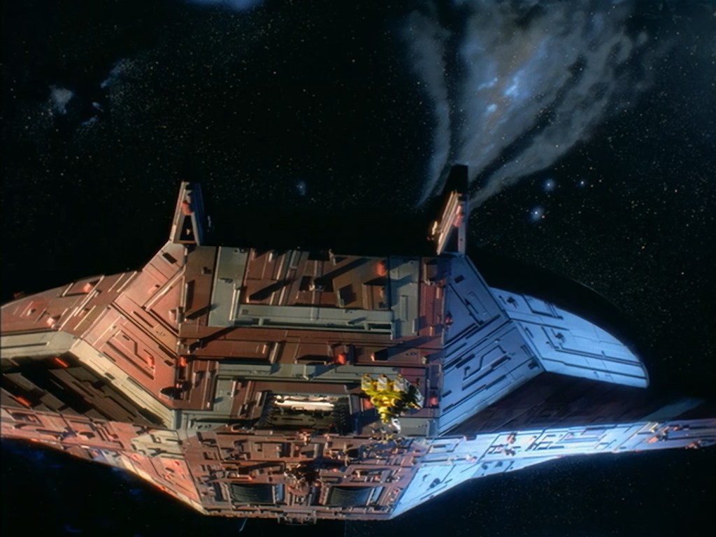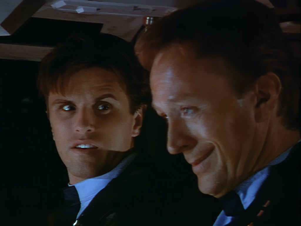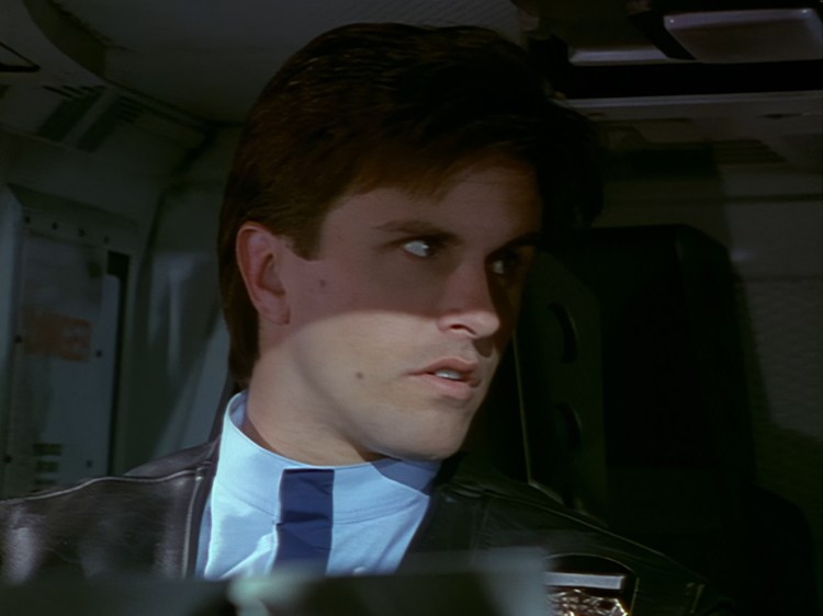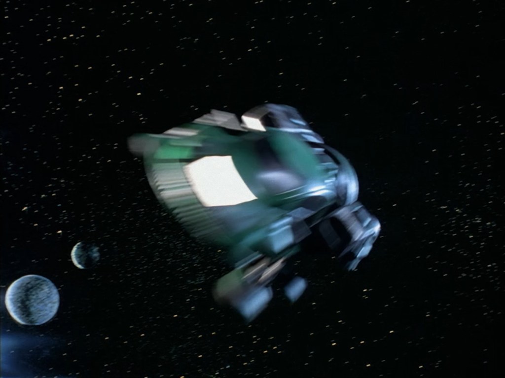 Devil’s advocate time: Maybe the narration over the opening titles is all the introduction we need? Yes, Ted Shackelford earns his top billing by starting the show with a brief explanation of who Brogan is and what he’s doing in space. It’s not much, but it’s something! It’s an exciting buildup and coupled with Crispin Merrell’s music I’m already on the edge of my seat. The computer generated graphics hold up well enough, probably holding up even better than ever thanks to the AI upscaling techniques which have brought the series into high definition for this Blu-ray release. Here’s a super minor thing to point out – the standard definition version of this episode released on DVD starts with “Grove Television Enterprises Presents” rather than “GTV Presents” as seen here on Blu-ray. Aren’t you glad I pointed that out? I bet it makes a world of difference.
