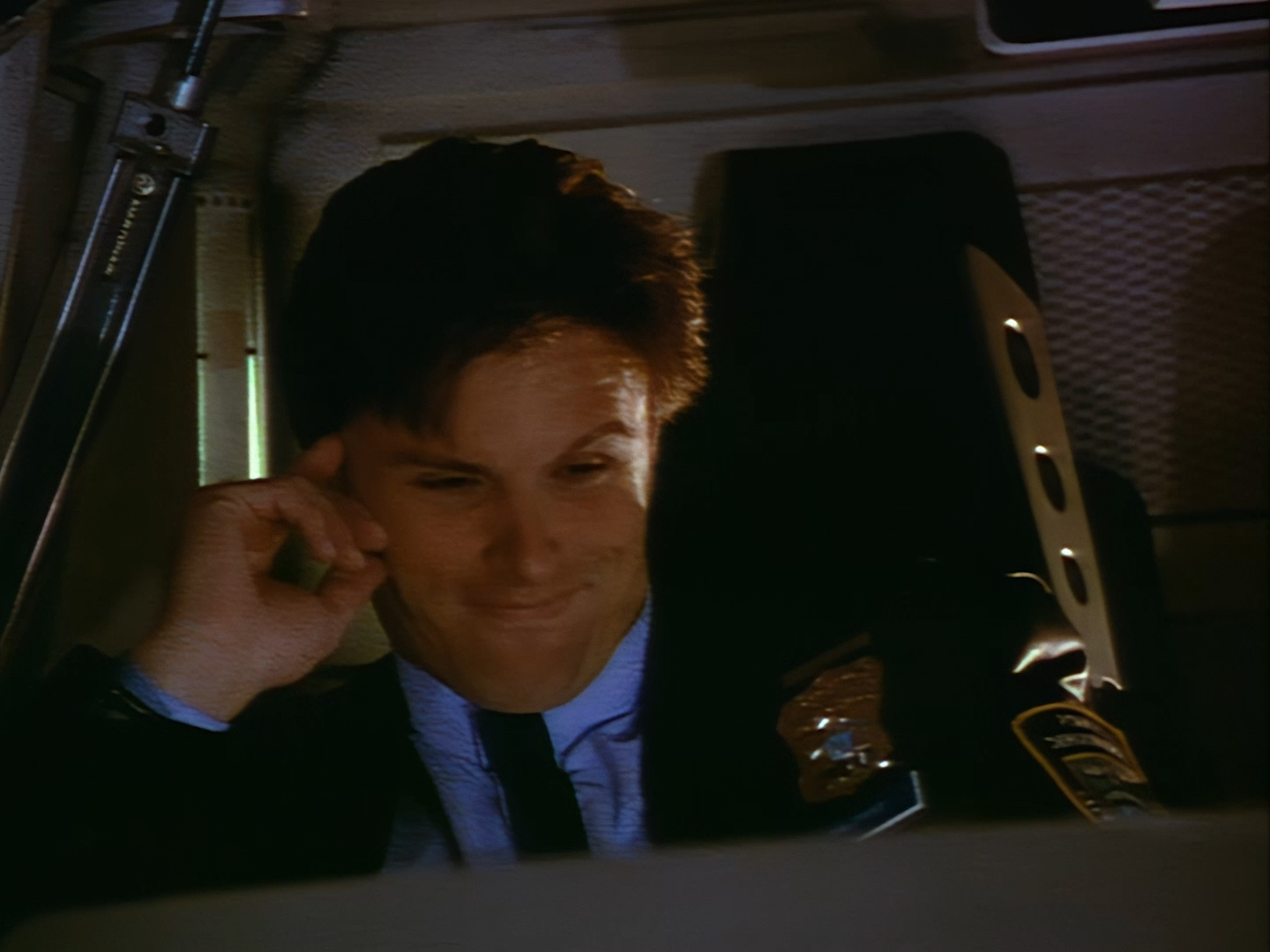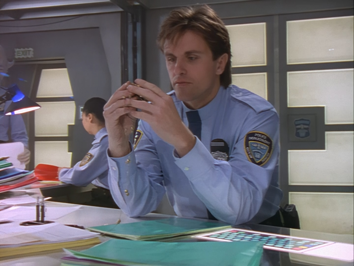 The director makes very clever use of the two-level set as Fredo reveals the length of receipts that Beezle has supposedly generated from costly “interstellar dispatches” billed to the department. It’s a bit of a cliché, but I enjoy Fredo as a no-nonsense desk sergeant chasing up the other officers for the various annoyances they cause. It’s a much more subtle and fitting way of introducing some light relief to the show.