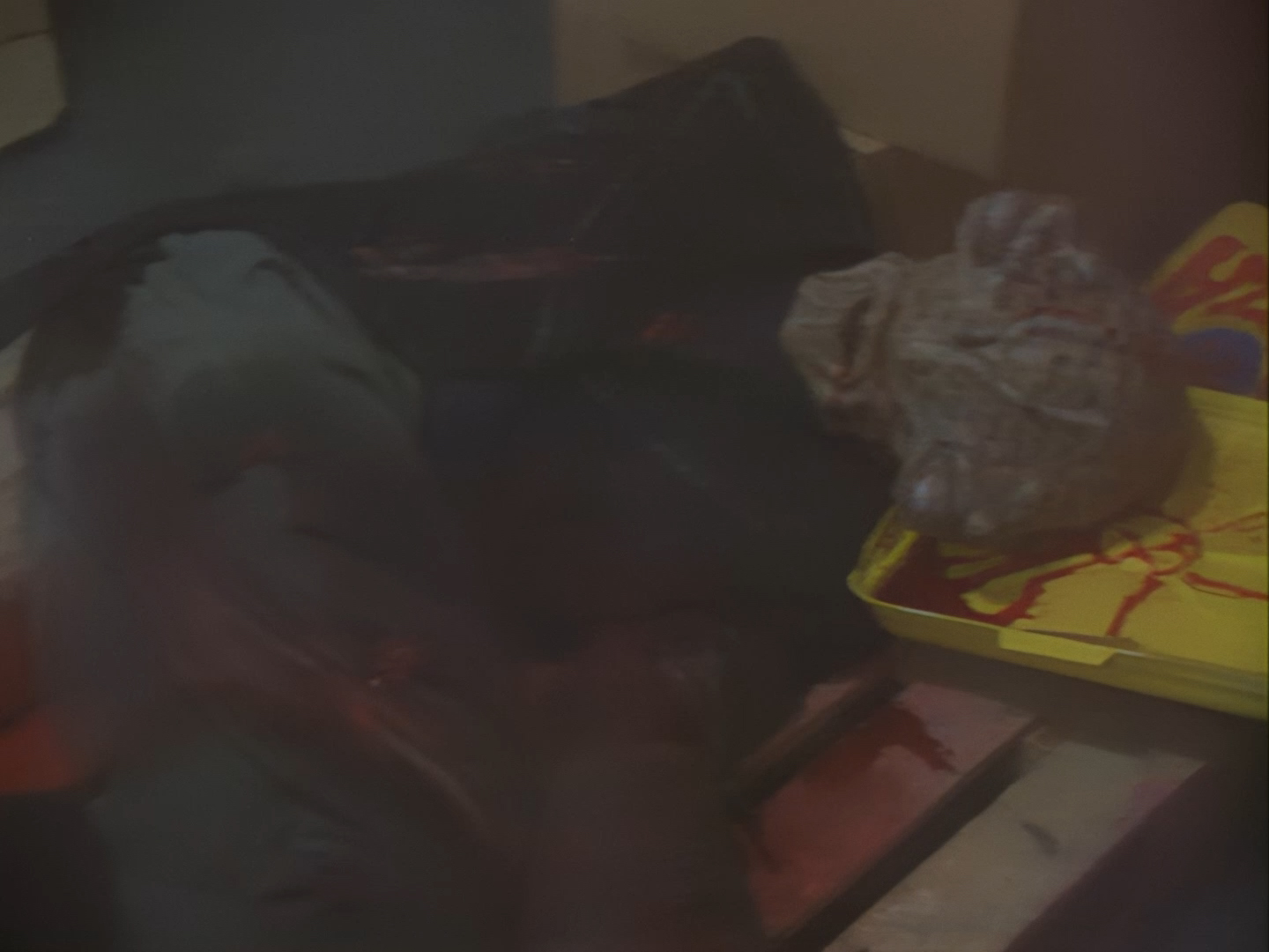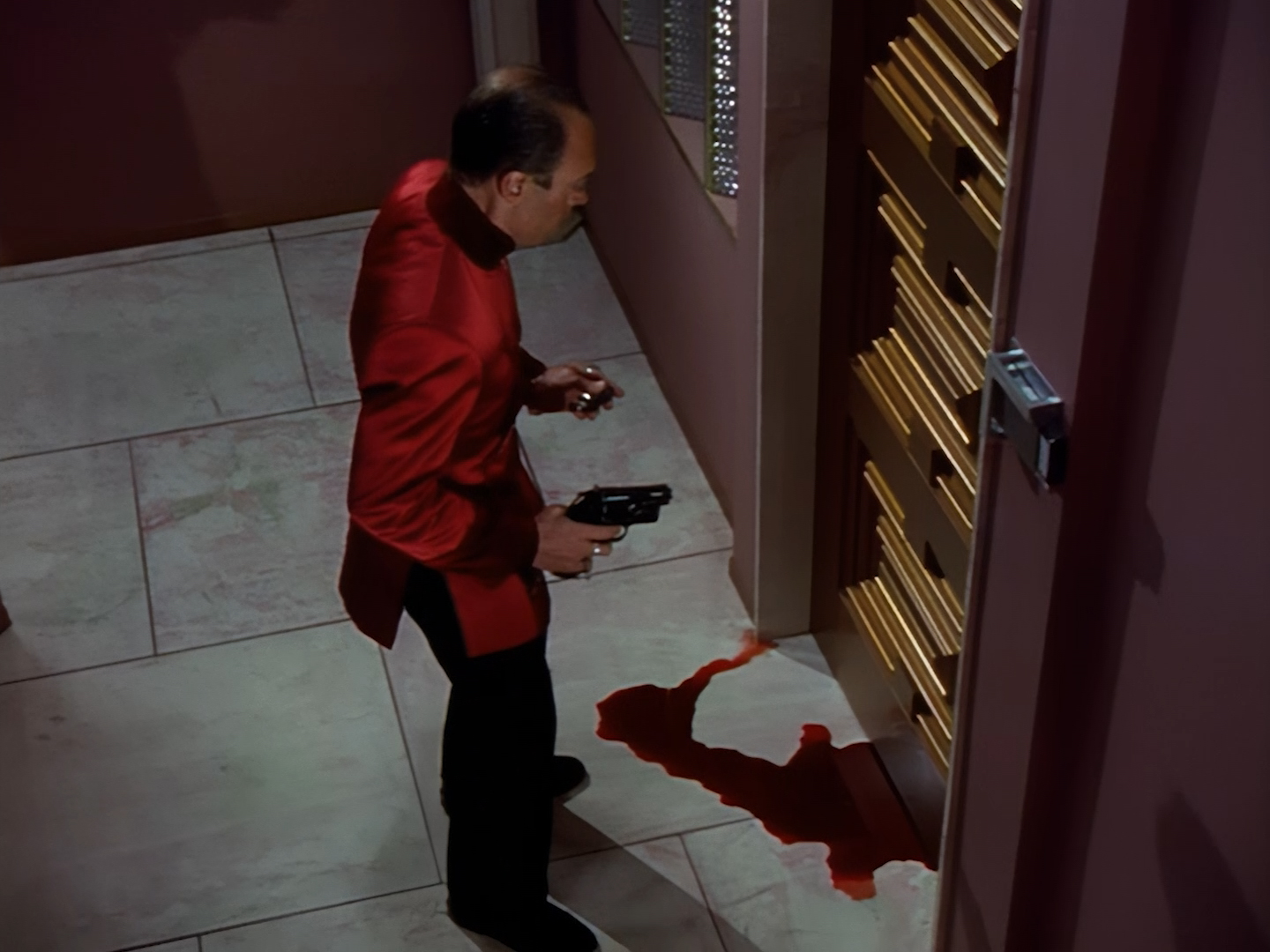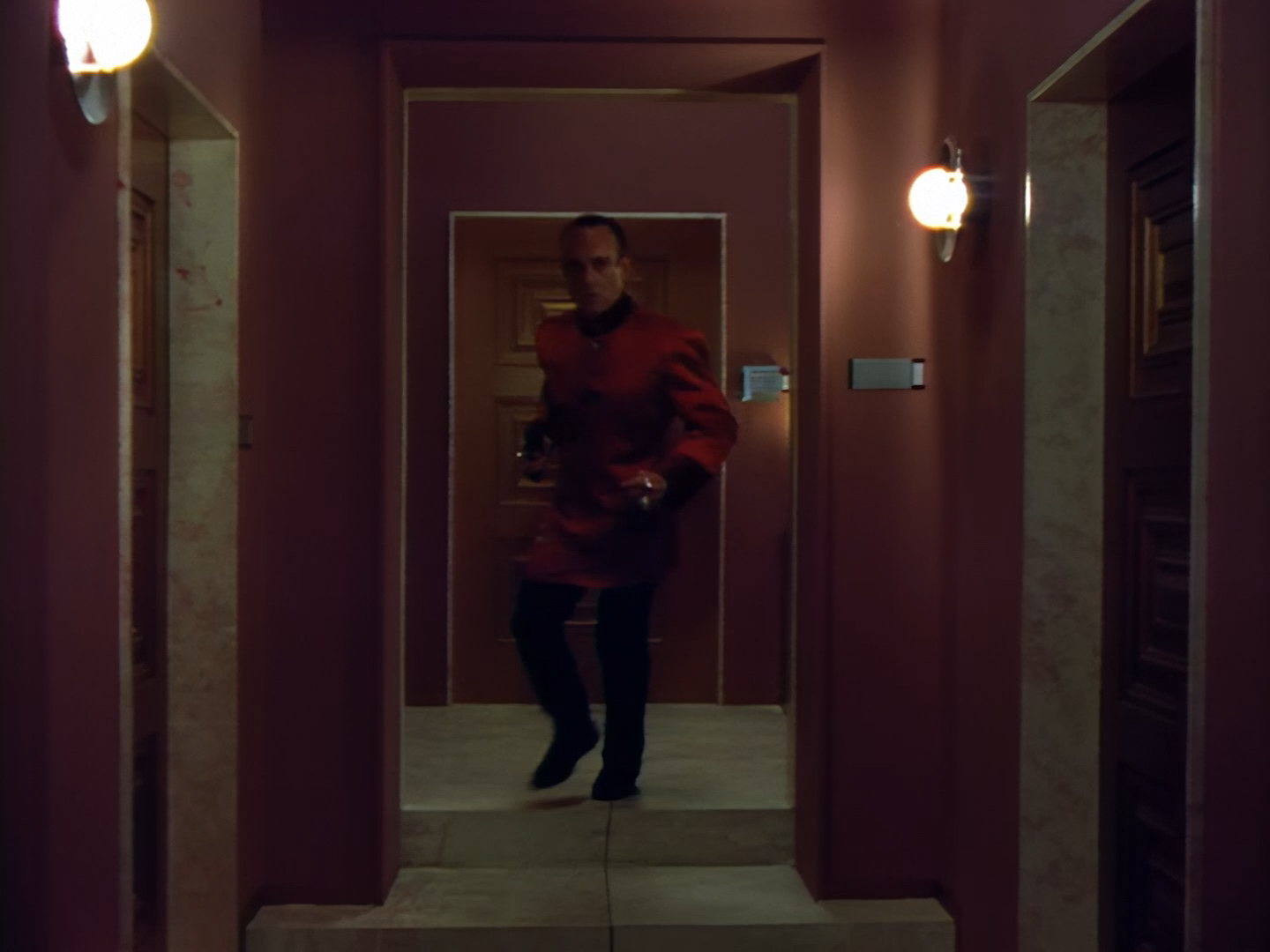 Someone screams, so a very ordinary looking gun comes out as Nissim makes his way back through a hideously decorated hallway to the apartment. Either someone’s brought a lot of unwanted ketchup to this pizza party or…
