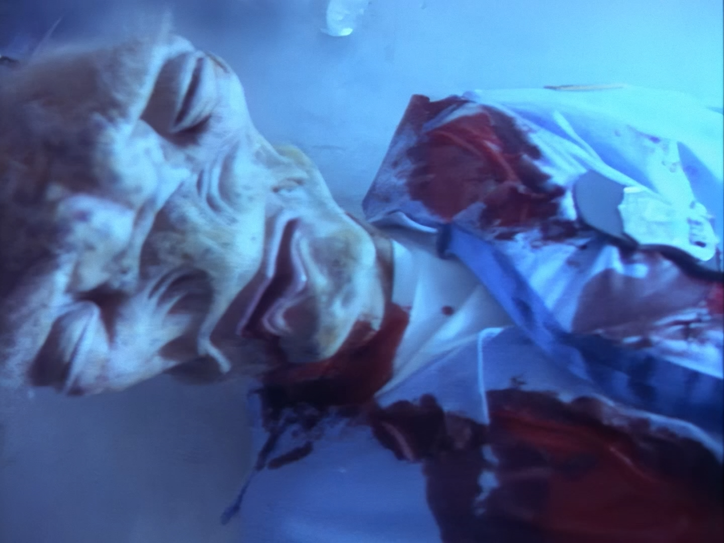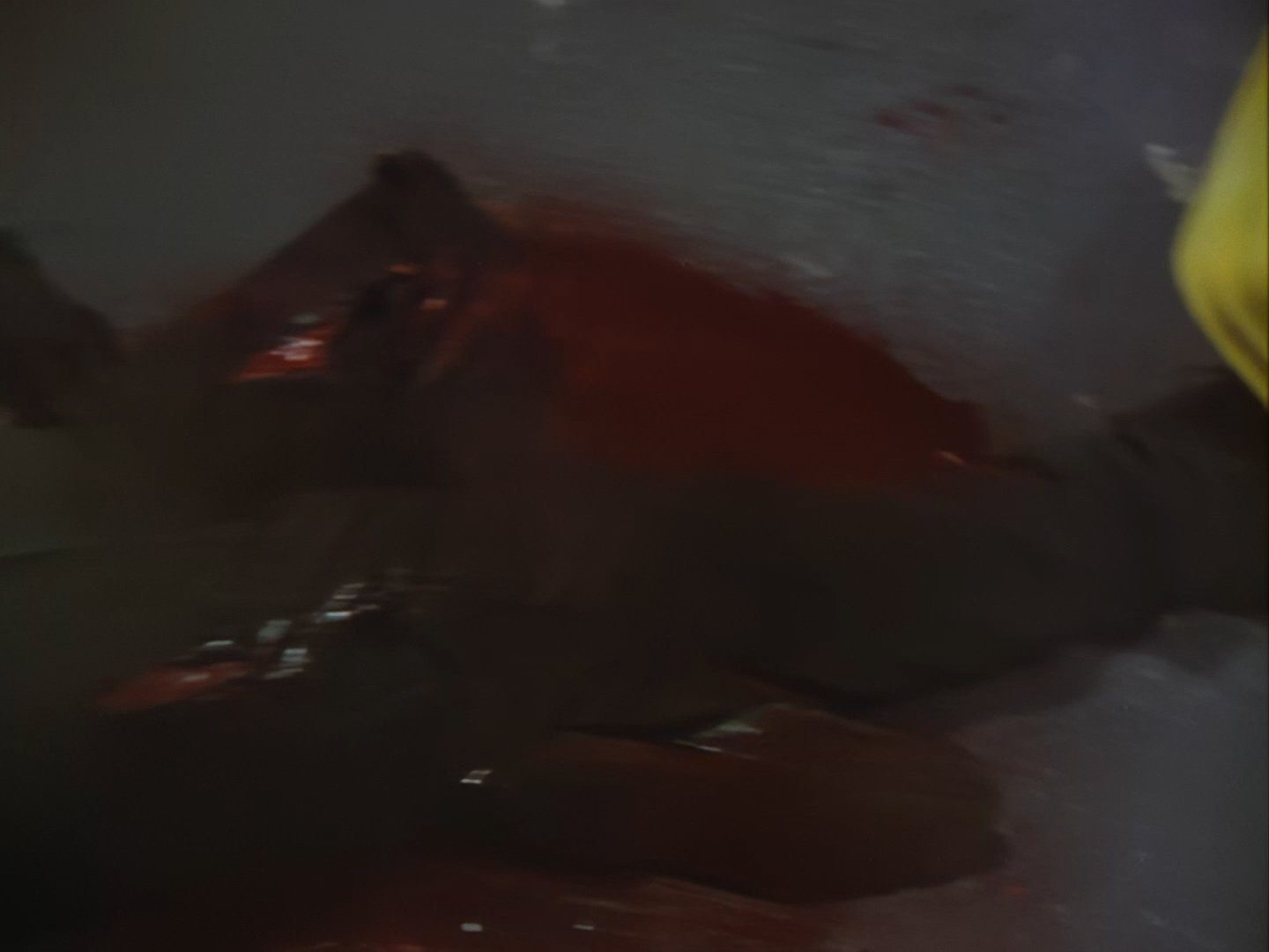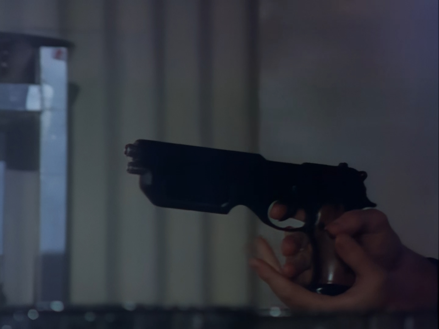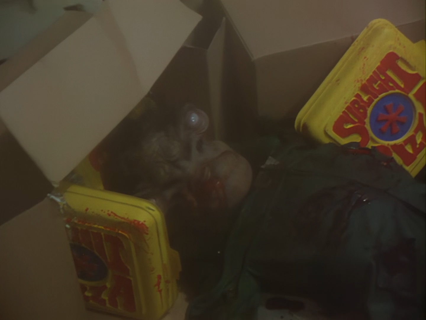 Someone screams, so a very ordinary looking gun comes out as Nissim makes his way back through a hideously decorated hallway to the apartment. Either someone’s brought a lot of unwanted ketchup to this pizza party or…