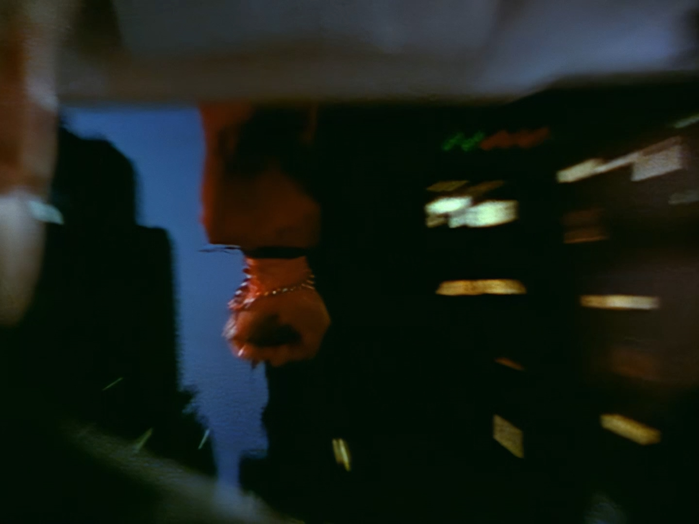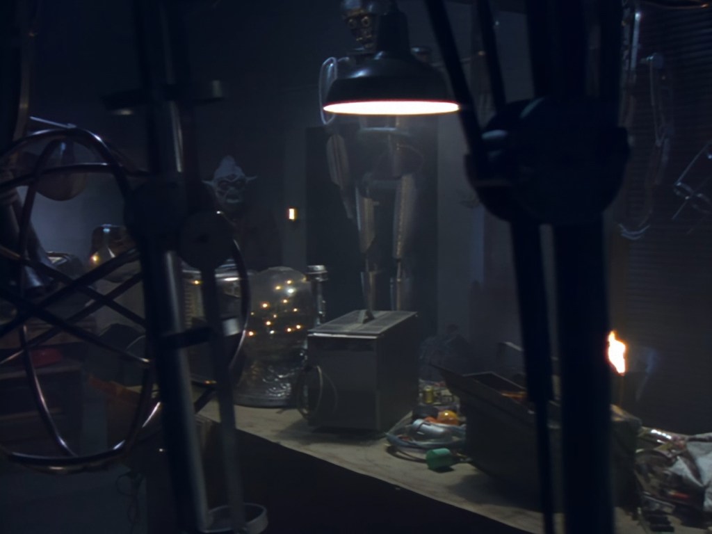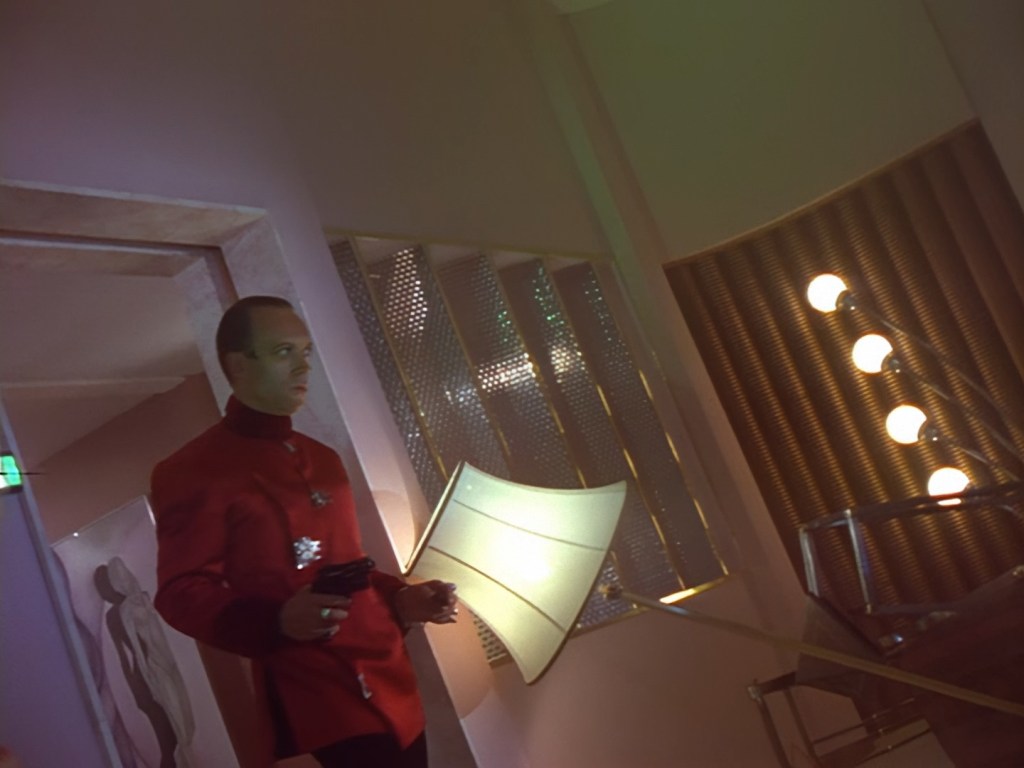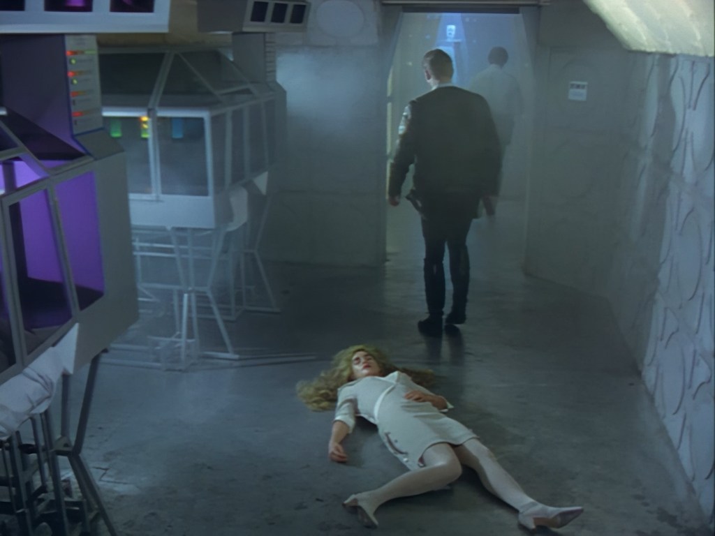 These night-time shots look great. Many of the interior day-time shots have suffered from stark, blanket lighting but here Alan Hume is able to use darkness and spots of colour in amongst the city smog to create a moody atmosphere. Let’s be honest, it also has the benefit of hiding Tony Curtis’ sparse set. Plus, Aleesha’s green hair and shiny make-up looks much more natural in low lighting.