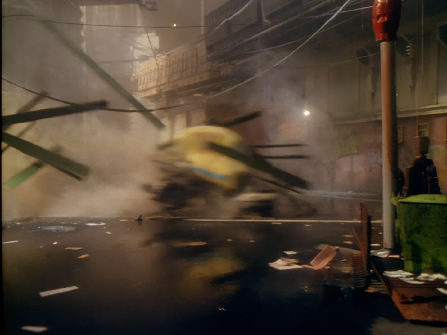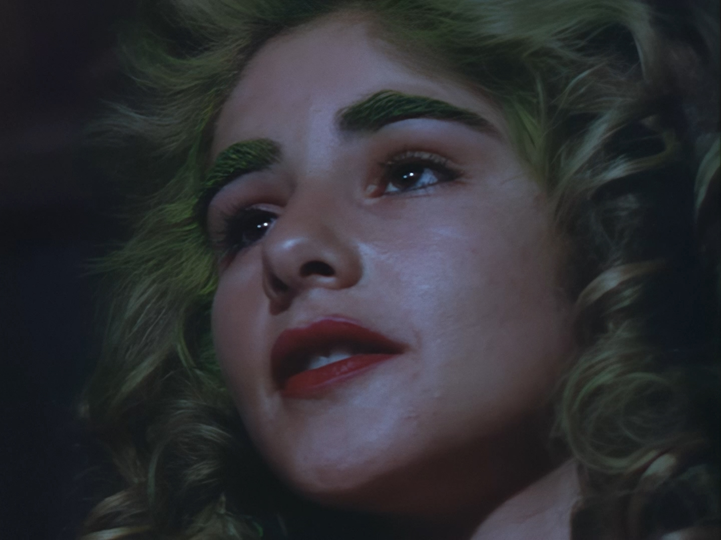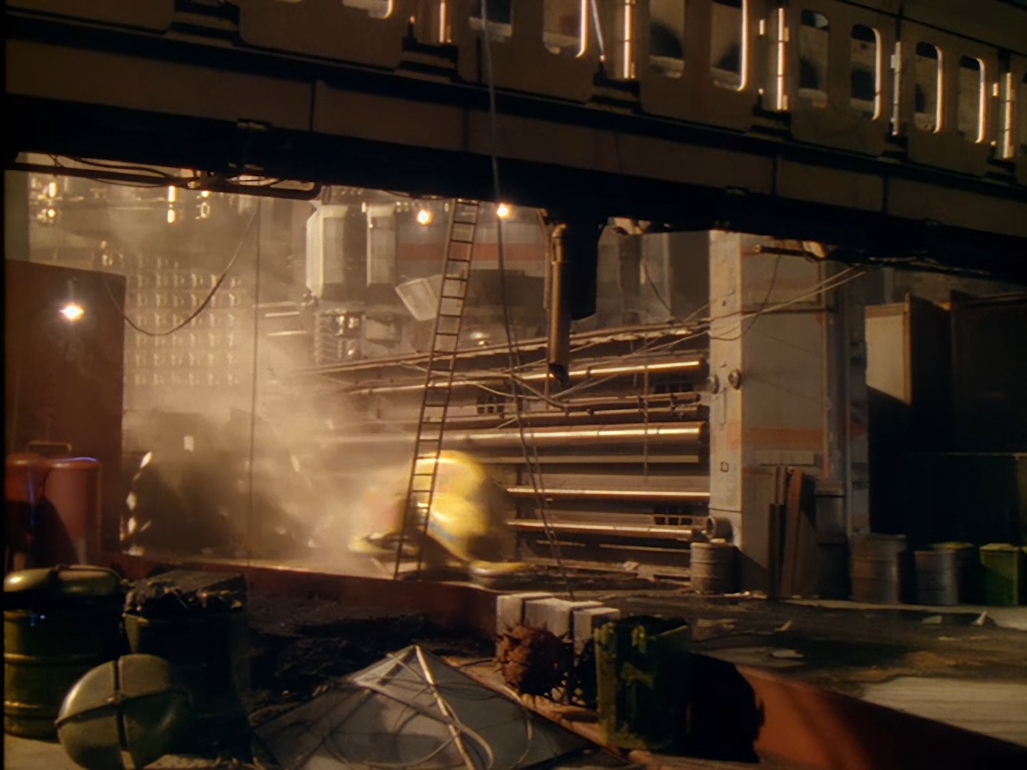 These night-time shots look great. Many of the interior day-time shots have suffered from stark, blanket lighting but here Alan Hume is able to use darkness and spots of colour in amongst the city smog to create a moody atmosphere. Let’s be honest, it also has the benefit of hiding Tony Curtis’ sparse set. Plus, Aleesha’s green hair and shiny make-up looks much more natural in low lighting.