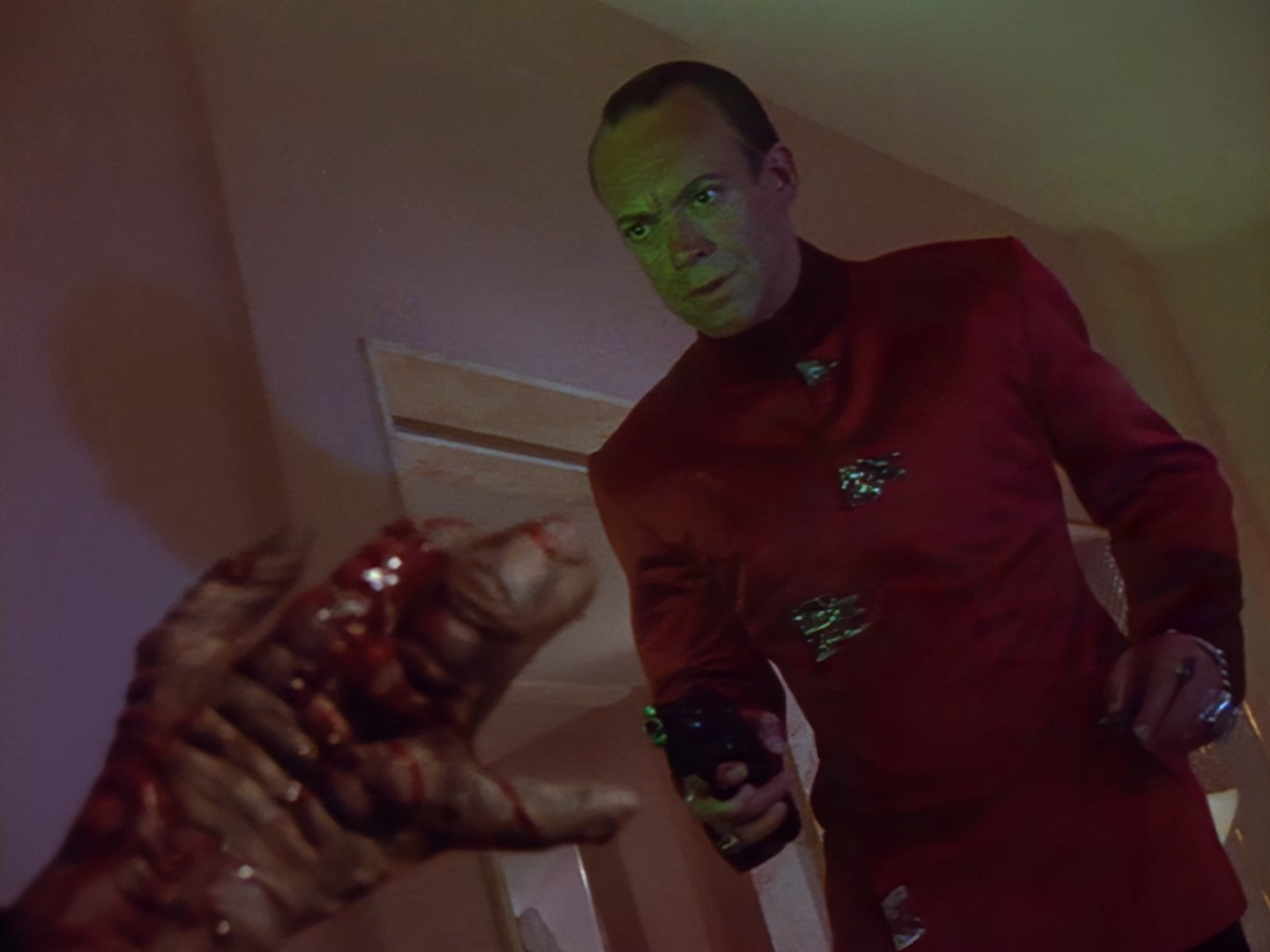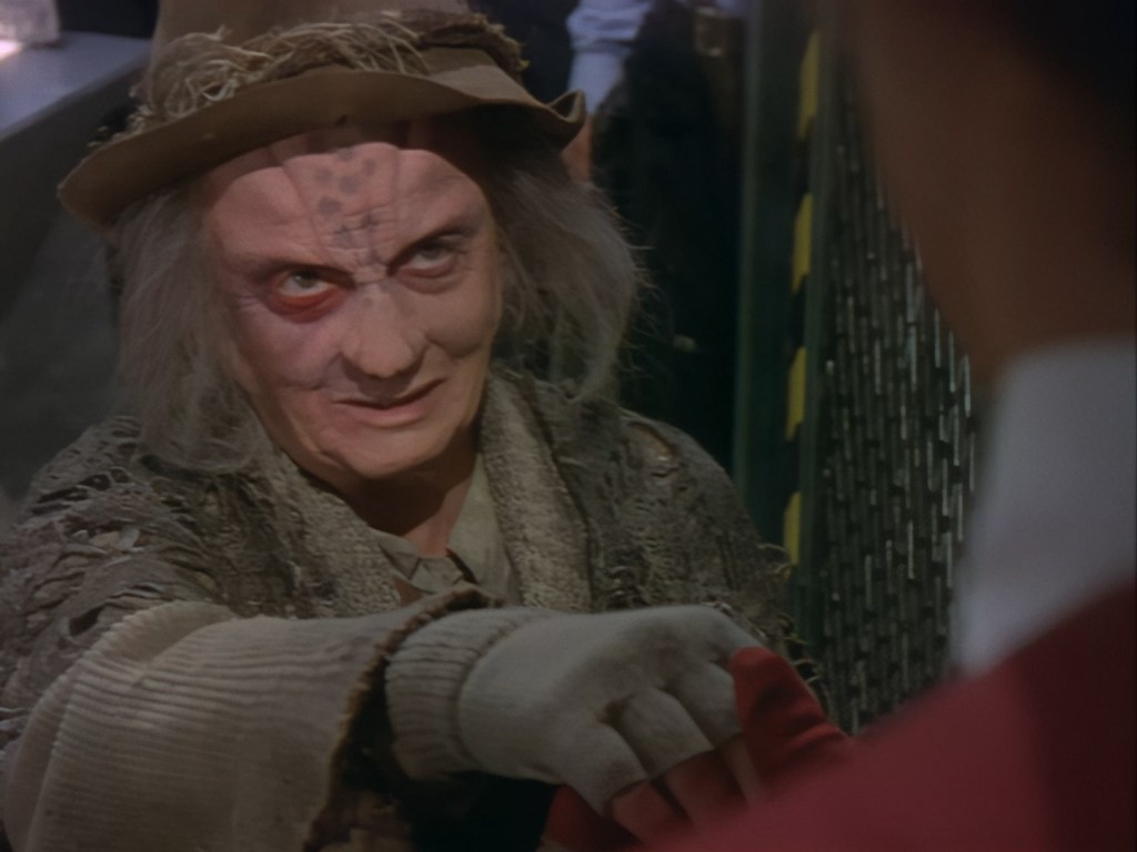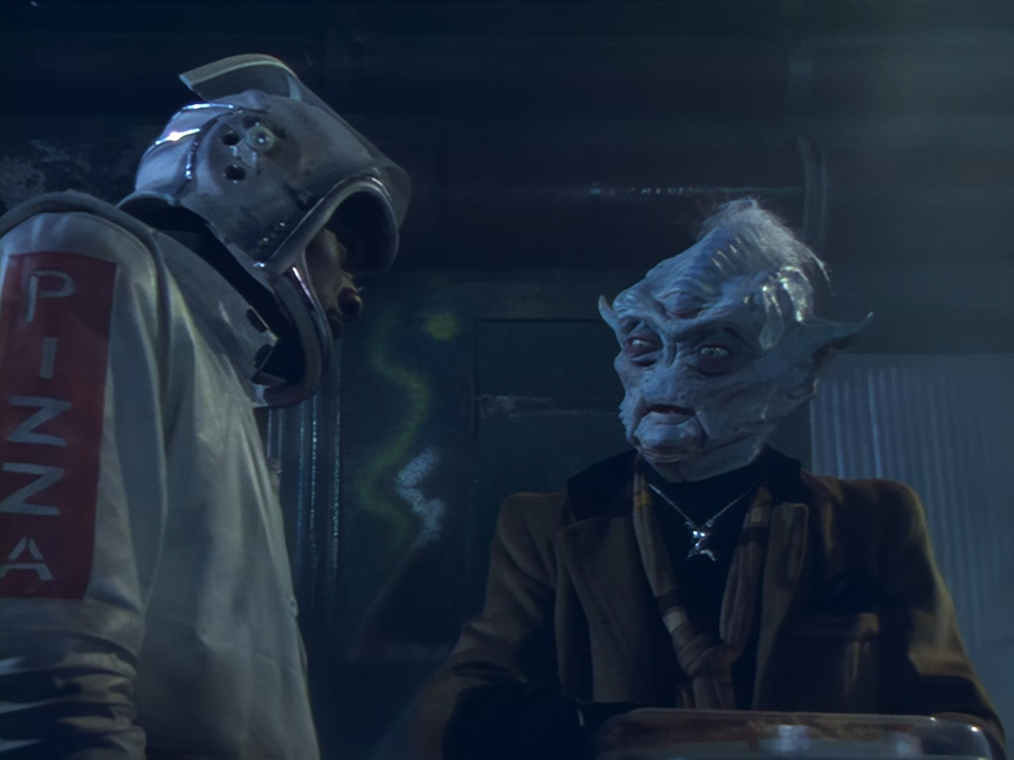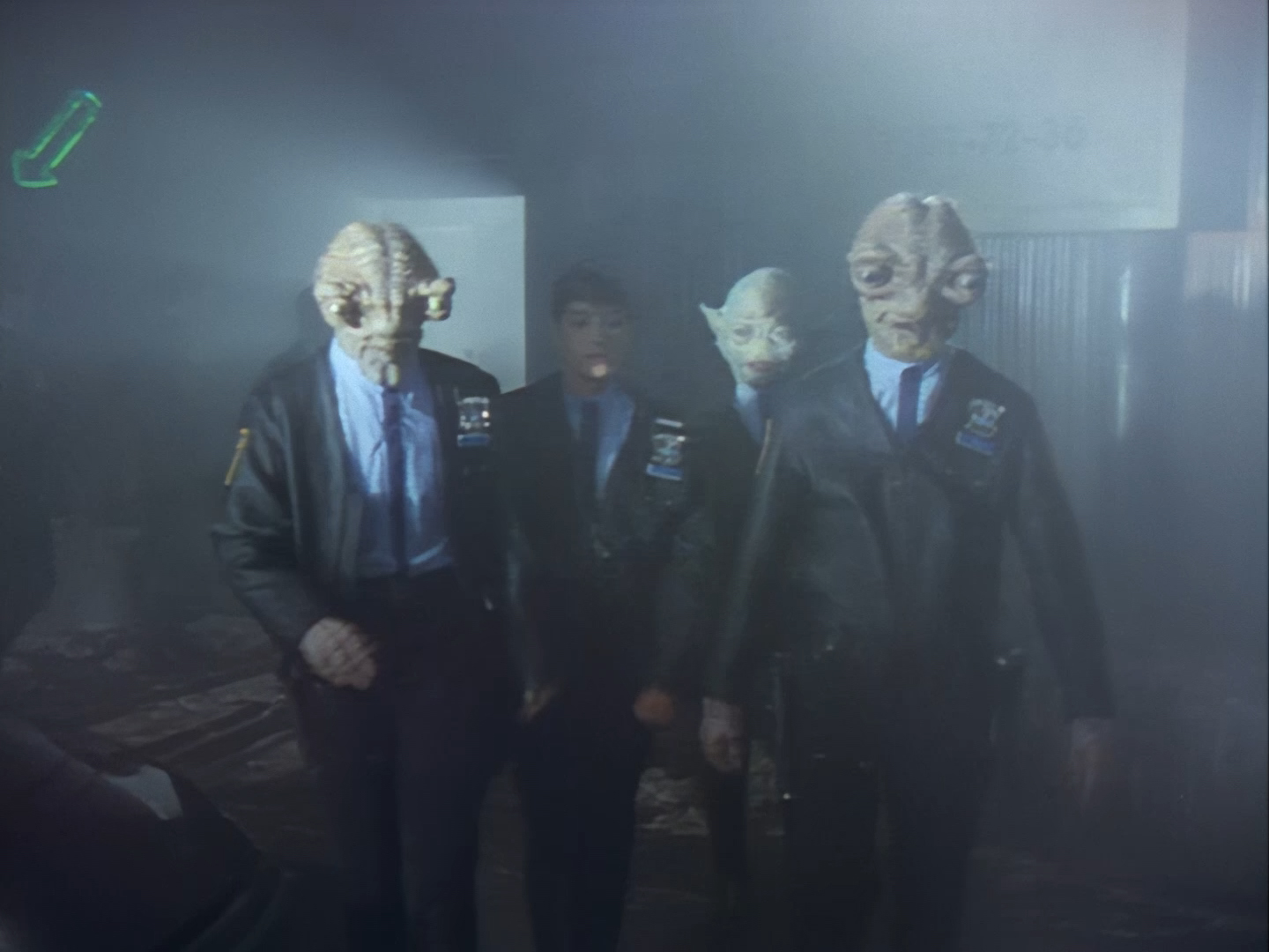 I get there’s only 45 minutes of screen time to squeeze this story into, and sometimes that requires some extremely over the top dialogue to get a point or a certain character trait across quickly. The writers and actors needed to communicate fairly efficiently that Nissim was an undesirable creep and that Aleesha is something of a trophy for him. But that doesn’t give you a free pass to wheel out every old cliché in the book! When you’re dealing with a beautiful green-haired alien and a suspected drug dealer backed up by two ugly cronies, I think you’ve checked more than enough cliché boxes for one scene!