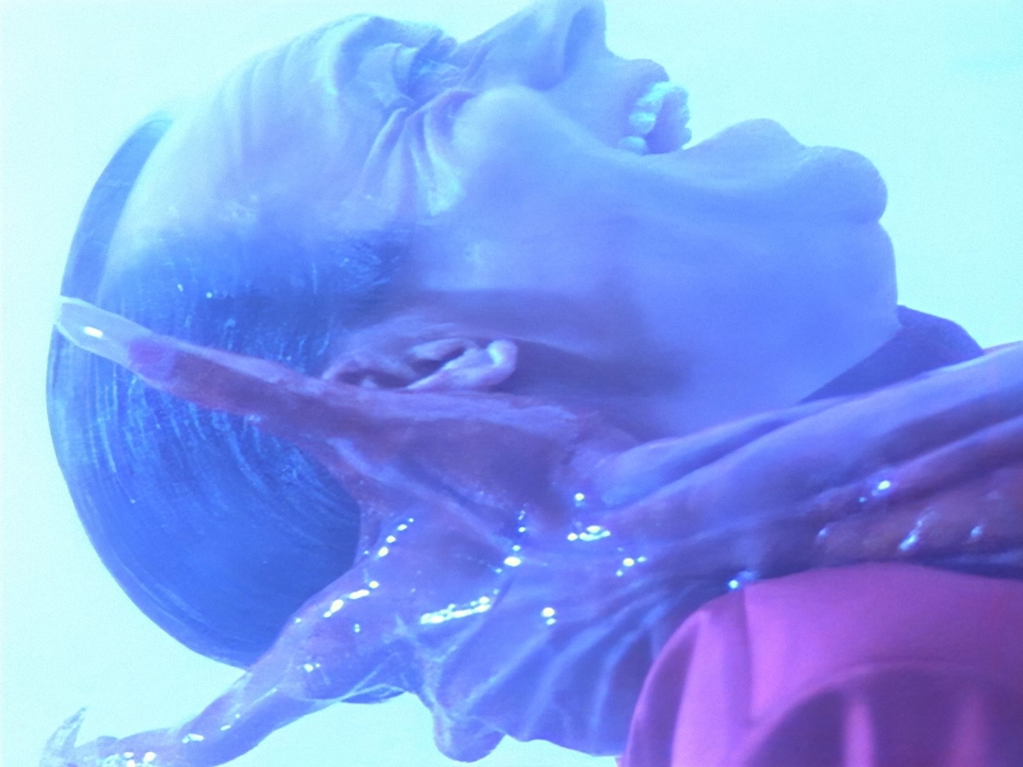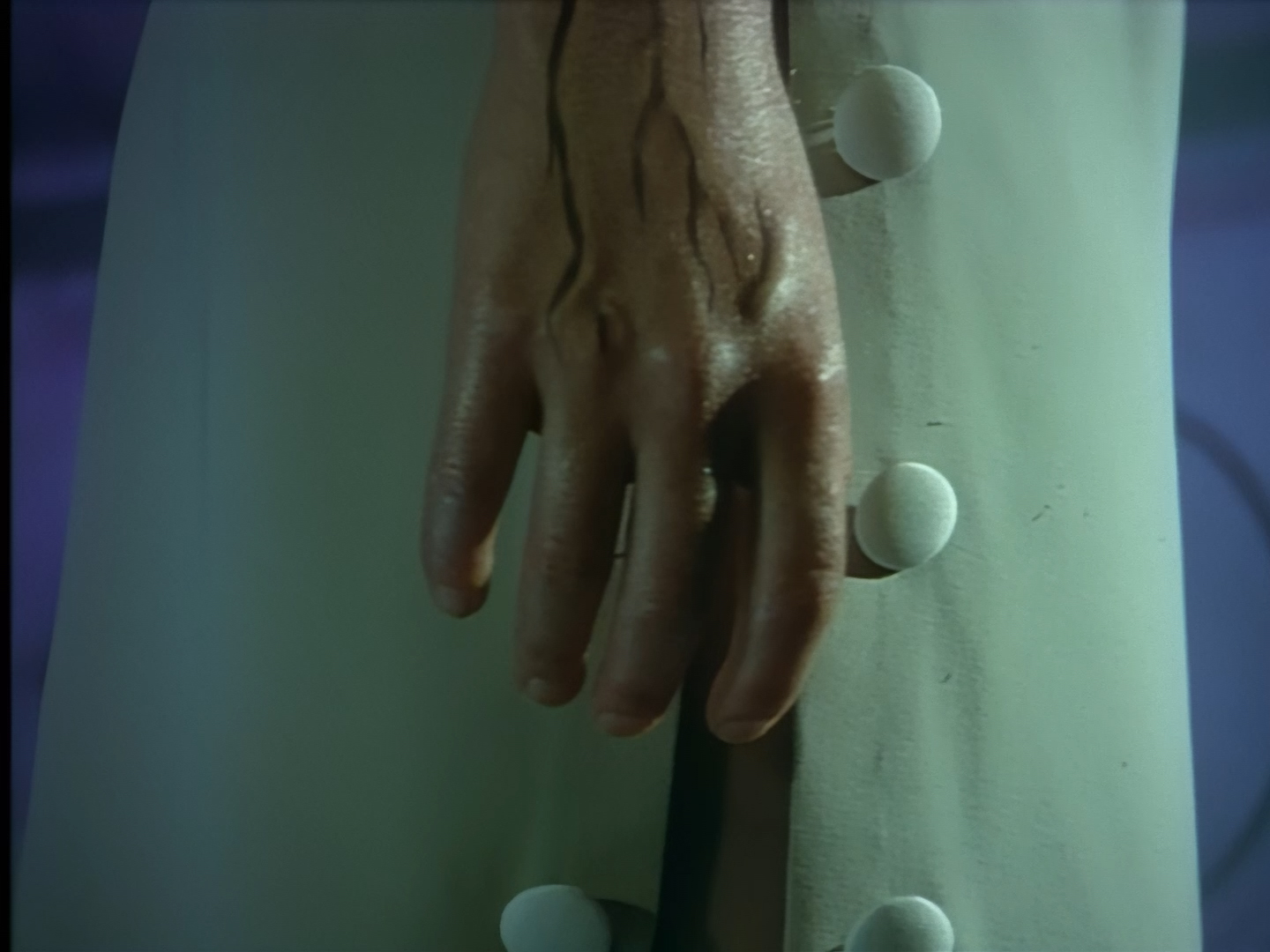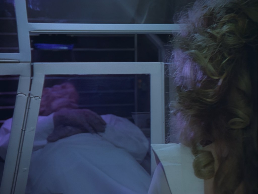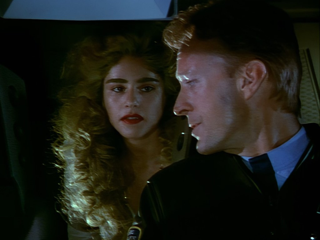 You might think that getting teary-eyed is a bit much considering Haldane barely knows this woman. But frankly that’s more of a fault with the script than Rob Youngblood’s performance. He’s committed to the utter nonsense he’s been given to perform and you’ve got to admire him for that. Likewise, Lana Citron is working hard too, albeit it’s much harder to tell because of the dubbing. The effect of the pulsing alien veins on her hands is really nicely done I must say.