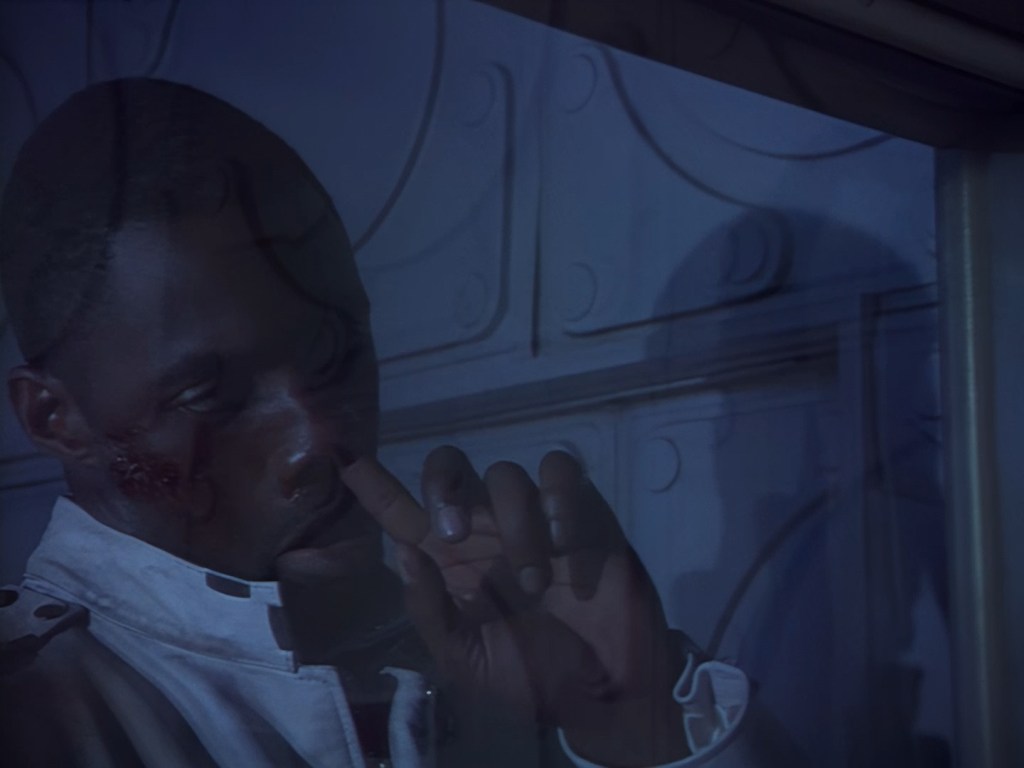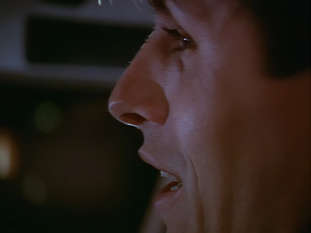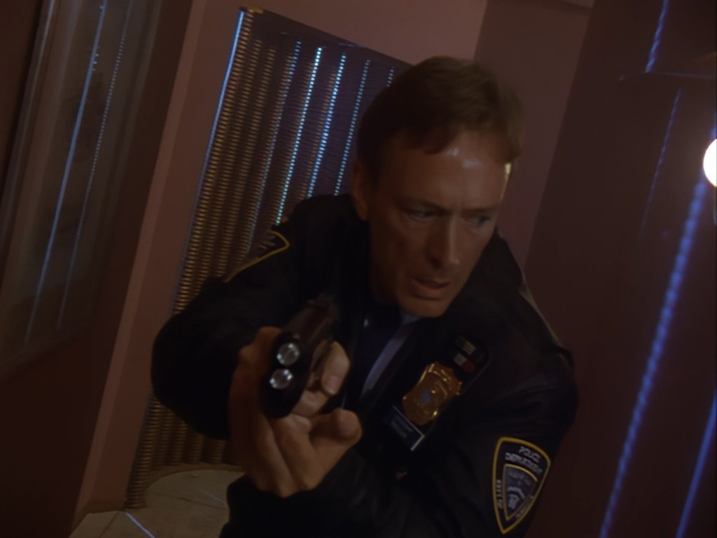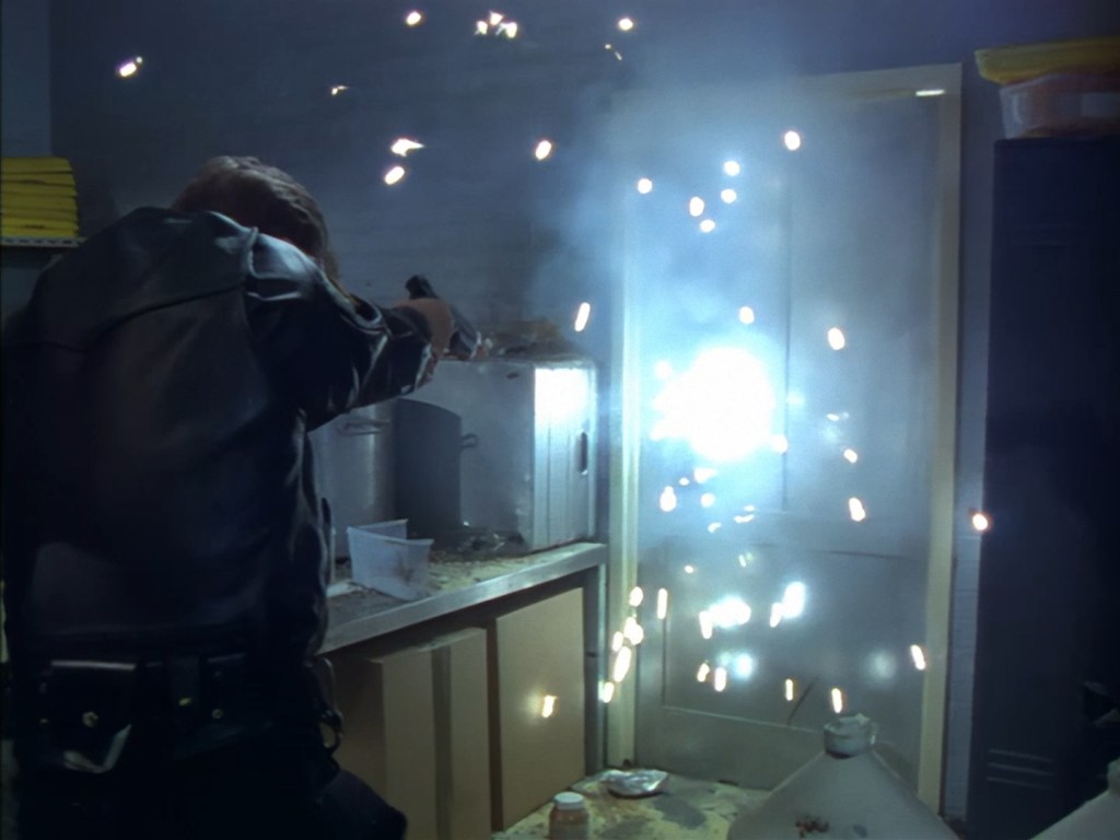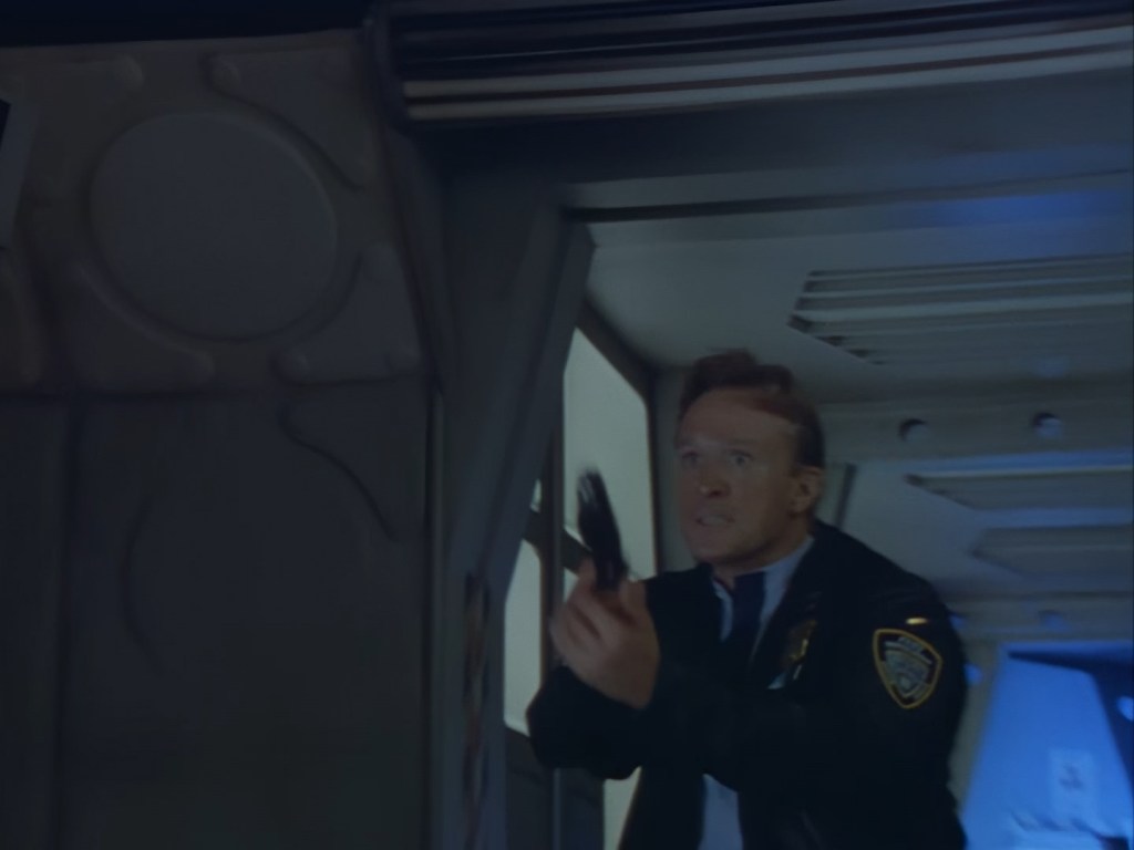 On Podly’s order, Brogan and Haldane are doing that thing again of cautiously holding their guns out and searching the corridors for the perp. These are some darn cool shots as Alan Hume has some fun with the lighting. Of course, Brogan can’t hold back a little bit of snark when Podly points out that the killer is extremely dangerous, but otherwise the officers seem to be taking things very seriously.