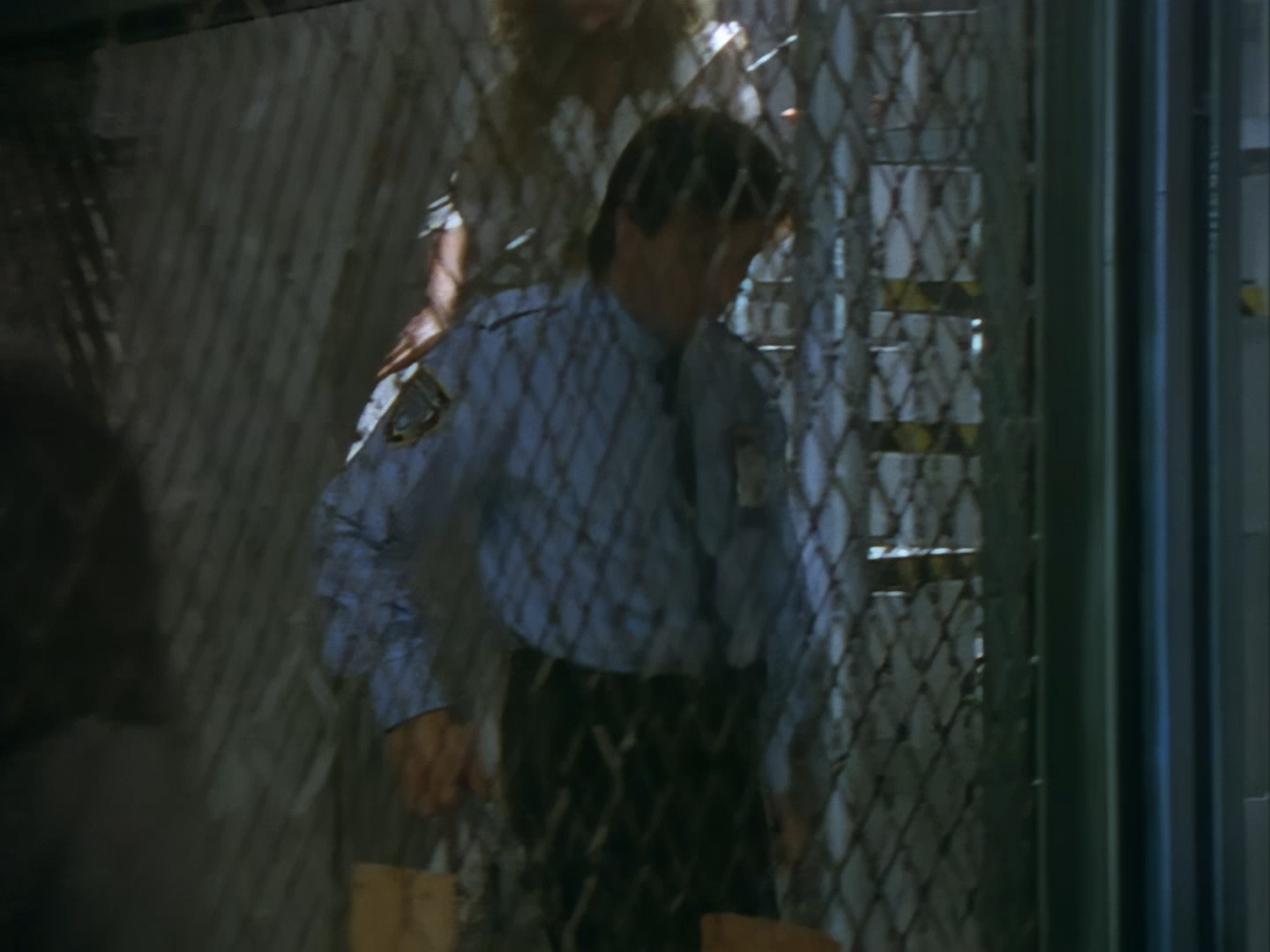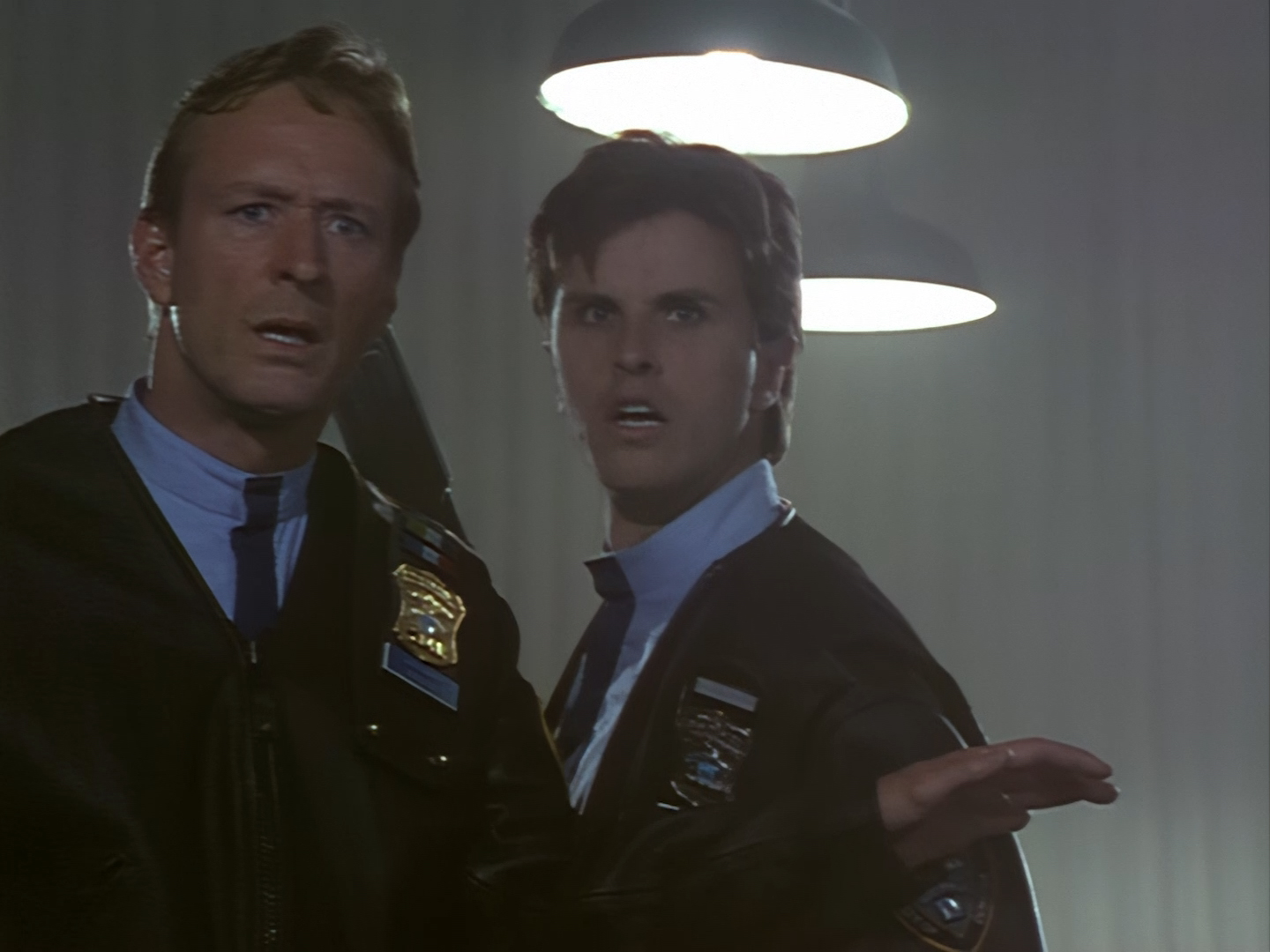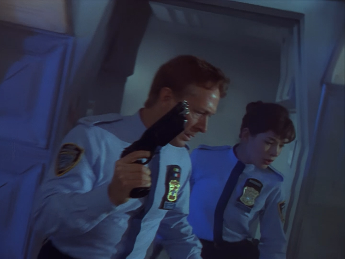 On Podly’s order, Brogan and Haldane are doing that thing again of cautiously holding their guns out and searching the corridors for the perp. These are some darn cool shots as Alan Hume has some fun with the lighting. Of course, Brogan can’t hold back a little bit of snark when Podly points out that the killer is extremely dangerous, but otherwise the officers seem to be taking things very seriously.