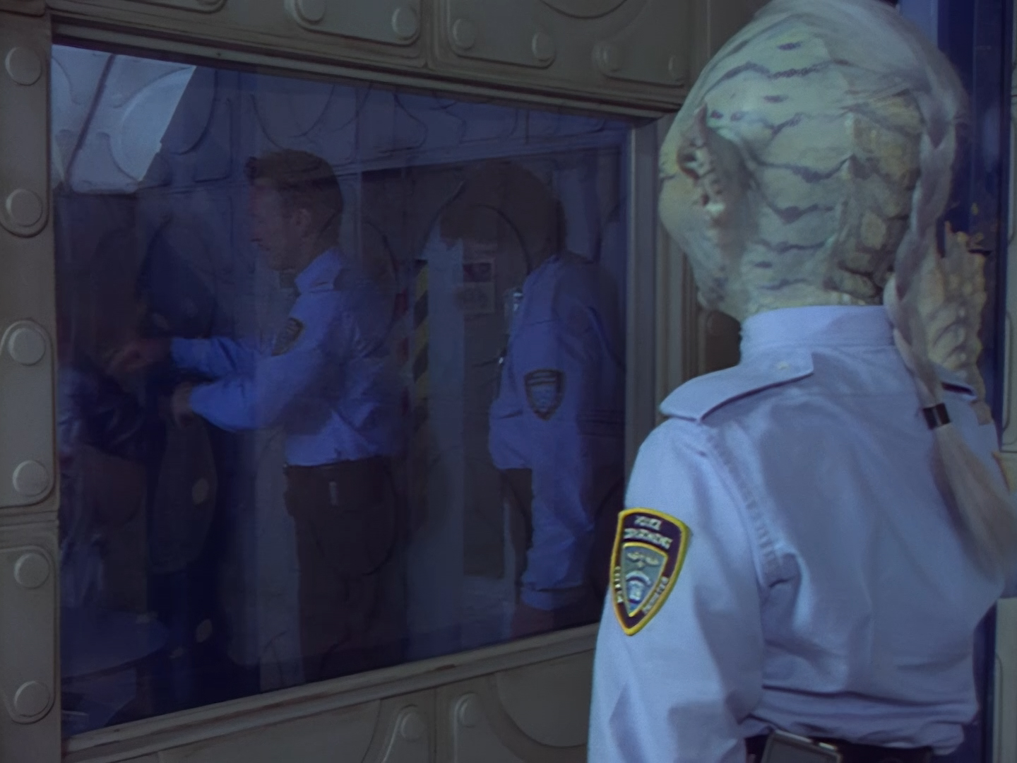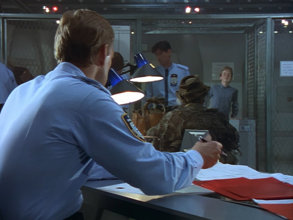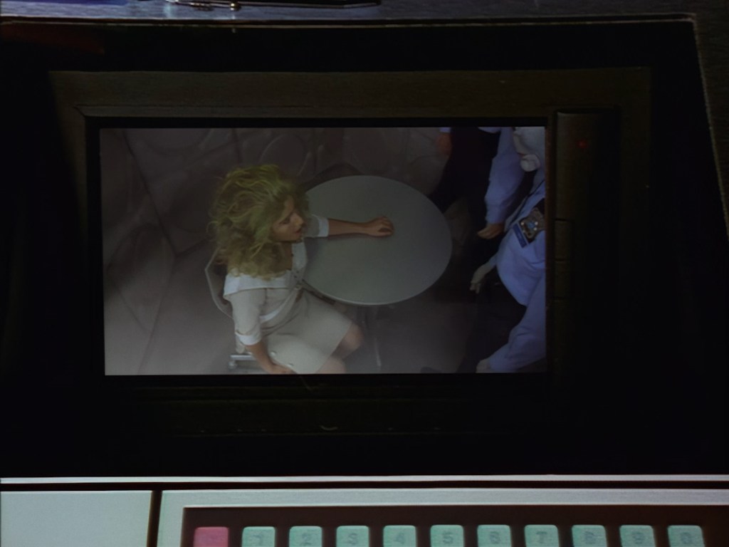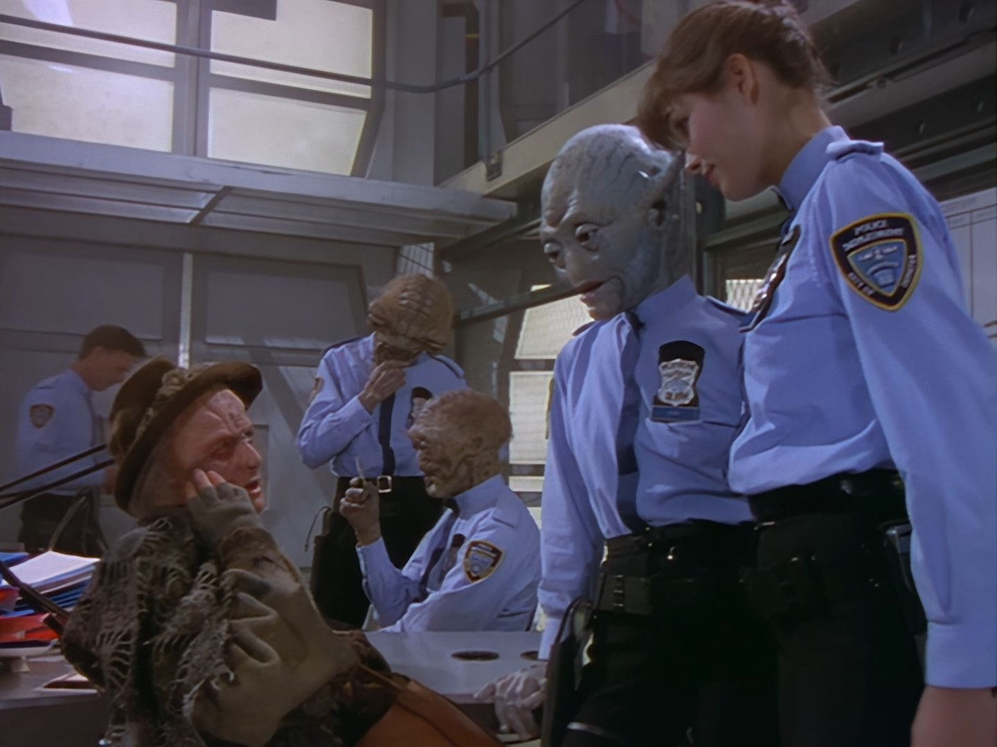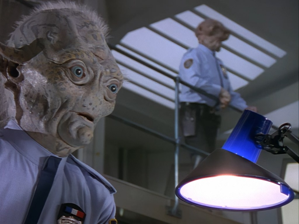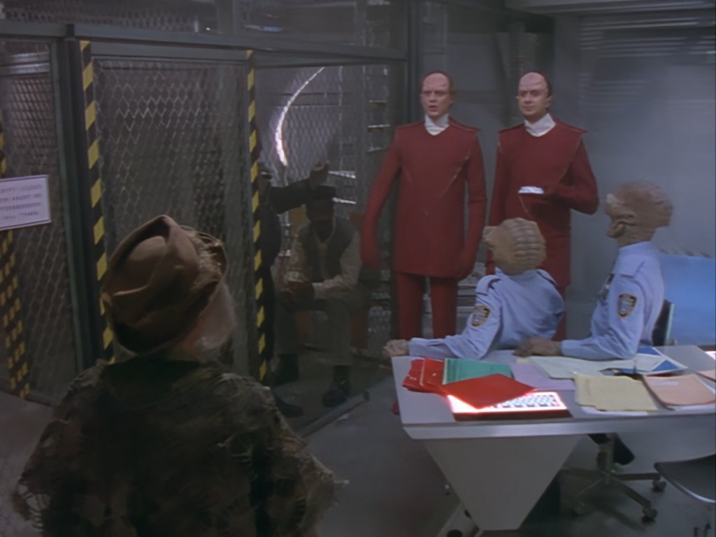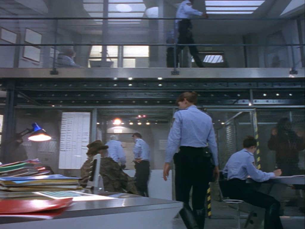 The interior set of the station house is a magnificent two-tier structure – a feat which I have to praise set designer Tony Curtis for despite my snippiness about his work on Nissim’s apartment earlier. You can tell that directors loved finding interesting ways of establishing this room and finding all sorts of business for the actors to be doing across the two levels. And of course, we get to enjoy the eclectic mix of Tarn, Creon, and human officers going about their police duties.