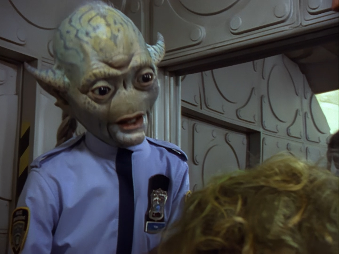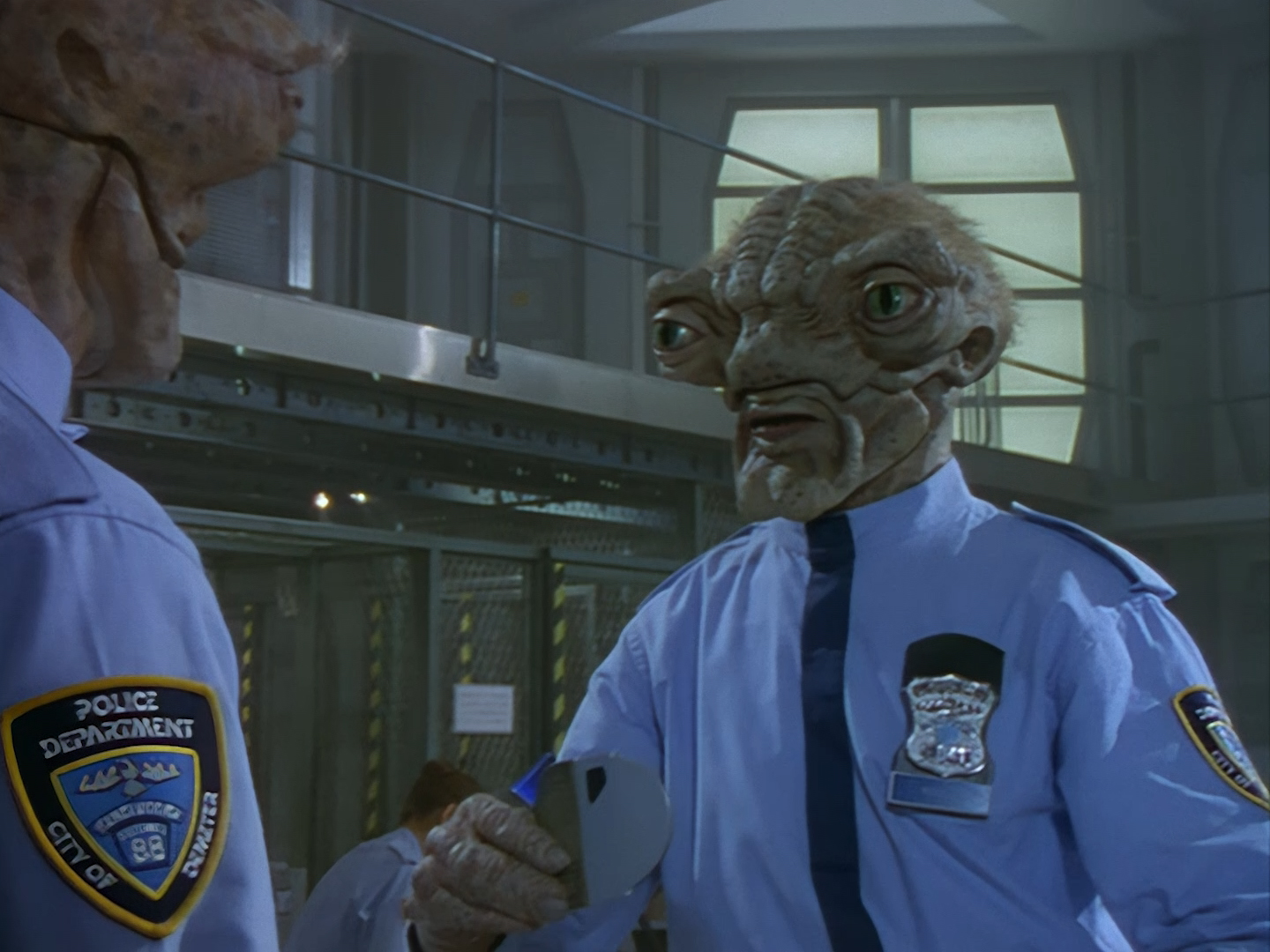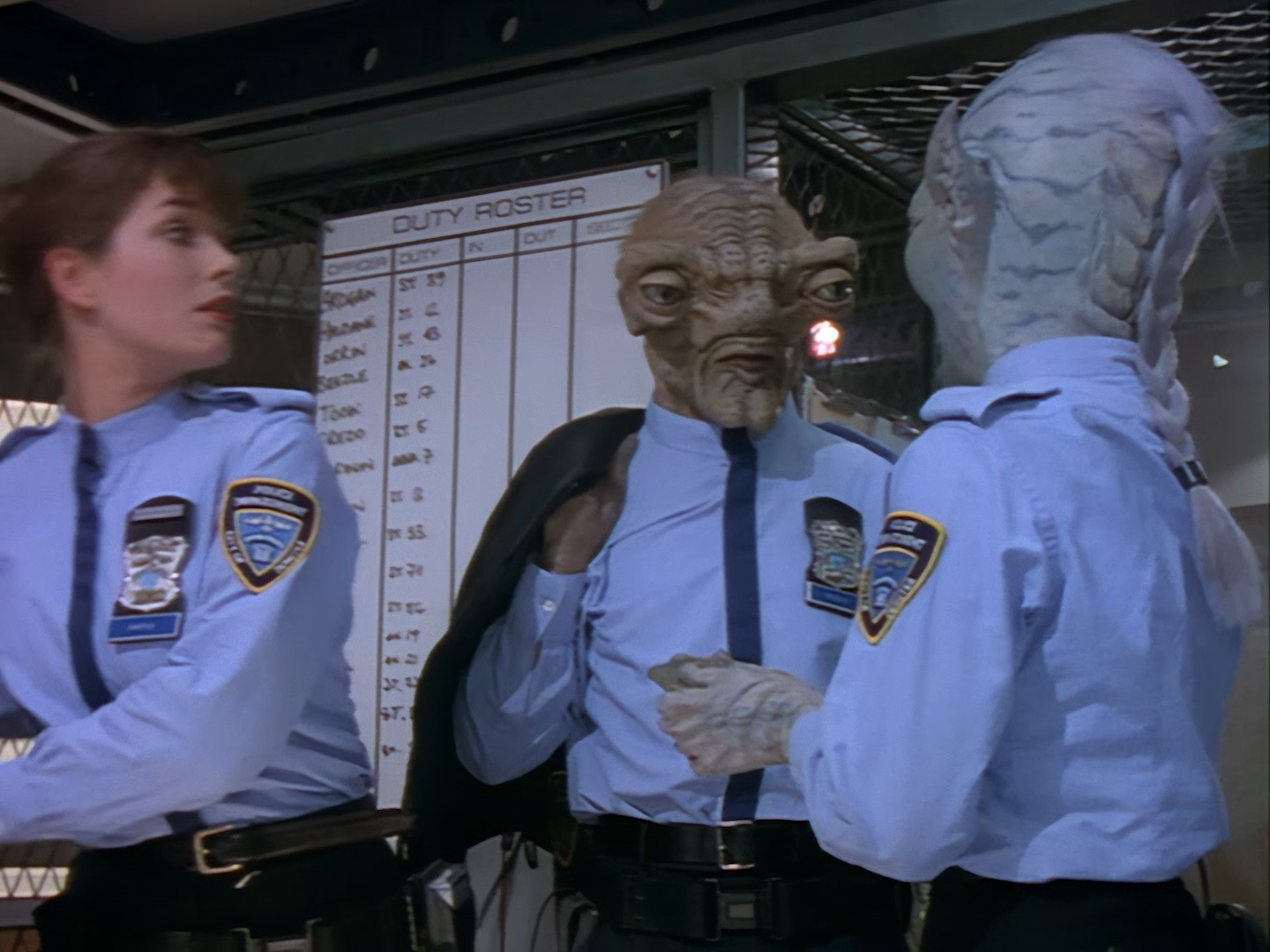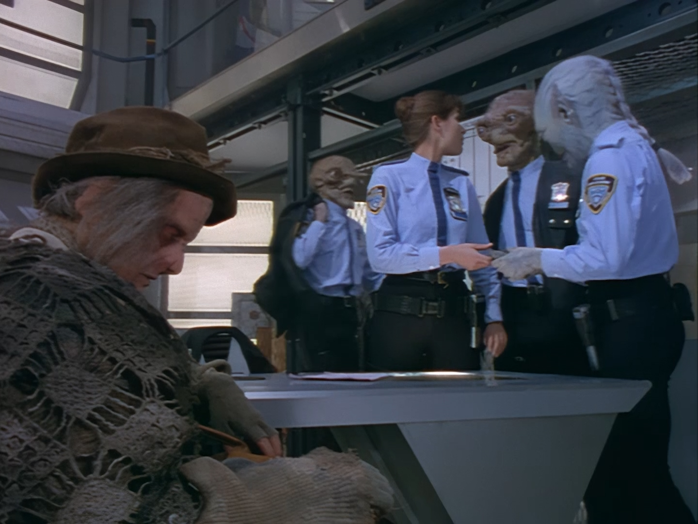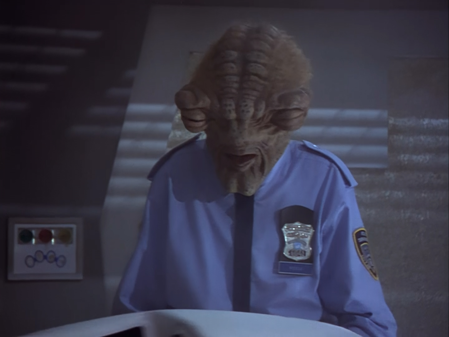 The interior set of the station house is a magnificent two-tier structure – a feat which I have to praise set designer Tony Curtis for despite my snippiness about his work on Nissim’s apartment earlier. You can tell that directors loved finding interesting ways of establishing this room and finding all sorts of business for the actors to be doing across the two levels. And of course, we get to enjoy the eclectic mix of Tarn, Creon, and human officers going about their police duties.